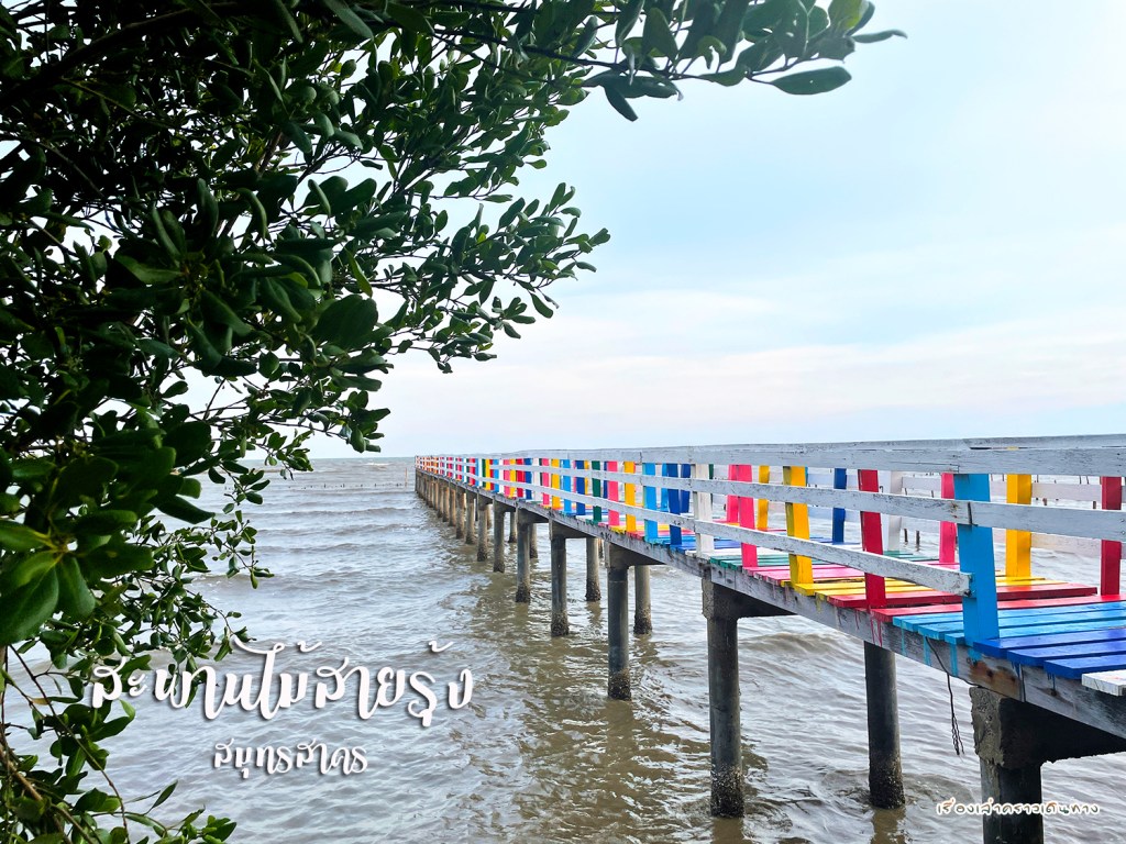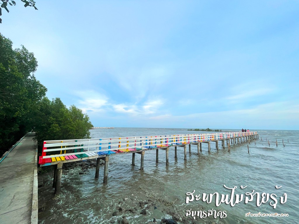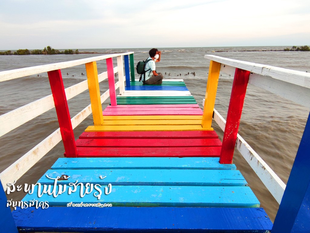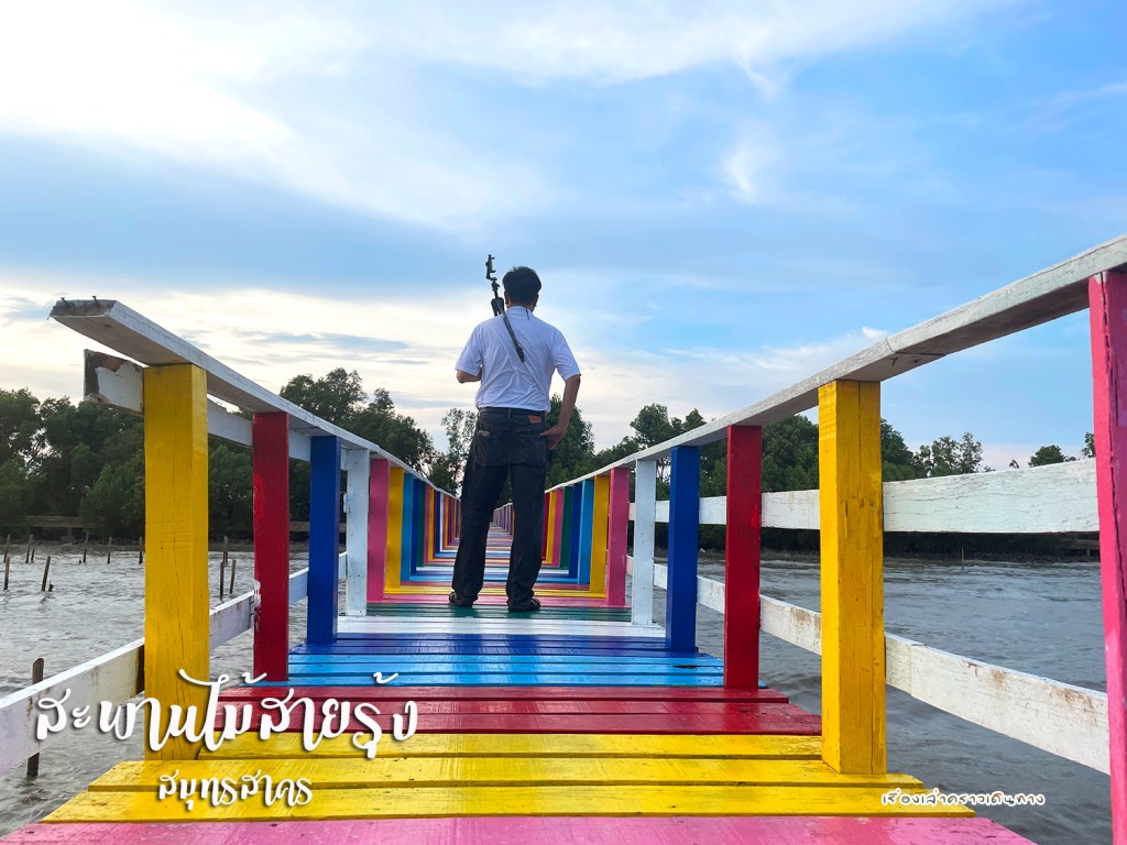 จากนั้นขับรถต่อไปตามป้ายบอกทาง เลี้ยวไปไม่ไกลมาก แต่สุดปลายทางไม่มีที่จอดรถ ต้องจอดที่ของชาวบ้าน ซึ่งมีค่าจอดนิดๆหน่อยๆ จากสุดทางถนนเป็นทางเดินชมป่าชายเลน เป็นทางปูนอย่างดี ให้เดินเข้าไป จะเจอสะพานไม้สีลูกกวาดสมชื่อสะพานสายรุ้ง เดินไปจนสุดปลายสะพานสายรุ้งได้ แต่ระวังหน่อย เพราะพื้นสะพานผุพังบางส่วน เลยจากสะพานสายรุ้งไปก็ยังเดินเล่นชมป่าโกงกางไปได้อีก
