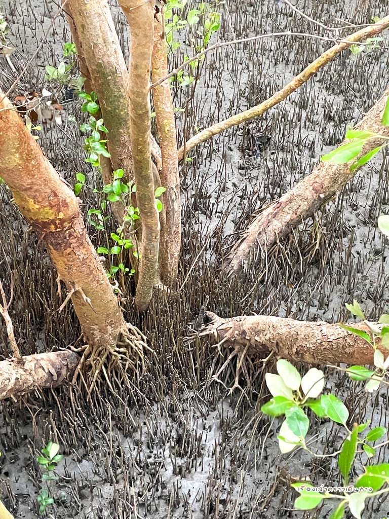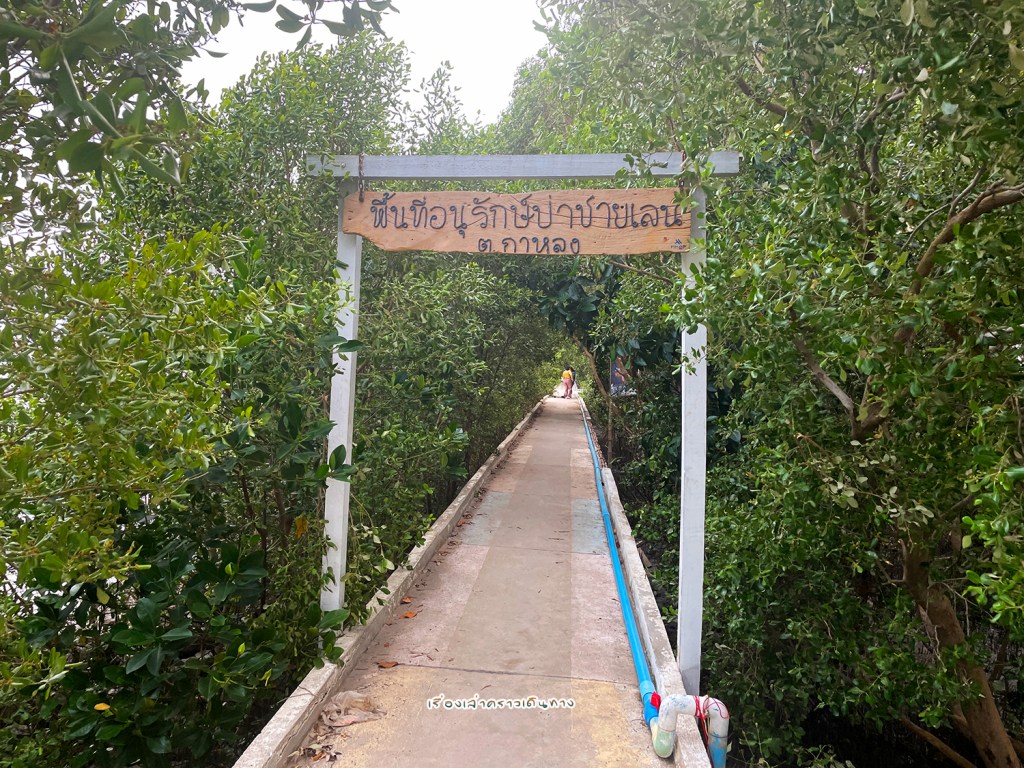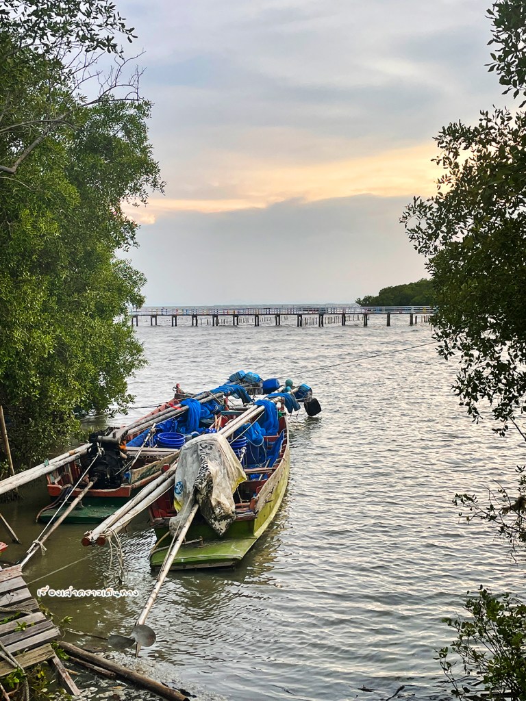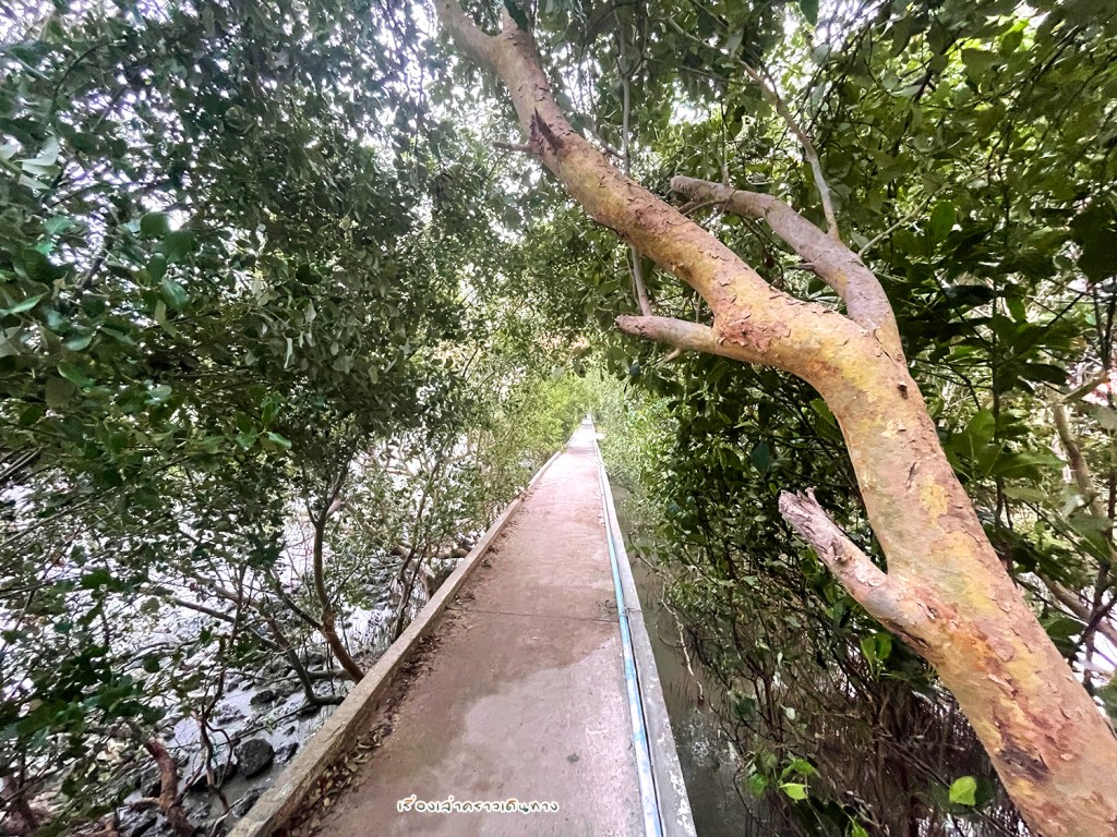 จากนั้นขับรถต่อไปตามป้ายบอกทาง เลี้ยวไปไม่ไกลมาก แต่สุดปลายทางไม่มีที่จอดรถ ต้องจอดที่ของชาวบ้าน ซึ่งมีค่าจอดนิดๆหน่อยๆ จากสุดทางถนนเป็นทางเดินชมป่าชายเลน เป็นทางปูนอย่างดี ให้เดินเข้าไป จะเจอสะพานไม้สีลูกกวาดสมชื่อสะพานสายรุ้ง เดินไปจนสุดปลายสะพานสายรุ้งได้ แต่ระวังหน่อย เพราะพื้นสะพานผุพังบางส่วน เลยจากสะพานสายรุ้งไปก็ยังเดินเล่นชมป่าโกงกางไปได้อีก