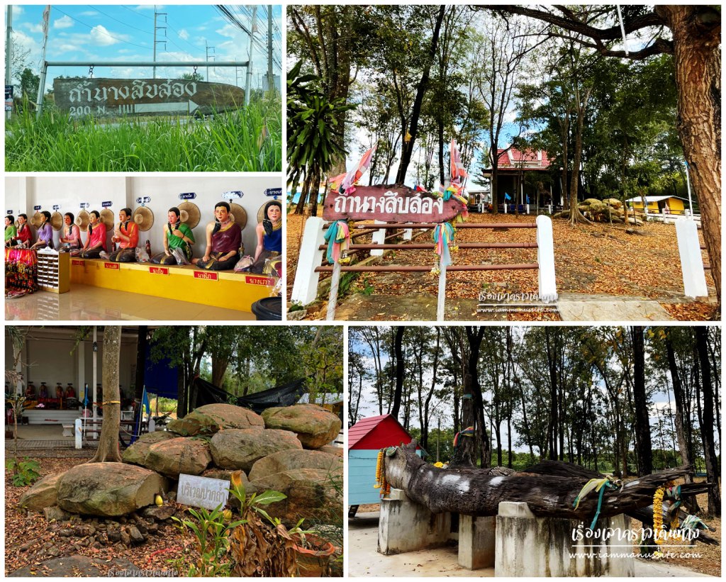 มีการสร้างศาลอยู่บ้านหมอนนาง อ.พนัสนิคม มีรูปปั้นนางสิบสอง นั่งเรียงรายในศาลาข้างศาล แล้วยังมีโขดหินที่เชื่อกันว่า ข้างใต้ก้อนหินเป็นปากถ้ำของนางสิบสองด้วยนะ คนเก่าคนแก่บอกว่าสมัยก่อนมีหิน 12 ก้อน เชื่อกันว่าเคยเป็นหมอนของนางสิบสอง แต่เพราะสมัยก่อนไม่มีคนสนใจ ก็เลยหายไปหมด มีเหลือเก็บอยู่ที่วัดก้อนเดียว (แต่ไม่ได้ตามไปดูนะ) นอกจากนั้นก็มีท่อนไม้ตะเคียนท่อนใหญ่อยู่ข้างศาล ตรงนี้น่าจะได้รับความนิยมสูงสุด เห็นมีพวงมาลัยแขวนเต็มเลย
