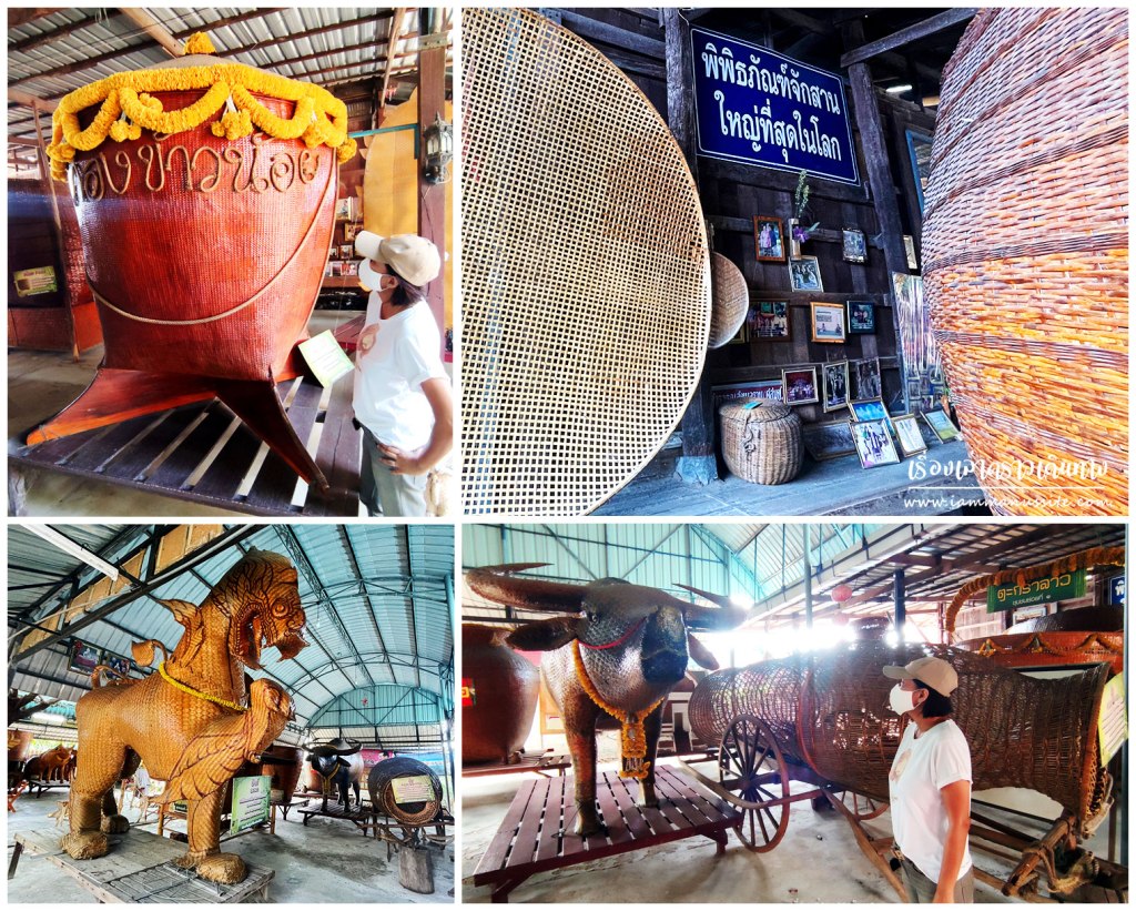 เริ่มจาก จักสานใหญ่ที่สุดในโลก มันคืออะไร ขับรถเข้าไปตามป้ายบอกทาง ตลาดจักสาน จนมาเห็นป้ายผ้าใบใหญ่ยักษ์ว่า จักสานใหญ่ที่สุดในโลกอยู่ตรงนี้ ก็เข้าไปดู ที่นี่คือ “ศูนย์จักสานใหญ่ที่สุดในโลก” และ “ร้านจักสานคุณปราณี” เสียค่าเข้าชม 10 บาท! ด้านในมีส่วนขายเครื่องจักสาน กับส่วนจัดแสดงเครื่องจักสานใหญ่ที่สุดในโลก มีชื่อเป็นทางการว่า “ศูนย์วัฒนธรรมเฉลิมราช เฉลิมพระเกียรติ ๘๔ พรรษา” มันก็ต้องใหญ่สุดในโลกแหละ เพราะไม่น่ามีใครทำจักสานเหมือนเมืองไทย ฮา… เข้าไปเดินดูแล้ว มันก็ใหญ่จริงนะ เขาสานทุกอย่างออกมาขนาดใหญ่กว่าของจริงหลายเท่า ส่วนมากเป็นการจำลองอุปกรณ์ที่เป็นจักสานอยู่แล้ว อย่าง กระจาด กระด้ง กระบุง แล้วก็มีการสานเป็นรูปจำลองอื่นๆ อย่าง ครุฑ ควาย วัว รถลาก เรือแจว เครื่องฝัดข้าว สวยงามดี คุ้มค่าเกินกว่า 10 บาทที่จ่ายไป