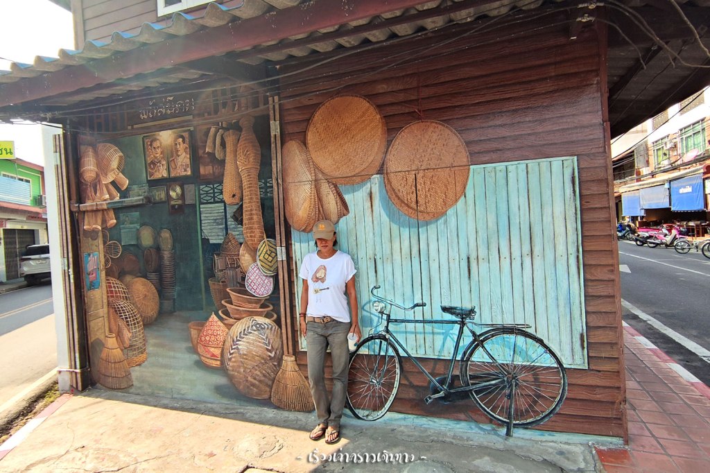 จากเครื่องจักสานใหญ่ยักษ์ ก็มาเดินเล่น ถนนสระตราง ดูเครื่องจักสานขนาดปกติกันต่อ น่าจะเรียกว่าถนนจักสาน เพราะเป็นถนนที่มีร้านขายเรื่องจักสานหลายร้านอยู่ติดๆกัน เดินเลือกซื้องานฝีมือคุณภาพดีๆราคาไม่แพงได้ บ้านและร้านค้าตลอดถนนมีทั้งเรือนไม้เก่าผสมกับอาคารสร้างใหม่ ใครชอบดูบ้านไม้เก่าๆน่าจะชอบถนนนี้