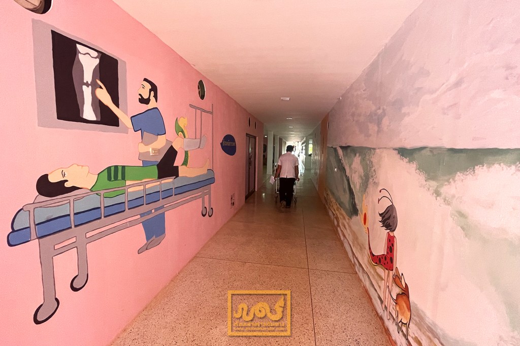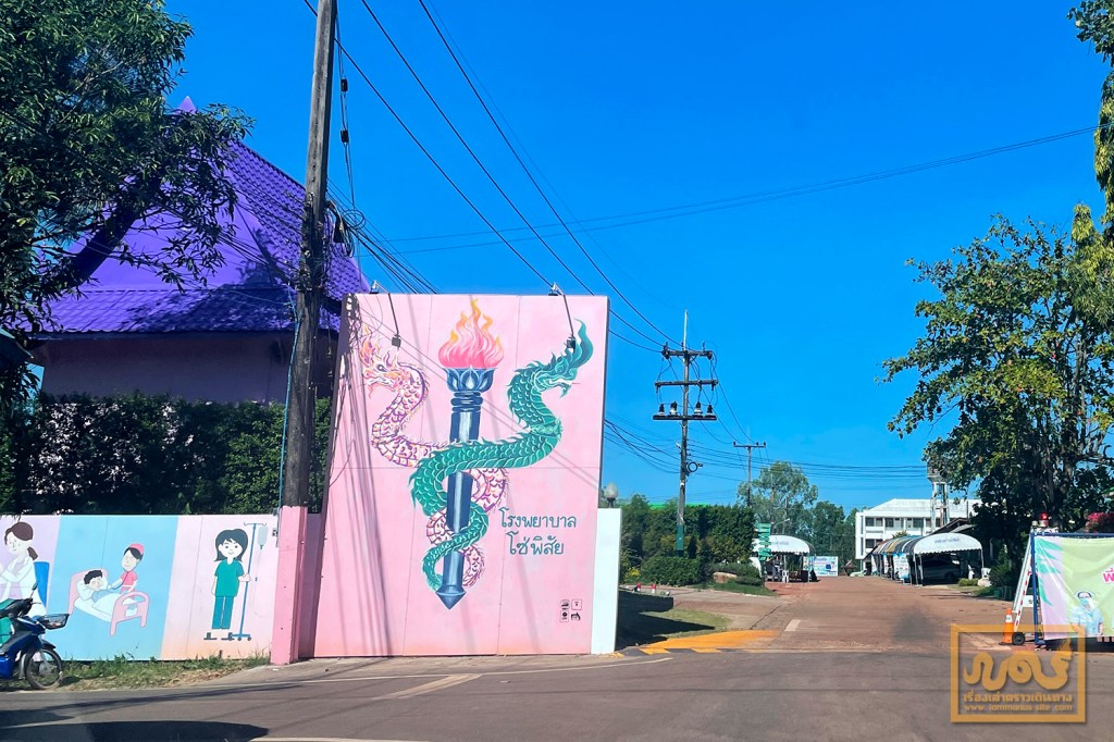 ก่อนจะจากหมู่บ้าน คุณขาบแนะนำว่าให้ไปแวะ โรงพยาบาลโซ่พิสัย และอย่าลืมถามหาผอ.รพ.ด้วย เพราะ ”เป็นคนพรรค์เดียวกับผม” แต่เราไม่มีเวลามากและเกรงใจ แต่ได้แวะไปที่รพ.ตามคำแนะนำ รพ.ประจำอำเภอ ขนาดเล็ก ตัวตึกค่อนข้างเก่าเหมือนรพ.ตามตำบล หรือ อำเภอทั่วไป แต่ปรับปรุงทาสีใหม่เอี่ยม ตกแต่งด้วยศิลปะต่างๆ สวยงามน่ารัก Graffiti บนผนังตามแผนกต่างๆ ผูกโยงกับพญานาคตามความเชื่อ ทำให้การมาโรงพยาบาลที่มีแต่ความทุกข์พอให้ได้ลืมความเจ็บป่วยและอมยิ้มได้บ้าง
