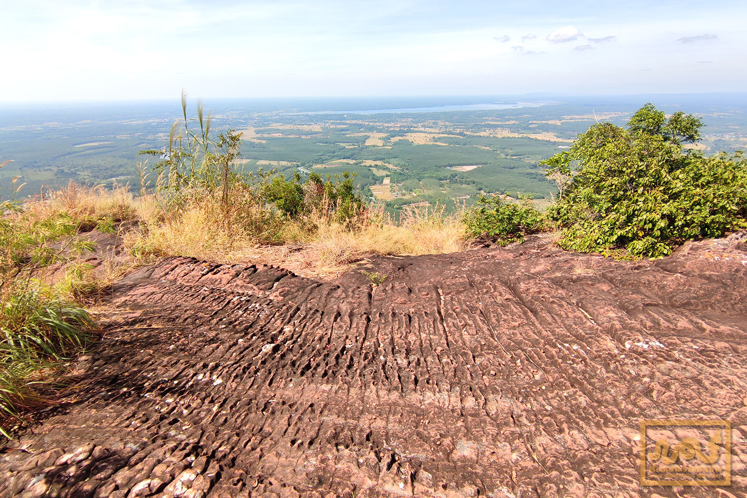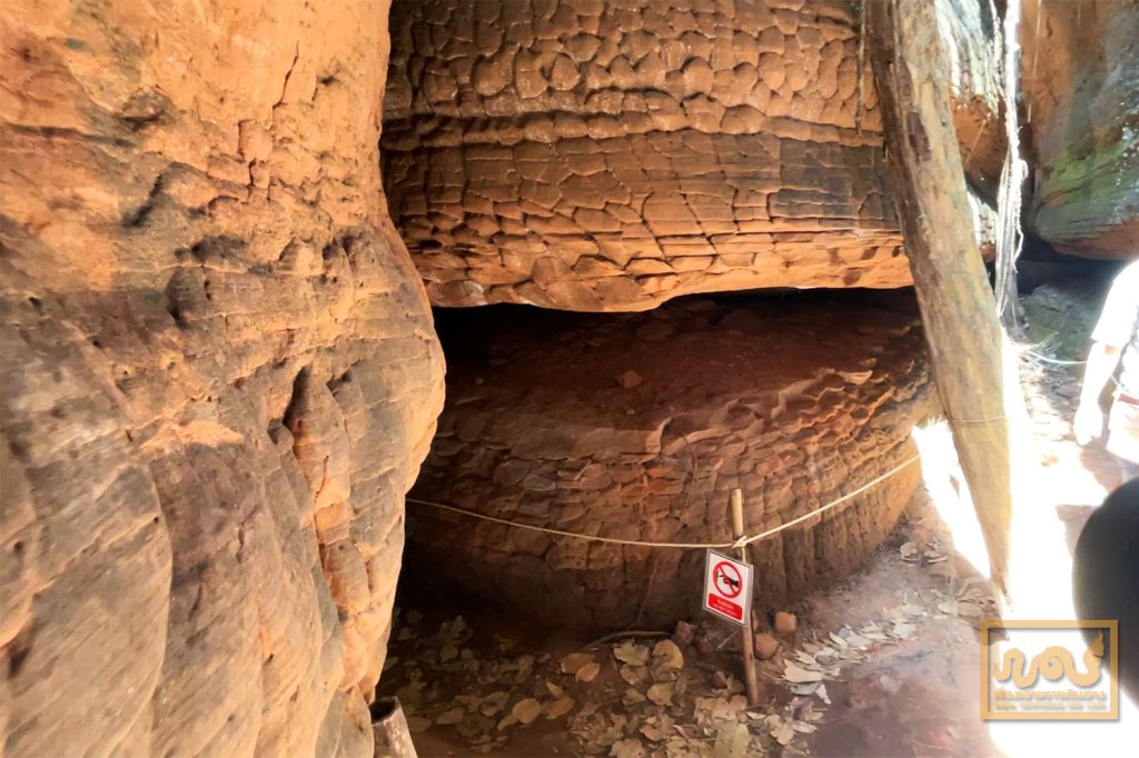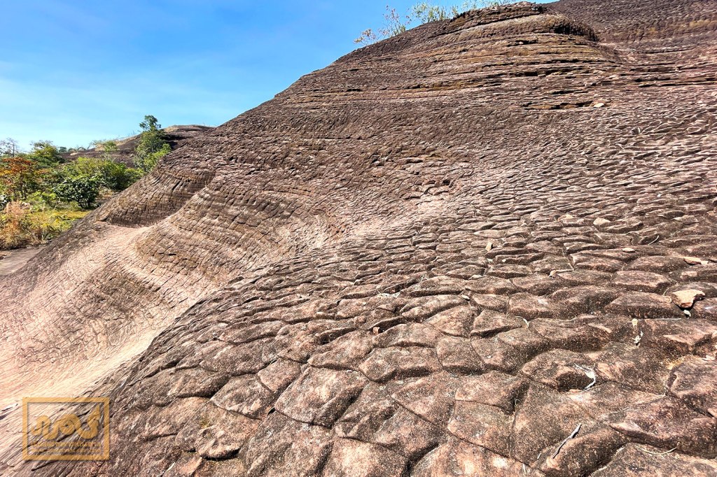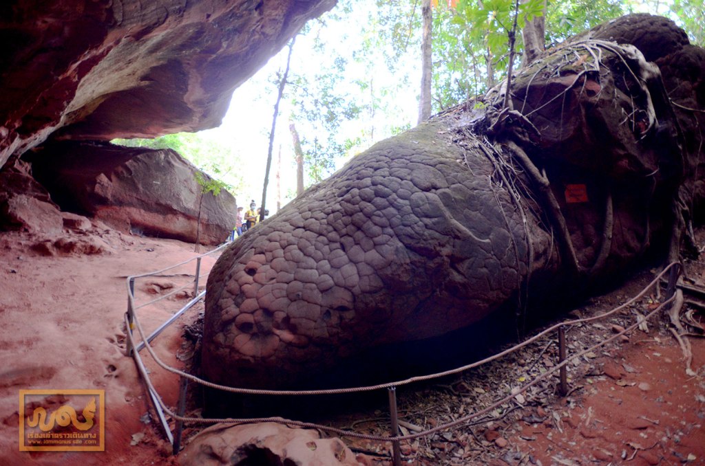 พื้นผิวที่เรียกกันว่า “หินเกล็ดพญานาค” เนื่องจากลักษณะเป็นรอยเหลี่ยมสม่ำเสมอตลอดทั่วบนพื้นผิวเหมือนเกล็ดงูขนาดใหญ่ ในทางธรณีวิทยาเรียกว่าปรากฏการณ์ “ซันแครก”(Suncrack) เกิดจากการแตกของผิวหน้าหินทรายจากการเปลี่ยนแปลงอุณหภูมิที่แตกต่างกันมาก ระหว่างช่วงกลางวันและกลางคืนอย่างรวดเร็ว ทำให้หินเกิดการขยายตัวและหดตัวสลับไปมา หินทรายที่เกิดจากเม็ดทรายขนาดใกล้เคียงกันเมื่อเวลาแตกก็จะมีรูปแบบของการแตกเป็นหลายเหลี่ยมอย่างมีระเบียบเท่ากันตลอด จึงมองดูเหมือนเกล็ดงูดังที่เห็น โดยหินเกล็ดพญานาคที่พบมีอายุประมาณ ๑ แสนปี | ที่มา: อนุสาร อสท. กันยายน 2563