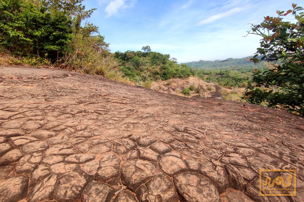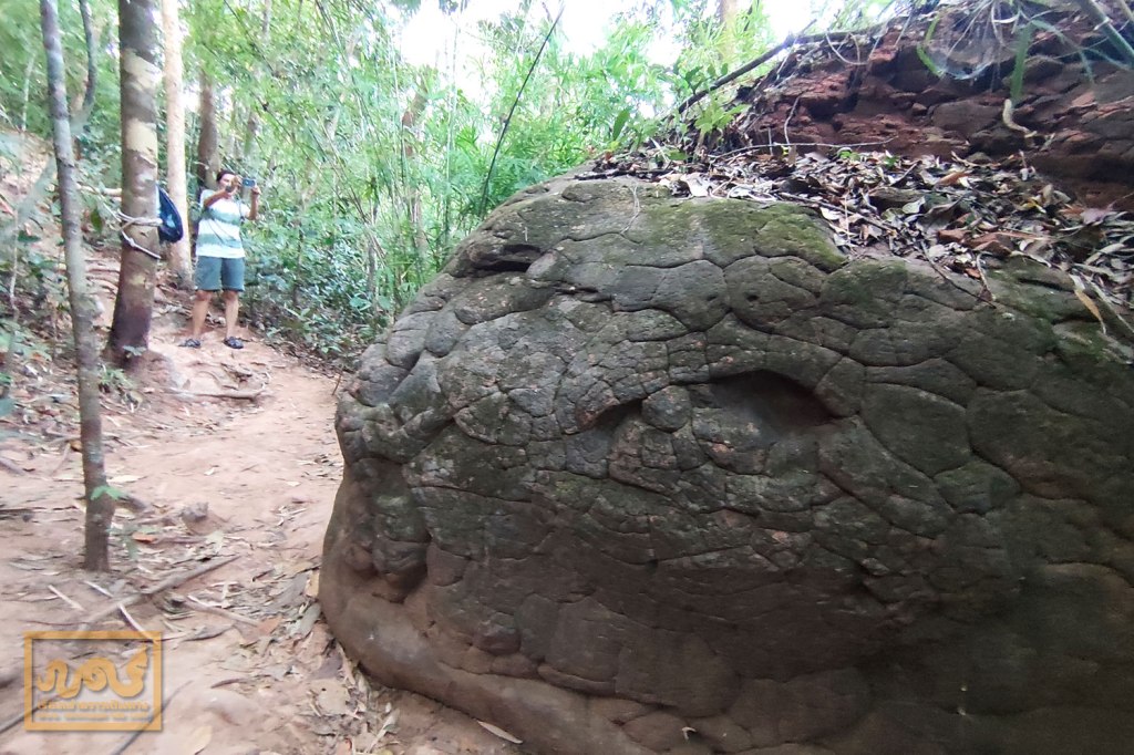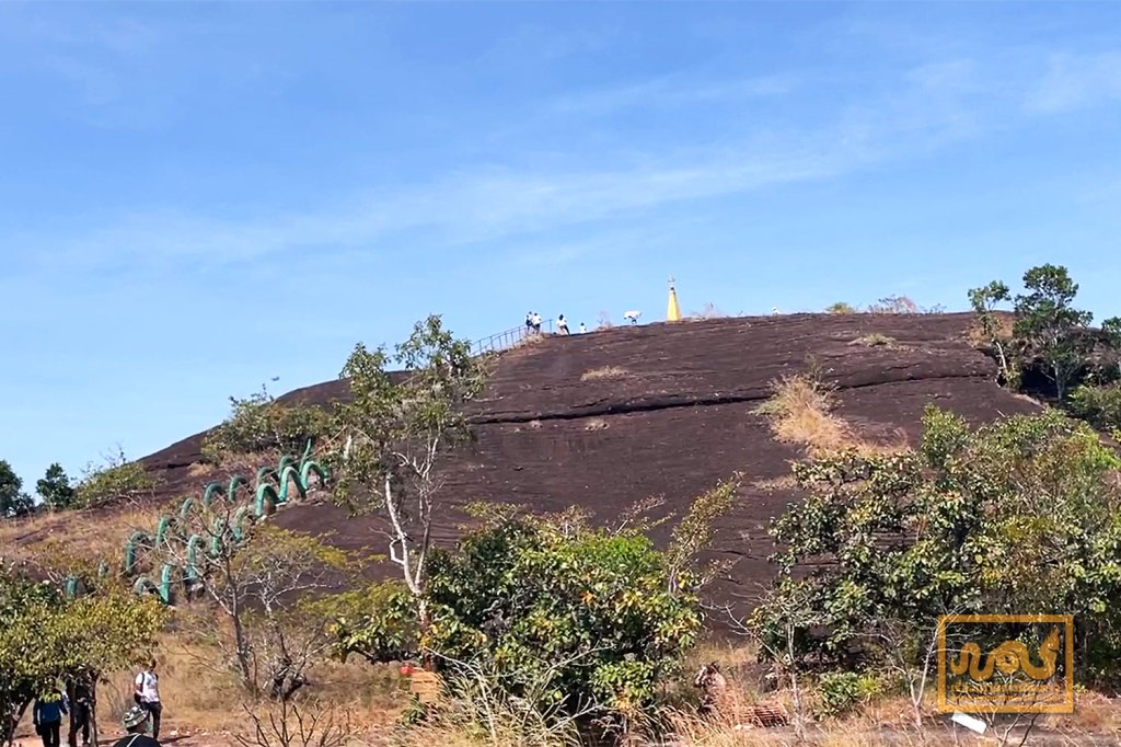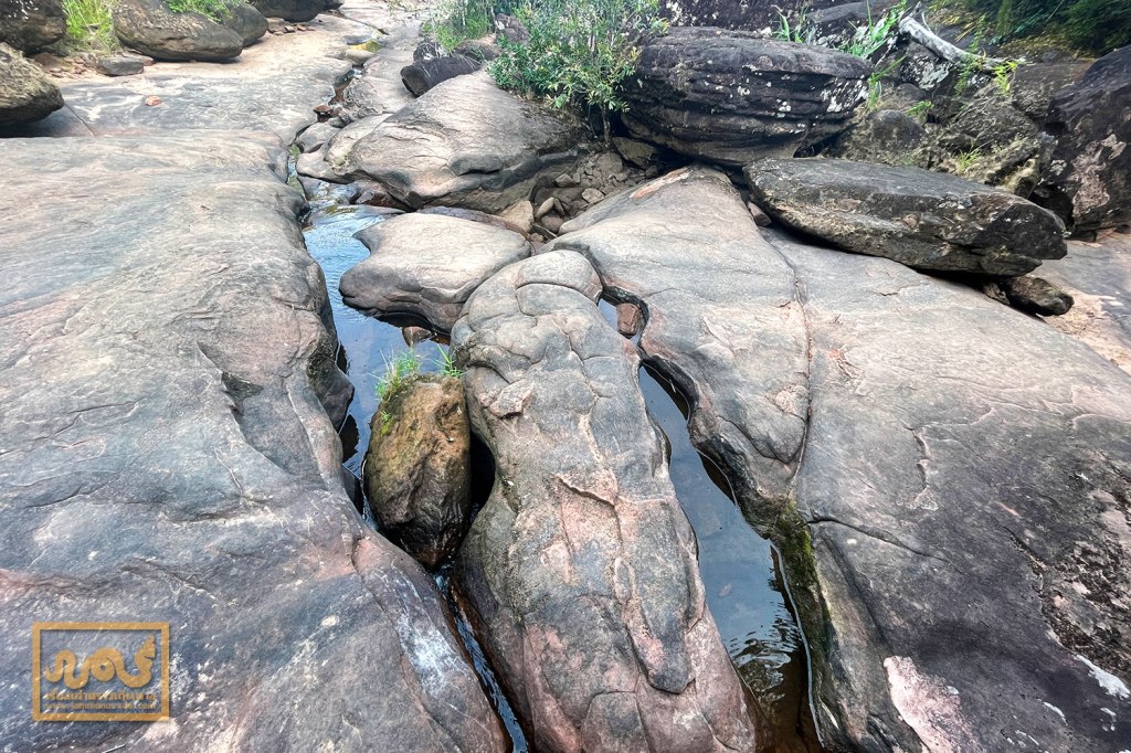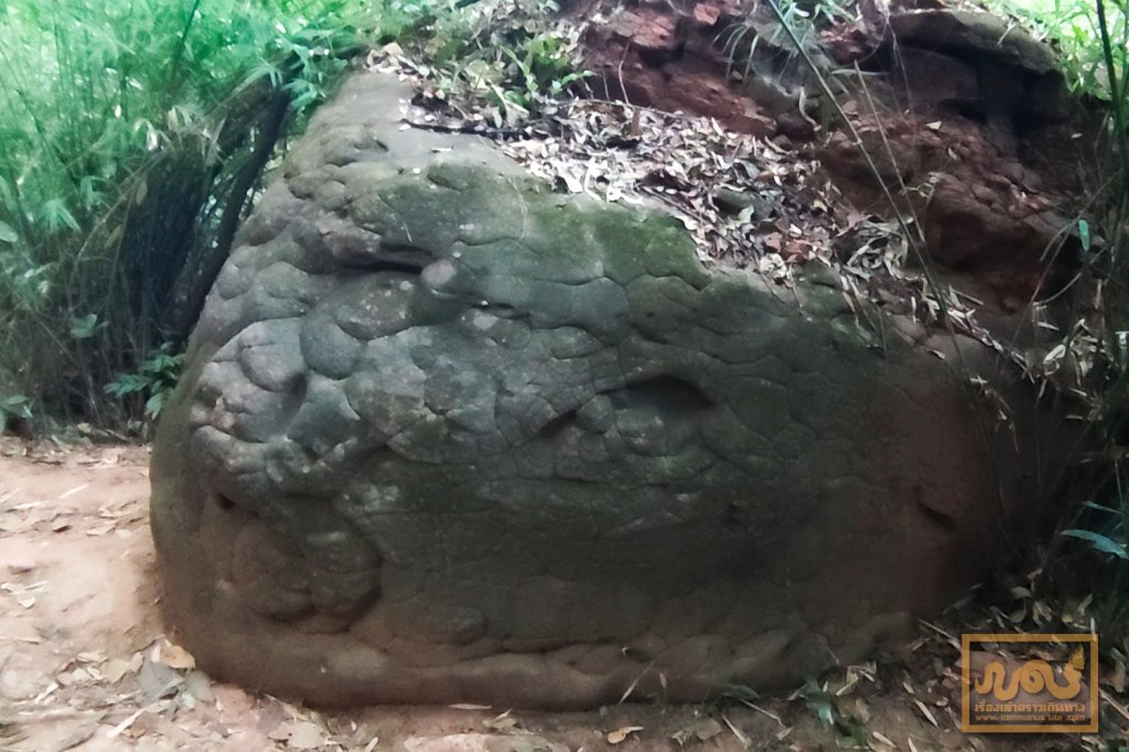 พื้นผิวที่เรียกกันว่า “หินเกล็ดพญานาค” เนื่องจากลักษณะเป็นรอยเหลี่ยมสม่ำเสมอตลอดทั่วบนพื้นผิวเหมือนเกล็ดงูขนาดใหญ่ ในทางธรณีวิทยาเรียกว่าปรากฏการณ์ “ซันแครก”(Suncrack) เกิดจากการแตกของผิวหน้าหินทรายจากการเปลี่ยนแปลงอุณหภูมิที่แตกต่างกันมาก ระหว่างช่วงกลางวันและกลางคืนอย่างรวดเร็ว ทำให้หินเกิดการขยายตัวและหดตัวสลับไปมา หินทรายที่เกิดจากเม็ดทรายขนาดใกล้เคียงกันเมื่อเวลาแตกก็จะมีรูปแบบของการแตกเป็นหลายเหลี่ยมอย่างมีระเบียบเท่ากันตลอด จึงมองดูเหมือนเกล็ดงูดังที่เห็น โดยหินเกล็ดพญานาคที่พบมีอายุประมาณ ๑ แสนปี | ที่มา: อนุสาร อสท. กันยายน 2563