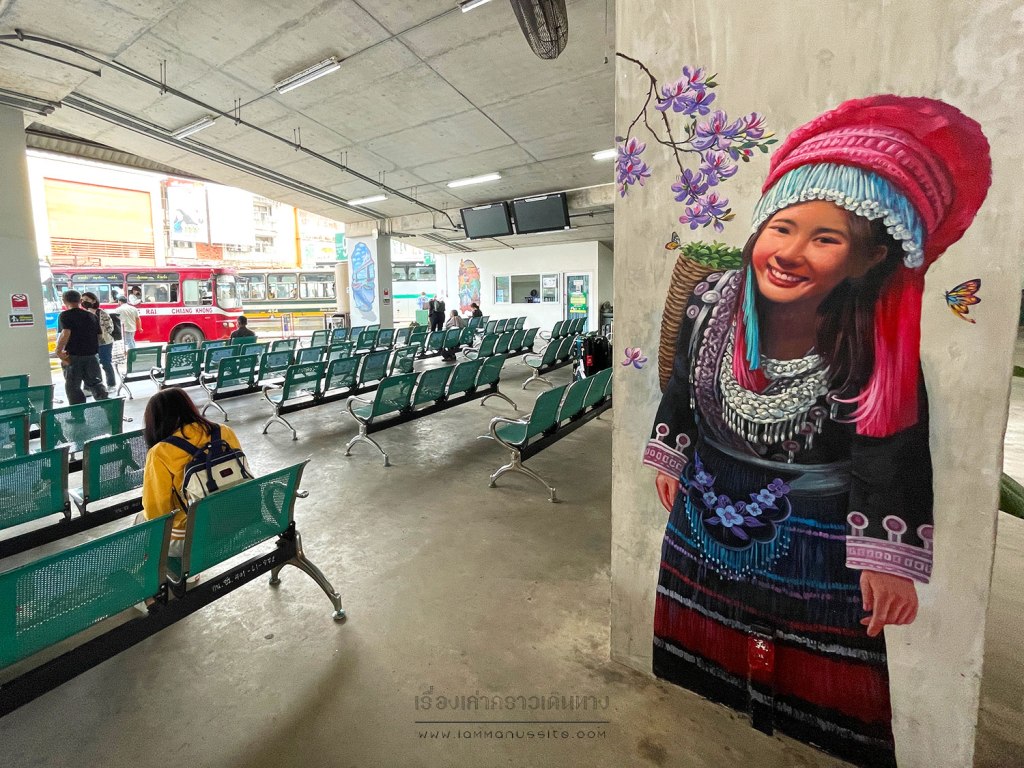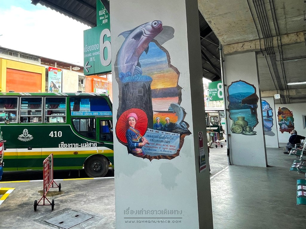 สมกับเป็นเมืองแห่งศิลปะ สถานีขนส่งเชียงรายถูกวาดภาพตามผนังสวยงาม สื่อความเป็นเชียงราย ไม่ใช่แค่ 1 ผนัง 2 ผนัง แต่ทั่วทั้งสถานีไปเลย แทบจะทุกผนังทุกเสา นอกจากภาพฝาผนังแล้วที่นี่ยังเป็น Tourist information center ด้วย แล้วก็ยังมีห้องแสดงภาพวาด ภาพถ่ายประกวด เหมือนแกลเลอรี่เล็กๆ เข้าไปชมได้ฟรี เวลาต้องรอรอบรถก็ไม่เบื่ออีกต่อไป