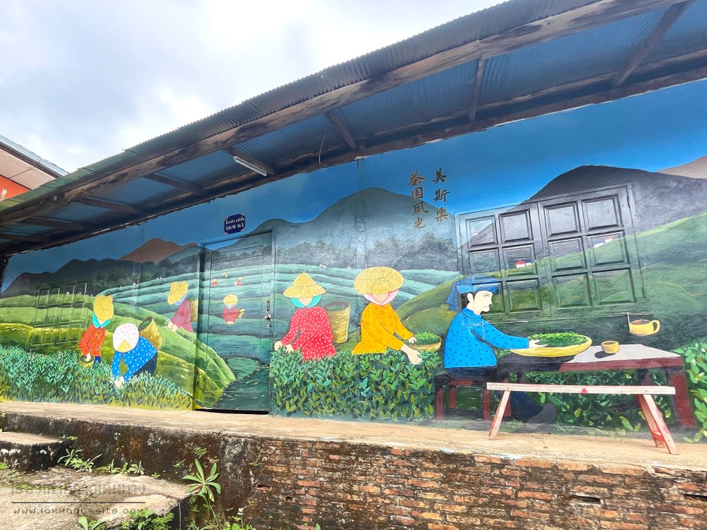 ออกจากตัวเมืองเชียงรายไปราวๆ 70 กม. ขับรถชั่วโมงกว่าๆ เลี้ยวซ้ายจากถนนใหญ่ขึ้นเขาไปที่ดอยแม่สลอง ที่ๆชุมชนชาวจีนยูนนานแห่งกองพล 93 ถอยร่นจากประเทศจีนมาลงหลักปักฐานนานกว่า 40 กว่าปีมาแล้ว ก่อตั้งเป็นหมู่บ้านสันติคีรี มีอาชีพปลูกไร่ชากับผลไม้เมืองหนาว นักท่องเที่ยวขึ้นไปเที่ยวชมวิวหุบเขาสวยๆ เดินเที่ยวในหมู่บ้าน ทานอาหารจีนยูนนาน ซื้อชา ซื้อผลไม้ แถมมีสตรีทอาร์ทเก๋ๆ แอบอยู่ ตามรั้ว ตามผนัง หลายจุด น่ารักไม่น้อย
