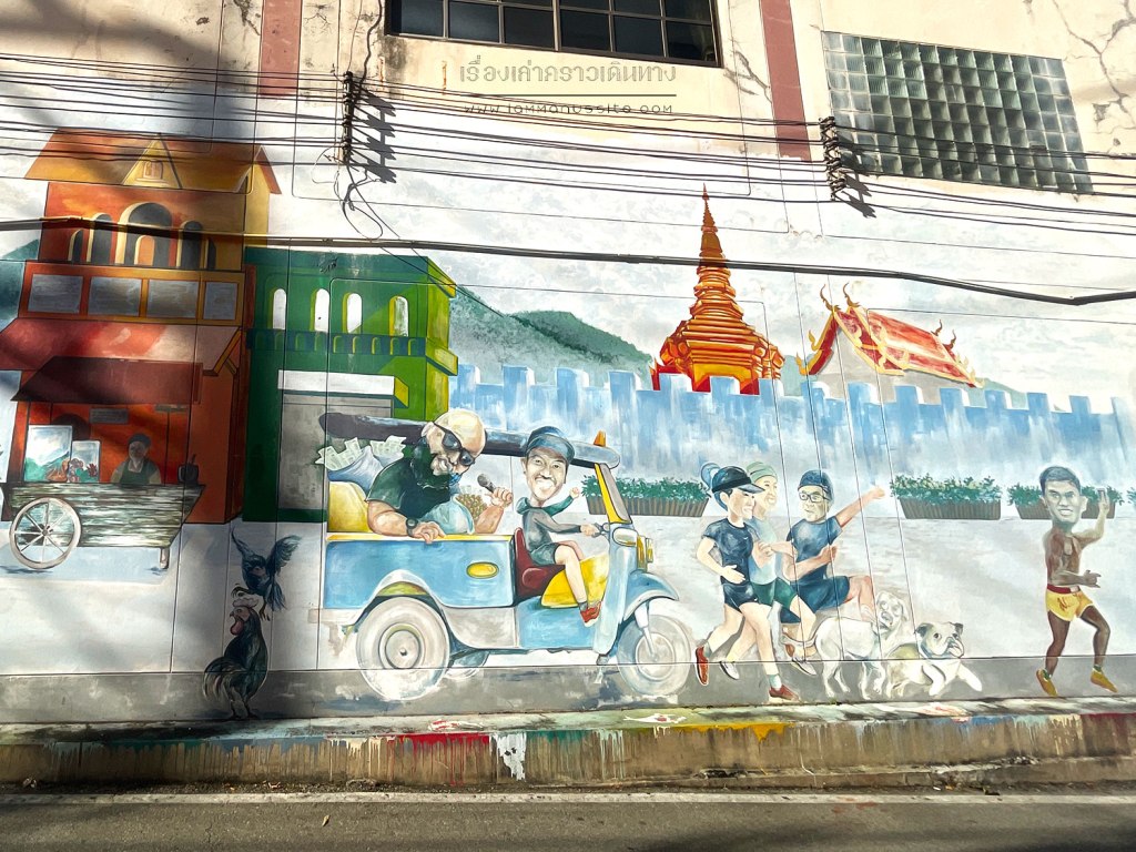 ลงจากดอยแม่สลอง ขับรถต่อไปจนสุดแดนสยามที่ อ.แม่สาย ที่นี่มีสตรีทอาร์ทแอบๆอยู่ 1 แผง ในซอบเทศบาล 8 (ซอยน้ำบ่อหลวง) มีรูปพี่ตูนขับรถตุ๊กตุ๊กให้พี่กอล์ฟ ฟักกลิ้งฮีโร่นั่ง (เพราะตอนนั้นพี่ตูนกำลังดังจากการวิ่งระดมทุนจากเหนือจรดใต้) แล้วก็รูปอื่นๆเกี่ยวกับแม่สายเต็มแผงตึก แถมด้วยสตรีทอาร์ทเก๋ๆตามรั้วบ้านต่อเข้าไปในซอยอีก รูปแผงหลักตอนนี้สีซีดไม่สดใสสวยงามแล้ว แต่ถ้าผ่านไปก็แวะไปชมได้นะ