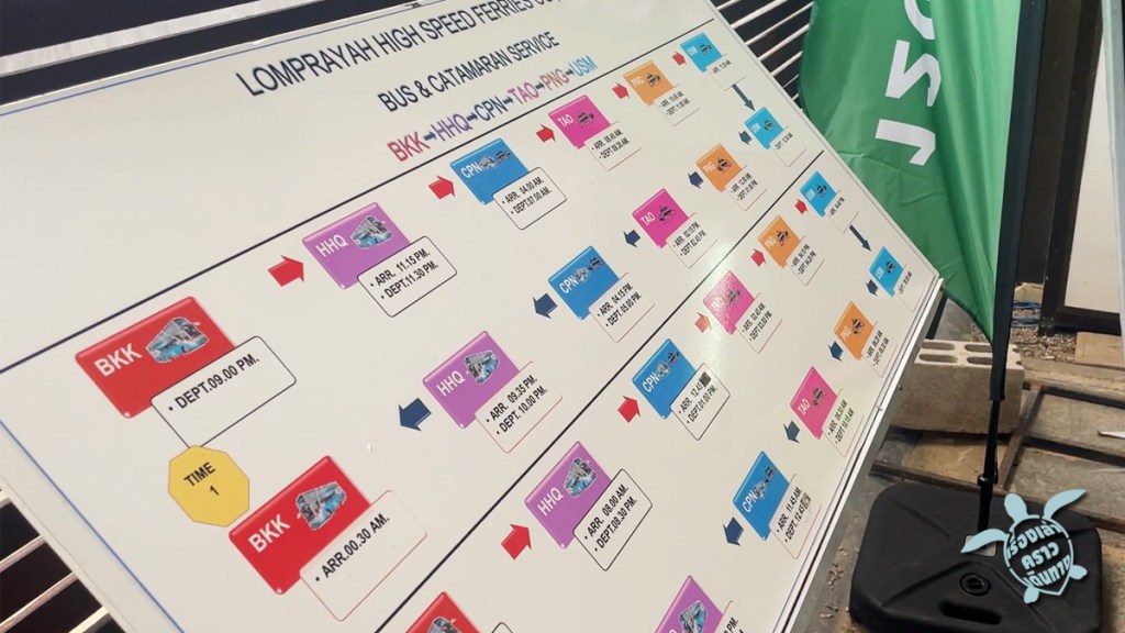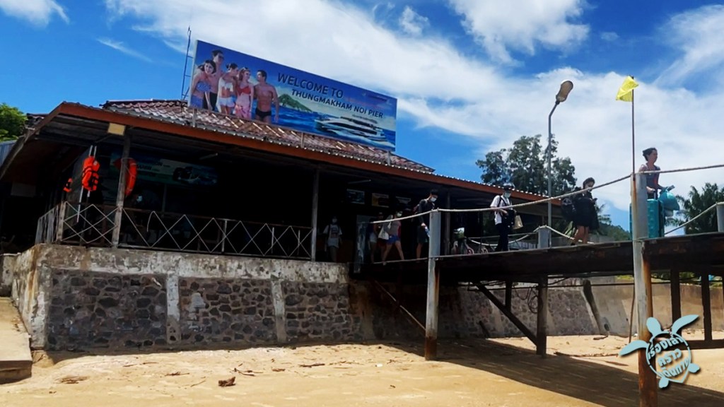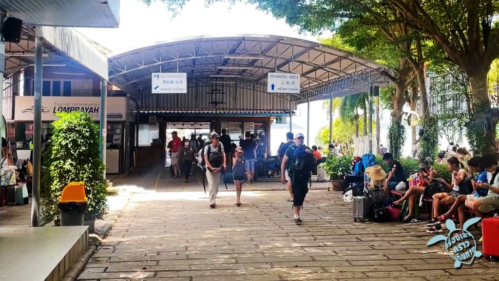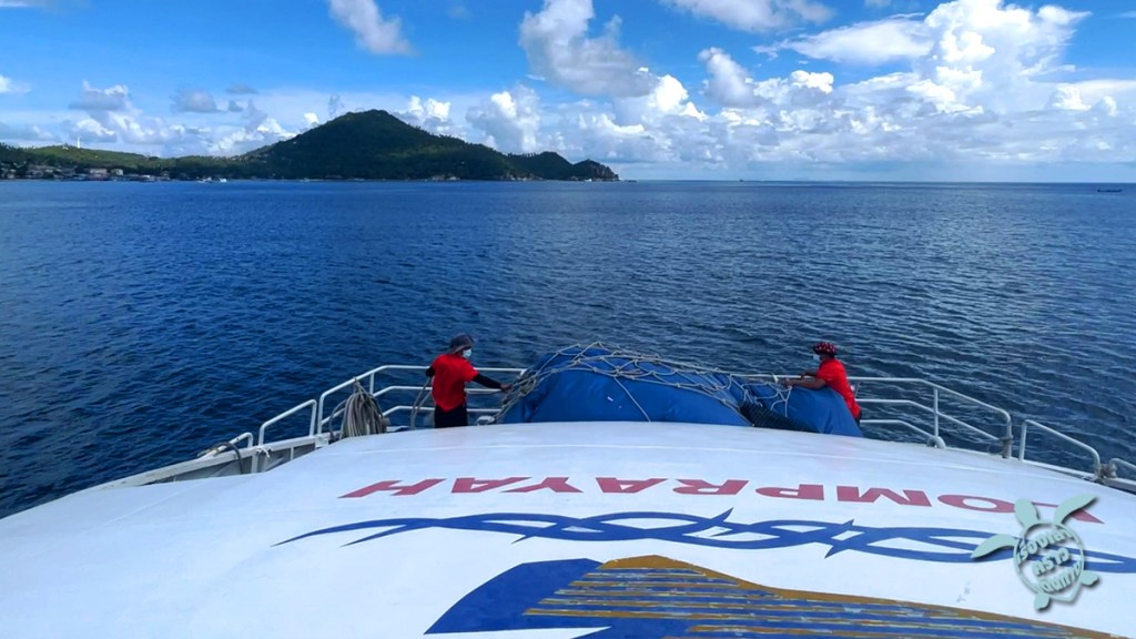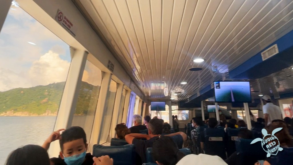 ตรงท่าเรือลมพระยา อ่าวทุ่งมะขามน้อย มีร้านอาหาร ร้านกาแฟ ให้ฝากท้องได้อยู่ ถึงเวลามีประกาศเรียกขึ้นเรือตามหมายเลข ไม่ต้องเบียดกันเดิน แต่พอขึ้นเรือแล้วก็ไม่ได้มีเลขที่นั่งอะไร หาที่นั่งกันตามสะดวก ห้องแอร์นั่งสบาย หลับไปสัก 2 ชม.ก็ถึงเกาะนางยวน ปล่อยคนที่จะนอนที่นี่ลงก่อน แล้วต่อไปที่ท่าเรือเกาะเต่าที่หาดแม่หาด