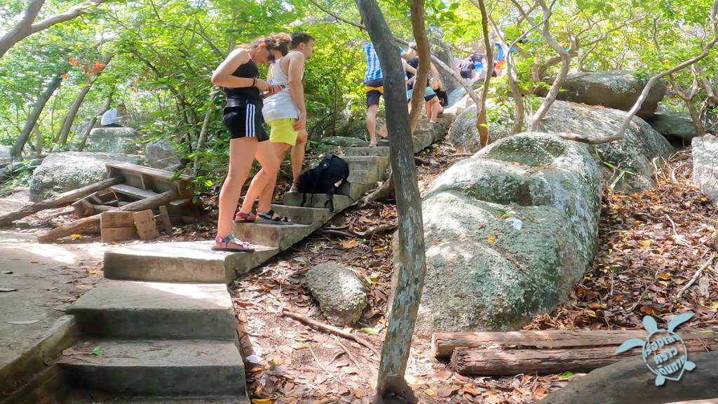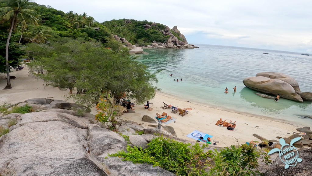 พี่แจ็คเอาเรือมารับพวกเราที่หาดทรายรี พาพวกเราไป เกาะนางยวน เป็นที่แรก เสียค่าขึ้นเกาะคนละ 50 บาท พวกเราเดินขึ้นจุดชมวิว กับเที่ยวเล่นหาดทรายขาวสวย ทางเดินขึ้นจุดชมวิวเป็นบันไดเดินง่าย ไม่ชันมาก บนยอดเขาก็แคบๆ รอคิวขึ้นถ่ายรูปเหมือนจุดชมวิวจอห์นสุวรรณที่เกาะเต่านั่นแหละ ถ้าใครไปจังหวะไม่ดีเจอเรือทัวร์มาพอดีคนจะเยอะมาก ยืนรอคิวกันเป็นแถวยาว (เราโชคดีตอนมา เรือทัวร์ยังไม่เข้า มาเจอทัวร์เดินสวนขึ้นไปตอนเราเดินลง แบบว่าเดินขึ้นกันเป็นทิวแถว น่าจะต้องรอคิวขึ้นยอดเขากันนานเลย)