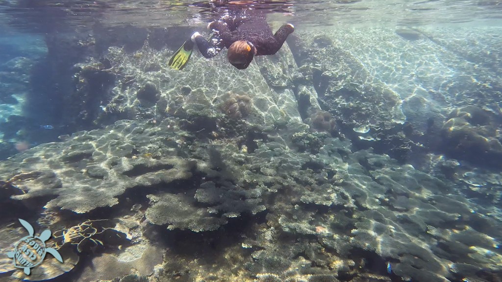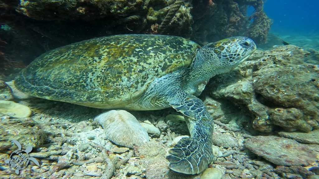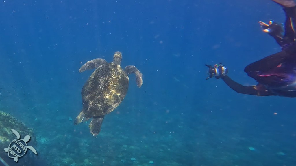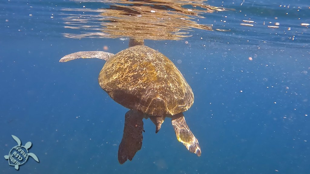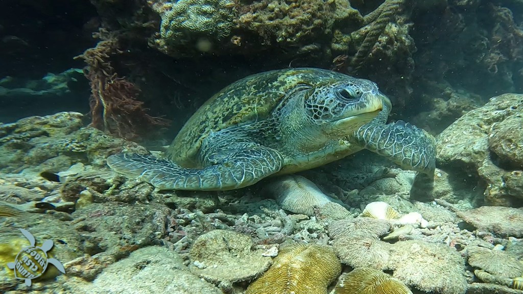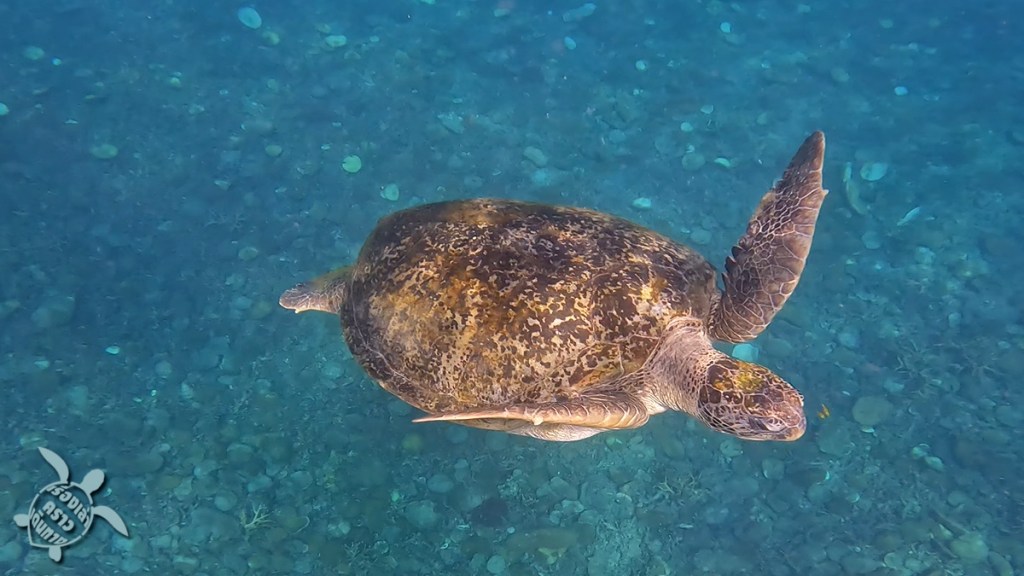 จุดสุดท้ายคือการตามล่าหาเต่าที่ อ่าวเทียน พอเรือพี่แจ็คมาถึง คนเรืออีกลำก็บอกเลยว่า เต่าอยู่ตรงนี้เลย ก็ลงน้ำปุ๊บเจอปั๊บเลย เต่าตัวใหญ่กว่าที่คิด พี่แจ็คบอกว่าตรงอ่าวนี้มีเต่าหลายตัว ช่วงเย็นๆ จะขึ้นมาให้เห็นหลายตัว เรามาถึงบ่ายๆ เจอตัวเดียว แต่ก็ดีใจแล้ว พี่เต่าอยู่ใต้หิน แต่ก็ว่ายขึ้นมาเหนือน้ำด้วย ขึ้นๆลงๆ 2-3 รอบ เราก็ลอยตัวดูได้ใกล้ๆเลย น่ารักมากๆ