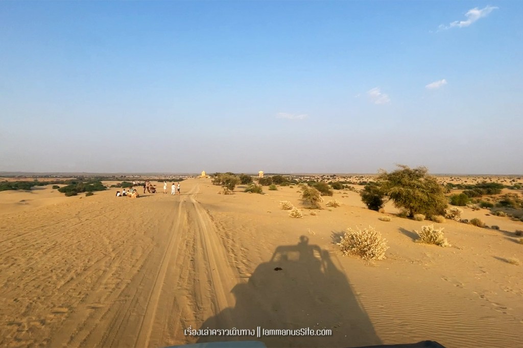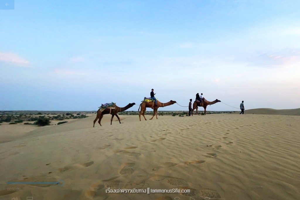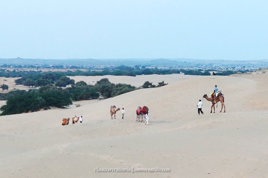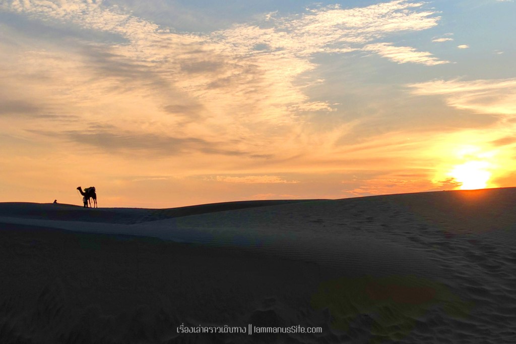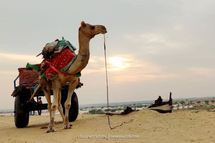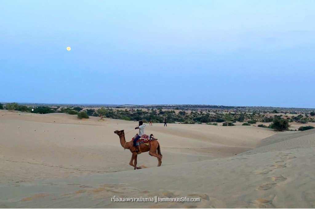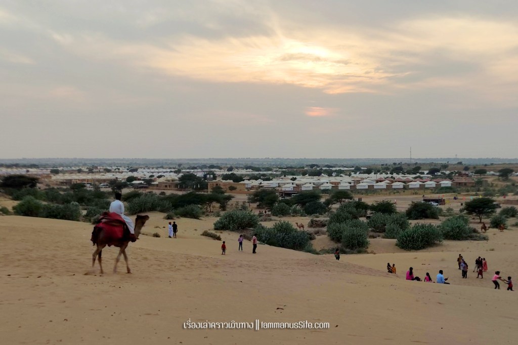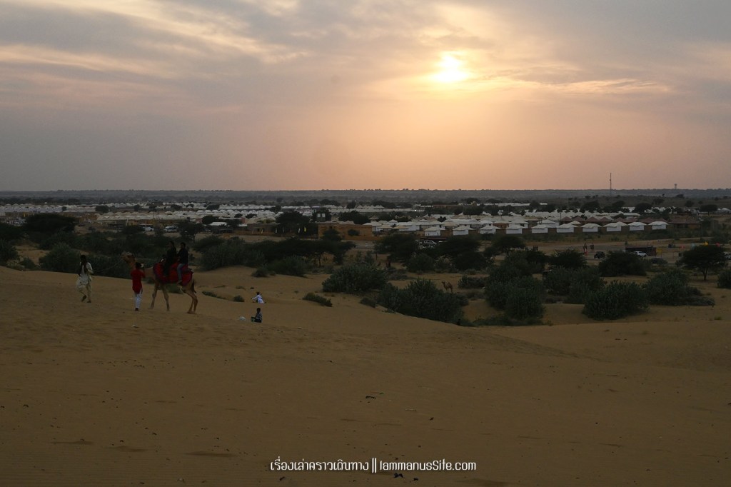 Sam Sand Dune จุดชมทะเลทรายยอดนิยมของเมืองจัยซัลแมร์ มีที่พักแบบ Desert camp หลายที่ ทะเลทรายอยู่ติดริมถนนสาย 53 เลย มีต้นไม้เขียวเยอะไปหน่อย ใครอยากถ่ายรูปเนินทรายเวิ้งว้าง ก็ต้องหมุนหามุมกันหน่อย มุมพระอาทิตย์ตกก็จะเห็น Desert camp สีขาวเต็มไปหมด แถบนี้เป็นที่นิยมของคนอินเดียออกมาขี่อูฐกัน จะเดินจากริมถนนขึ้นเนินมาก็พอได้ หรือจะหาอูฐนั่งขึ้นเนินมาก็มีนอนรอริมถนนเยอะแยะ แต่ถ้าจะให้เห็นเนินทรายสวยๆ ต้องนั่งอูฐเข้าไปลึกๆหน่อย แต่คนจูงอูฐมักจะพาขึ้นมาบนเนินแล้วให้ลงแค่ตรงนั้น
