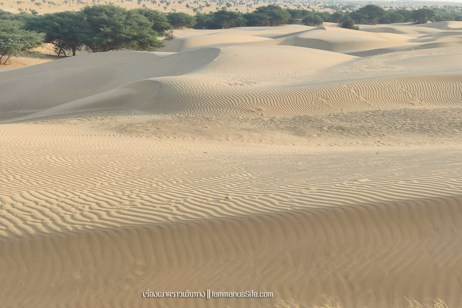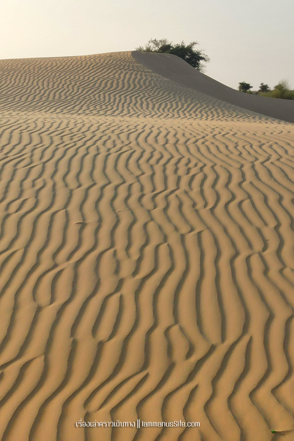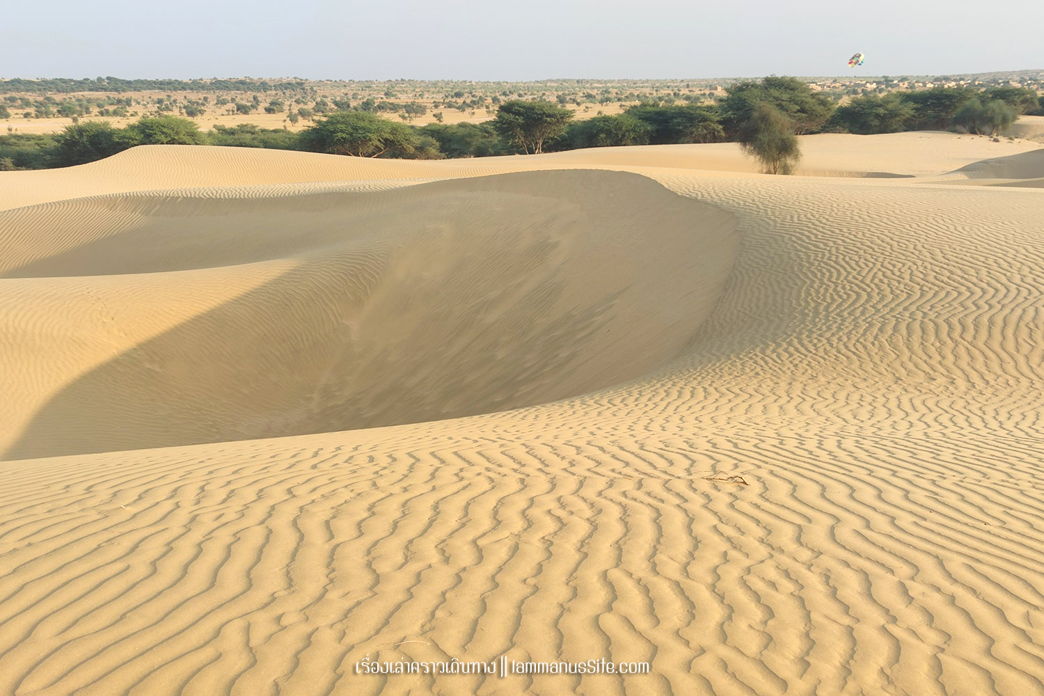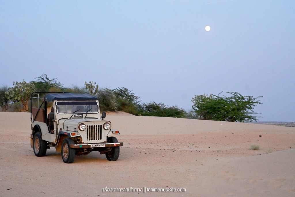 Sam Sand Dune จุดชมทะเลทรายยอดนิยมของเมืองจัยซัลแมร์ มีที่พักแบบ Desert camp หลายที่ ทะเลทรายอยู่ติดริมถนนสาย 53 เลย มีต้นไม้เขียวเยอะไปหน่อย ใครอยากถ่ายรูปเนินทรายเวิ้งว้าง ก็ต้องหมุนหามุมกันหน่อย มุมพระอาทิตย์ตกก็จะเห็น Desert camp สีขาวเต็มไปหมด แถบนี้เป็นที่นิยมของคนอินเดียออกมาขี่อูฐกัน จะเดินจากริมถนนขึ้นเนินมาก็พอได้ หรือจะหาอูฐนั่งขึ้นเนินมาก็มีนอนรอริมถนนเยอะแยะ แต่ถ้าจะให้เห็นเนินทรายสวยๆ ต้องนั่งอูฐเข้าไปลึกๆหน่อย แต่คนจูงอูฐมักจะพาขึ้นมาบนเนินแล้วให้ลงแค่ตรงนั้น