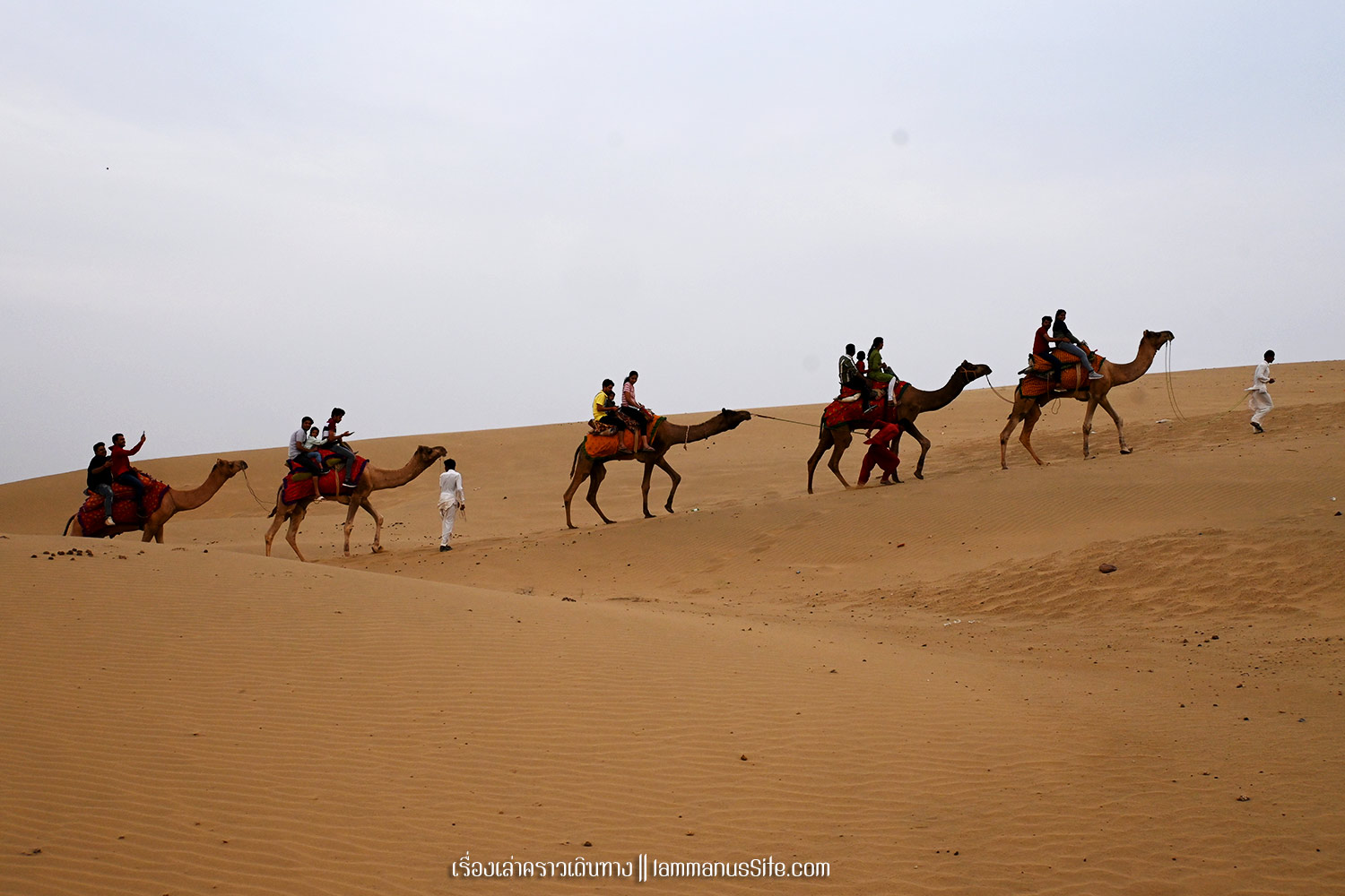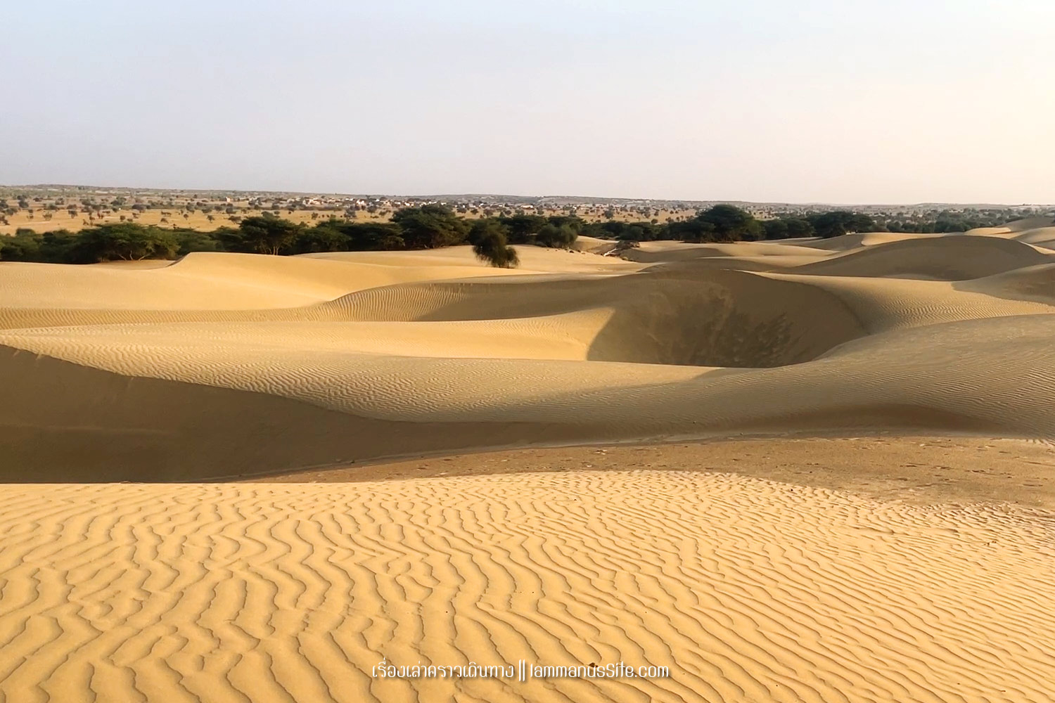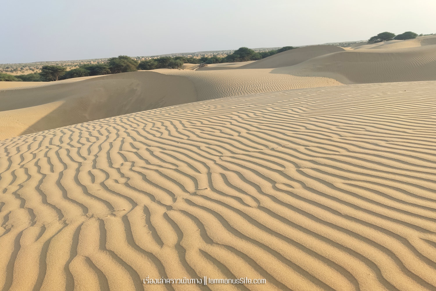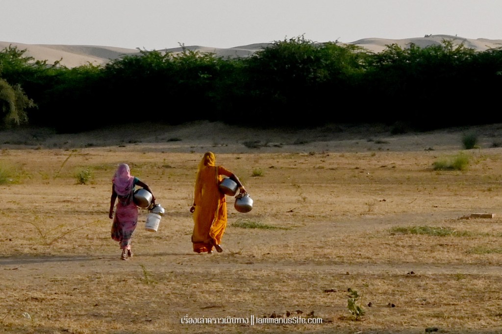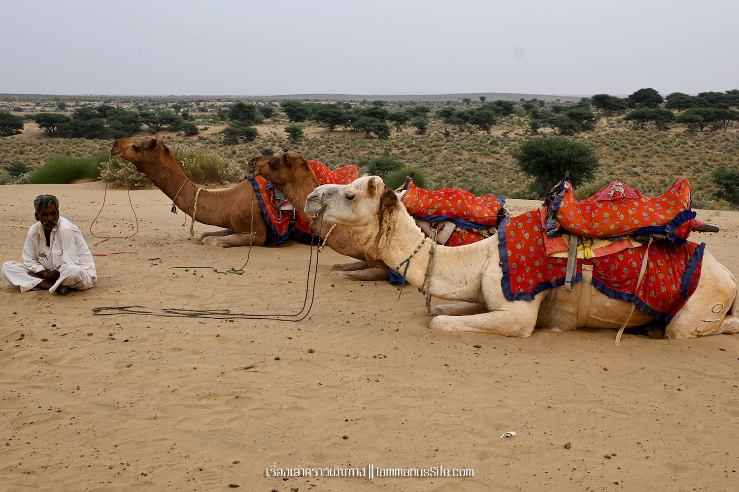 Sam Sand Dune จุดชมทะเลทรายยอดนิยมของเมืองจัยซัลแมร์ มีที่พักแบบ Desert camp หลายที่ ทะเลทรายอยู่ติดริมถนนสาย 53 เลย มีต้นไม้เขียวเยอะไปหน่อย ใครอยากถ่ายรูปเนินทรายเวิ้งว้าง ก็ต้องหมุนหามุมกันหน่อย มุมพระอาทิตย์ตกก็จะเห็น Desert camp สีขาวเต็มไปหมด แถบนี้เป็นที่นิยมของคนอินเดียออกมาขี่อูฐกัน จะเดินจากริมถนนขึ้นเนินมาก็พอได้ หรือจะหาอูฐนั่งขึ้นเนินมาก็มีนอนรอริมถนนเยอะแยะ แต่ถ้าจะให้เห็นเนินทรายสวยๆ ต้องนั่งอูฐเข้าไปลึกๆหน่อย แต่คนจูงอูฐมักจะพาขึ้นมาบนเนินแล้วให้ลงแค่ตรงนั้น