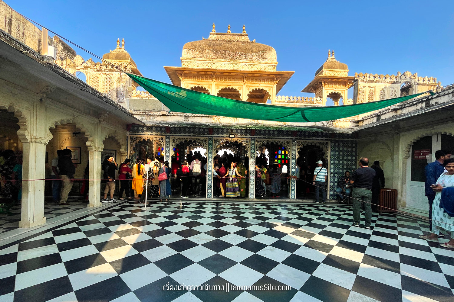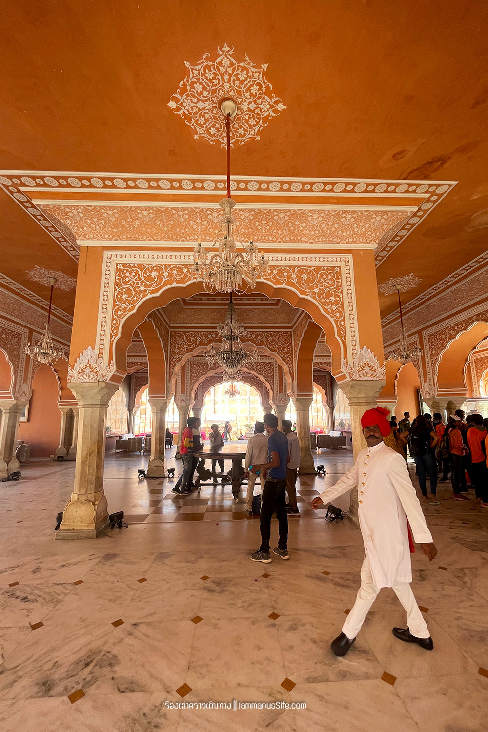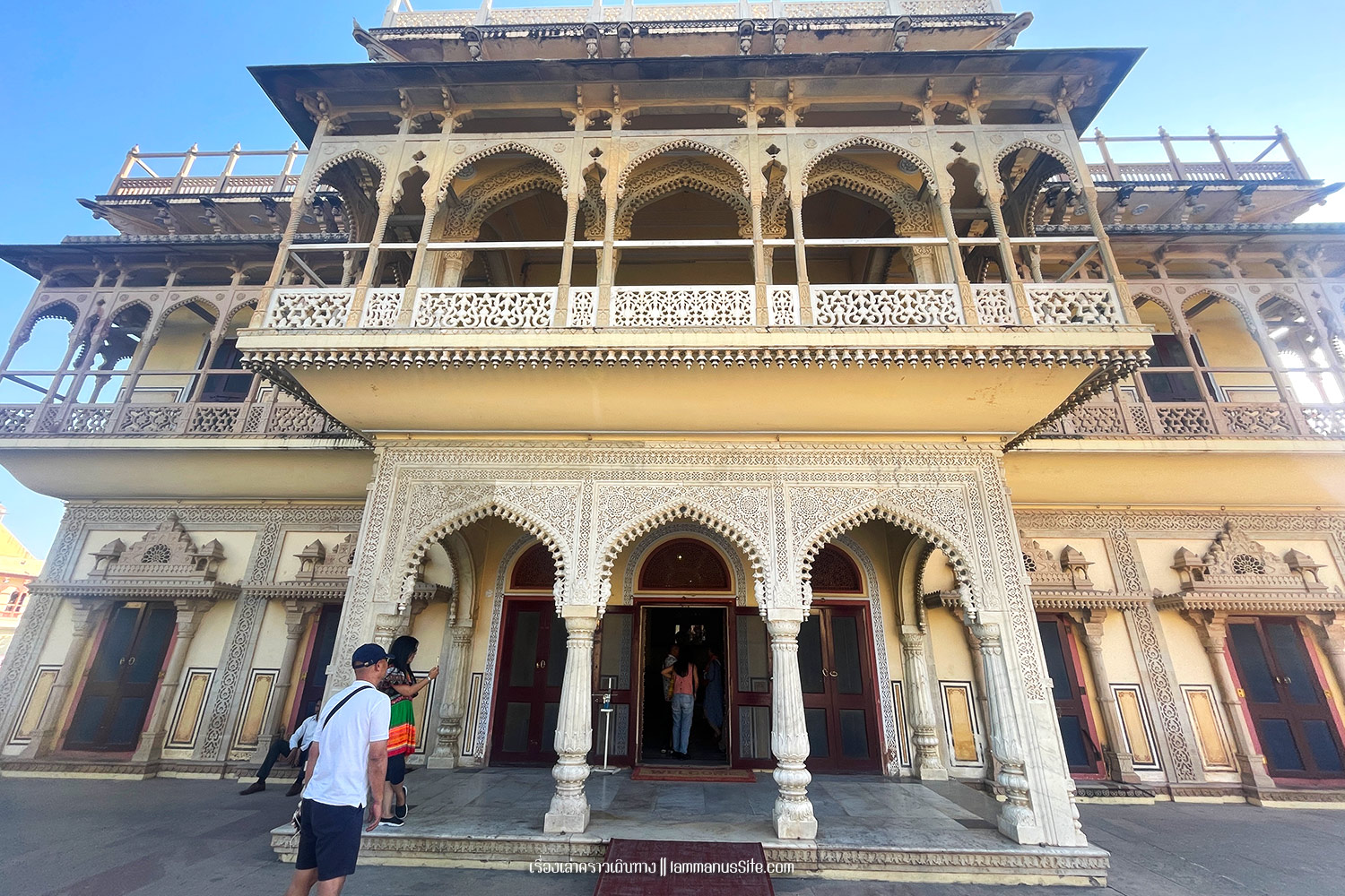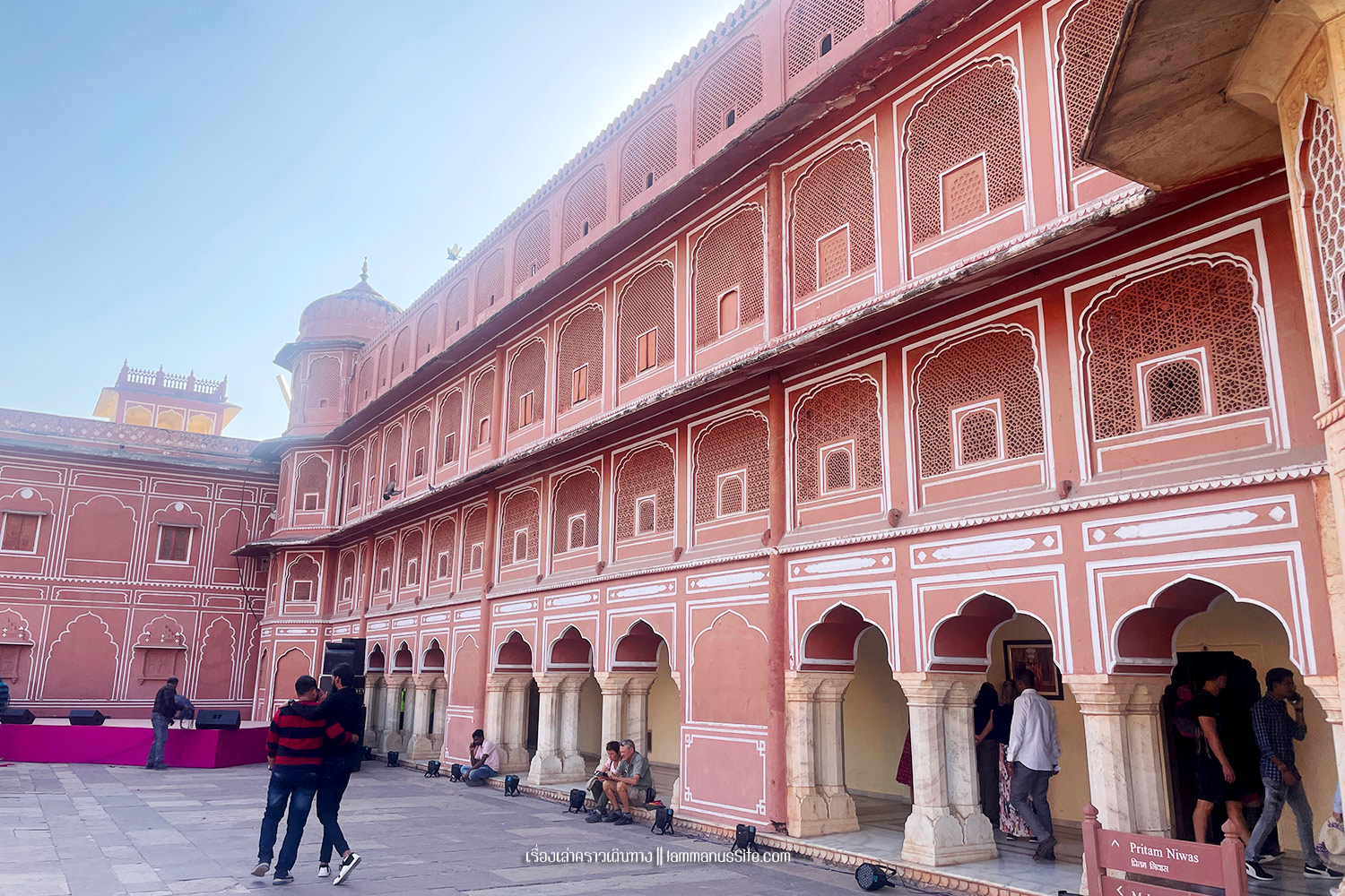 City Palace of Jaipur | พระราชวังหลวงแห่งไจปูร์ สร้างขึ้นเมื่อ ค.ศ.1797 สมัย มหาราชาสไวจัยซิงห์ ที่ 2 (Maharaja Sawai Man Singh II) แม้มหาราชาจะหมดอำนาจแล้ว แต่ City palace ก็ยังเป็นสมบัติส่วนพระองค์ ปัจจุบันก็ยังมีส่วนพื้นที่อยู่อาศัยส่วนตัว แต่ก็เปิดพื้นที่หลายส่วนให้เข้าชม เก็บค่าเข้าเป็นรายได้เข้าทรัพย์สินส่วนพระองค์ นอกจากค่าเข้าราคาปกติแล้ว ยังมีพื้นที่ส่วนพิเศษที่ต้องจ่ายเงินเพิ่ม 3,500 รูปี เกือบ 2000 บาท เพื่อเข้าไปดูพื้นที่พิเศษ (รู่สึกว่าแพงจัง เลยไม่เข้า)
