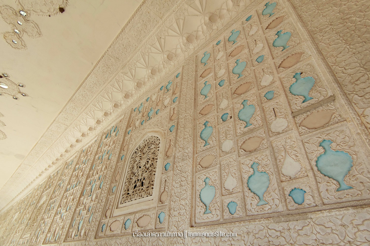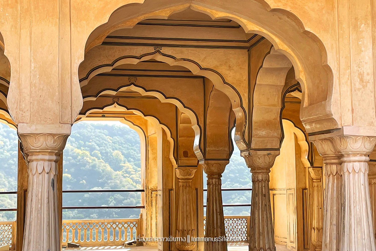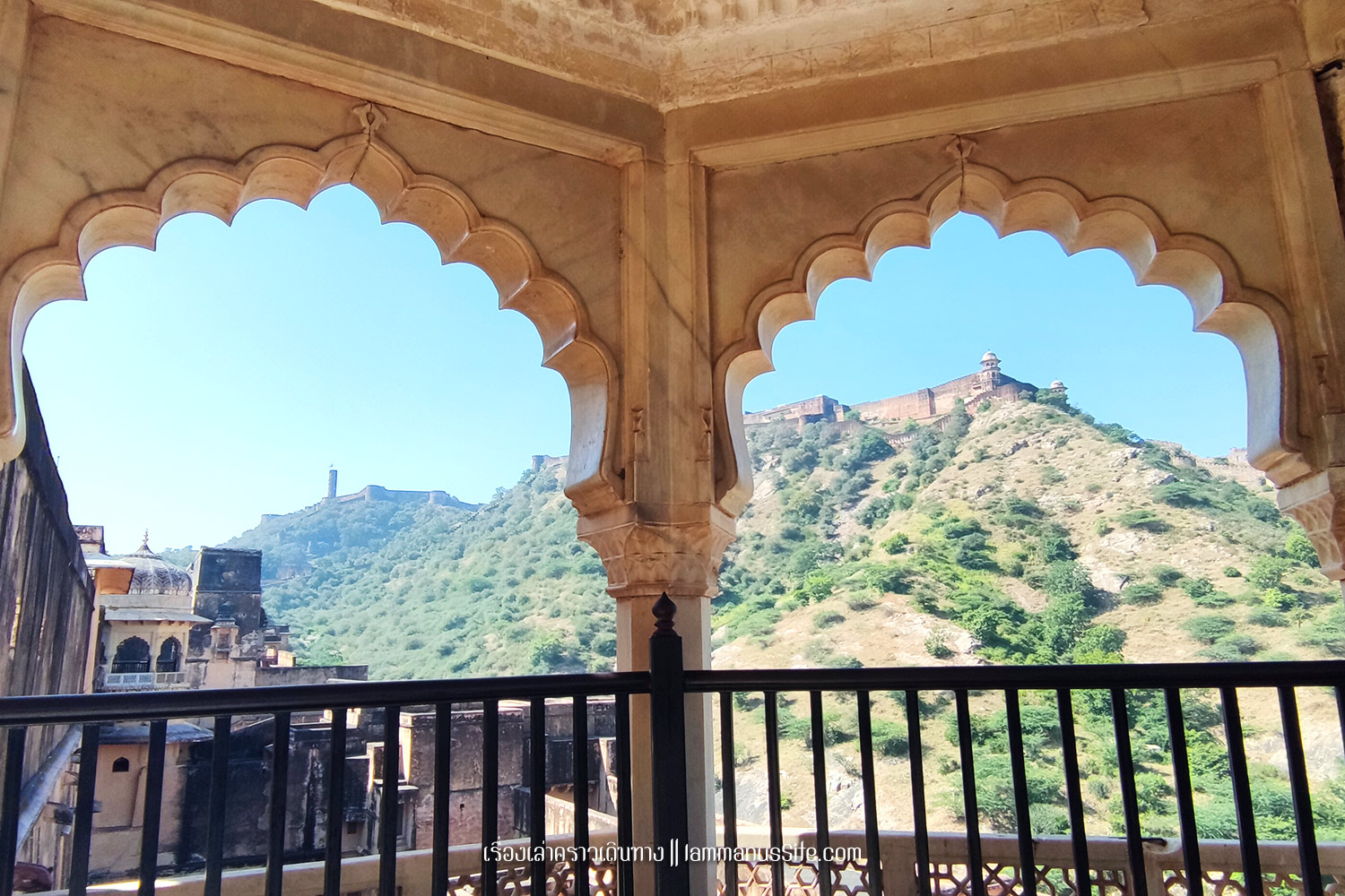 Amber Fort ป้อมปราการนอกเมือง Jaipur อยู่บนเนินเขา สร้างโดยมหาราชา มาน ซิงห์ที่ 1 (Maharaja Man Singh I) เป็นพระราชวังดั้งเดิมก่อนจะย้ายเข้าไปอยู่ในเขตเมืองเก่า (City Palce ปัจจุบัน) Amber Fort มีแนวกำแพงยาว 13 กม.ด้านในมีแบ่งพื้นที่เป็นส่วนๆ ทั้งส่วนประทับของมหาราชา มหารานี มีส่วนรับแขกเมือง ส่วนท้องพระโรง ส่วนของมหาราชาก็จะประดับกระจกวิบวับสวยงามมากหน่อย ส่วนของมหารานีก็ตกแต่งน้อยกว่าไม่หรูหราเท่า แต่ละพื้นที่มีลานกว้าง มีสวนสวย เห็นลวดลายของฝ้าและผนัง แบบสถาปัตยกรรมสไตล์ราชปุต (Rajput) ผสมฮินดู