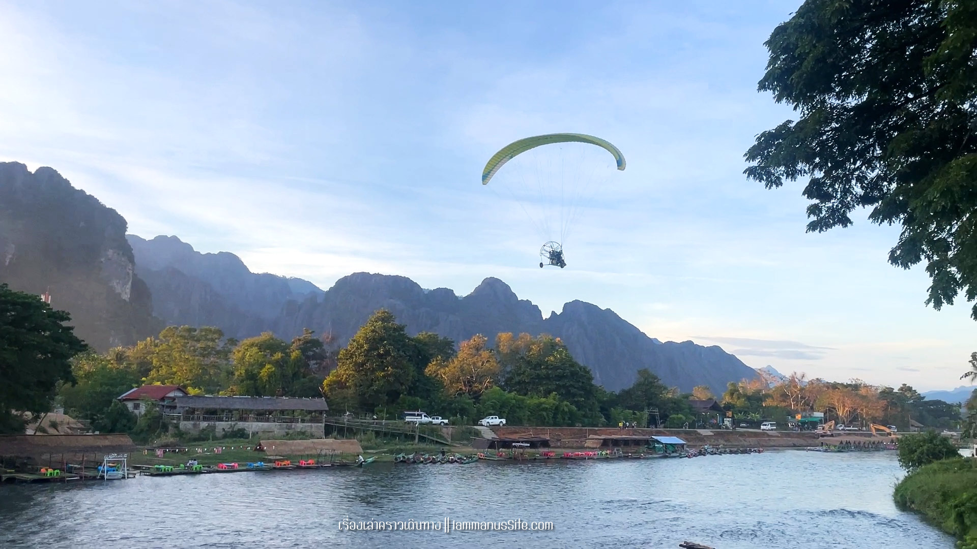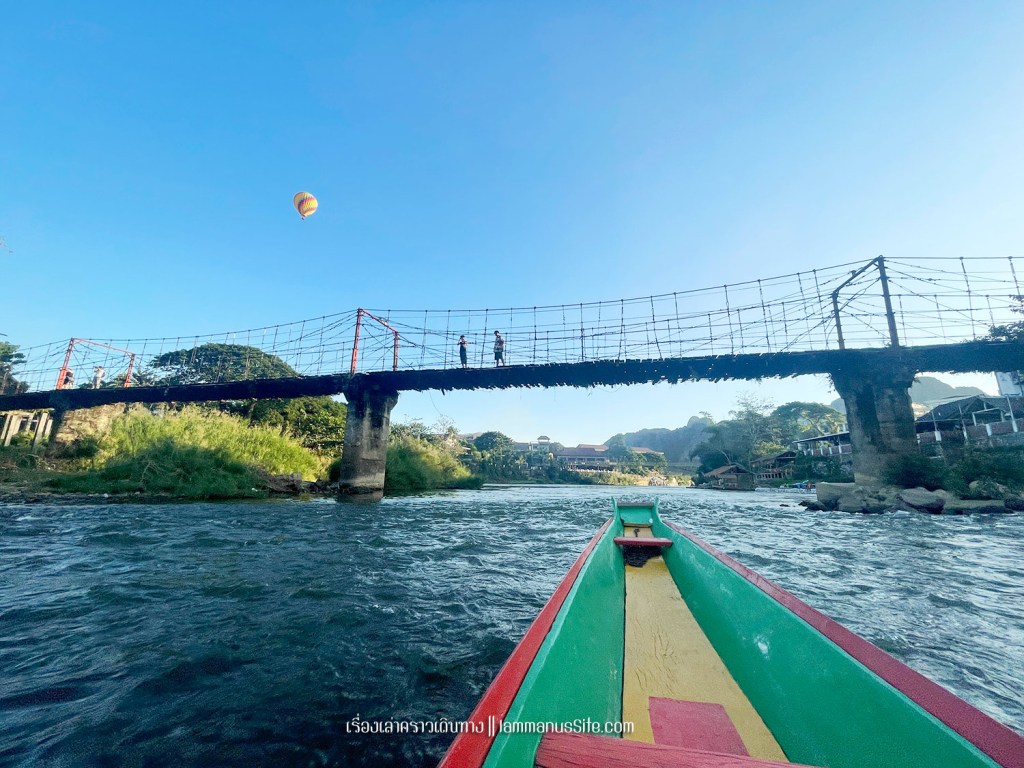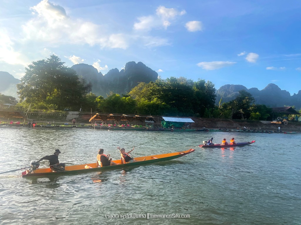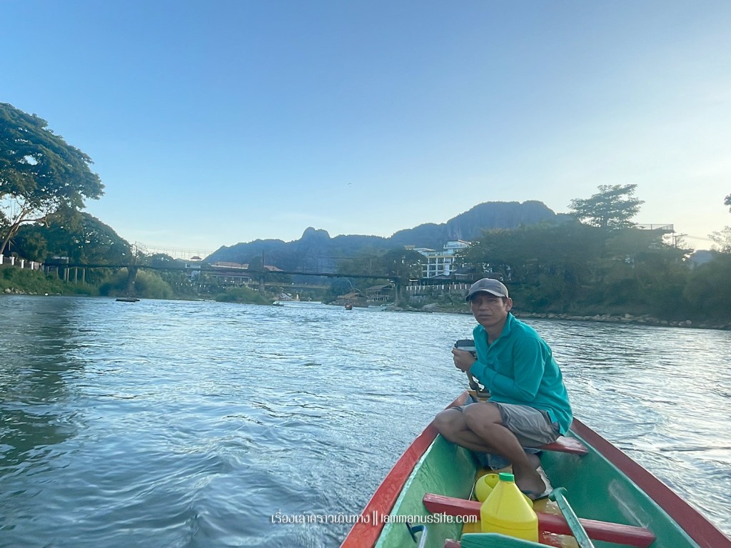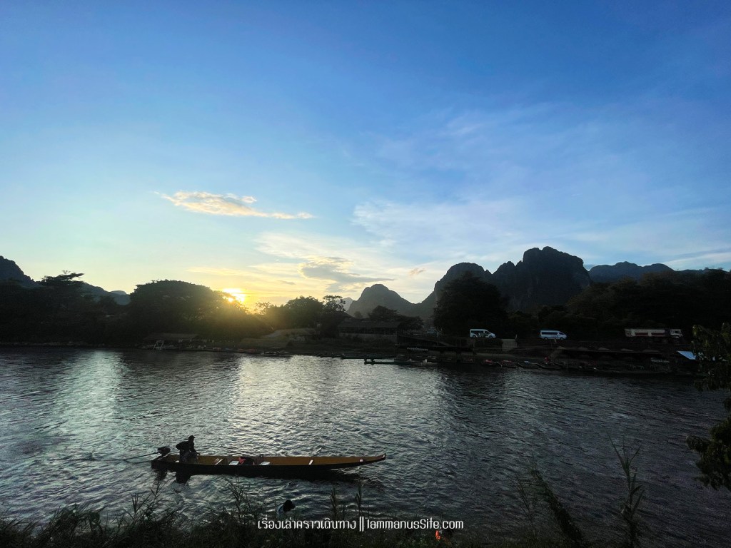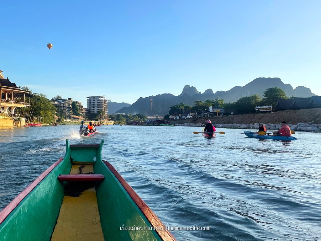 เช่าเรือหางยาวนั่งรับลมชมแสงยามเย็นจากท่าเรือของโรงแรม นั่งเล่นวนไปมาประมาณ ½ ชม. พอได้รับลมเย็นๆบ้าง วังเวียงยังเป็นเมืองที่เต็มไปด้วยกิจกรรม ระหว่างที่เรานั่งเรือล่องแม่น้ำซอง ก็มีนักท่องเที่ยวพาคายักตามรายทาง บนฟ้าก็มีพาราไกลดิ้งบินเฉี่ยวไปมา ก่อนพระอาทิตย์ตกมีบอลลูนสีสดลอยข้ามหัวพวกเราไป