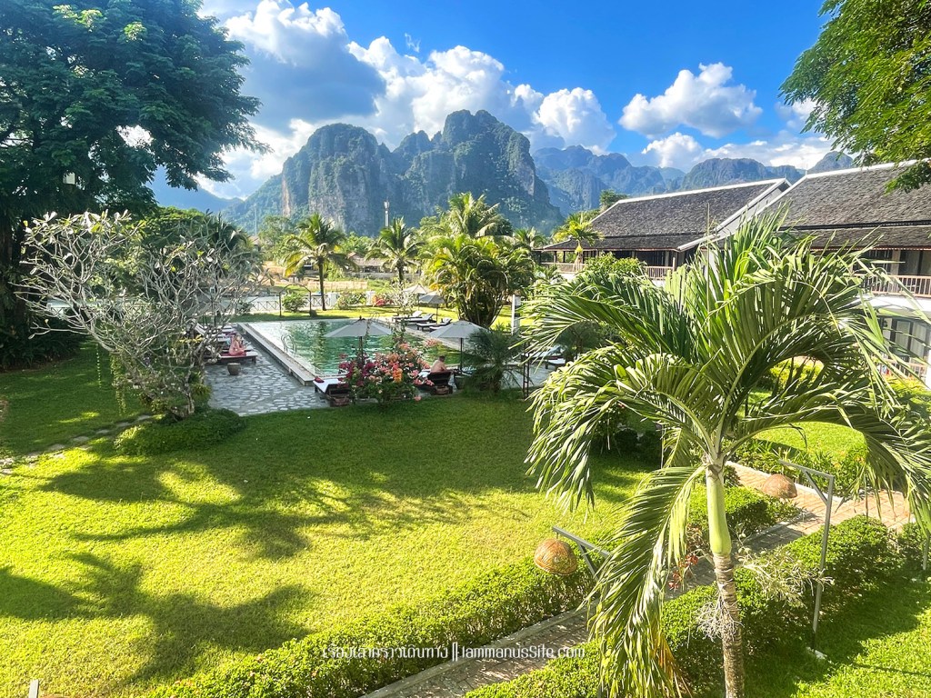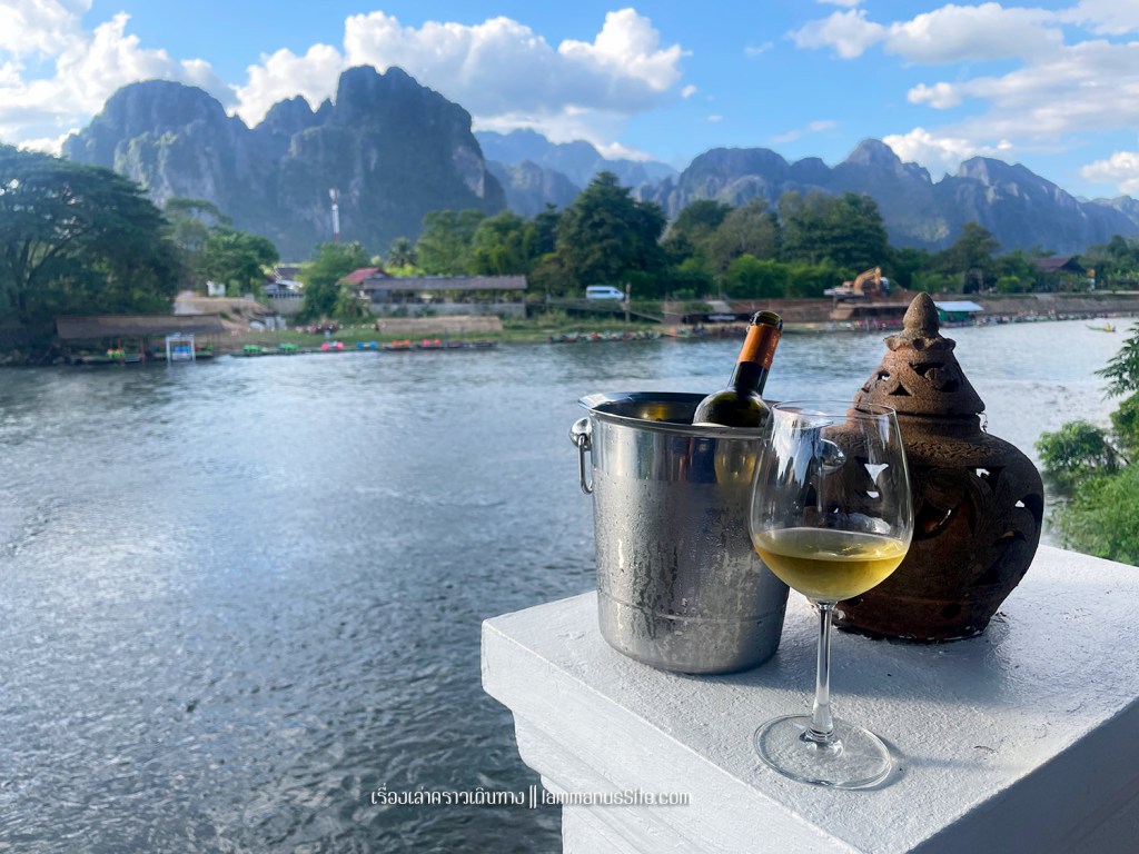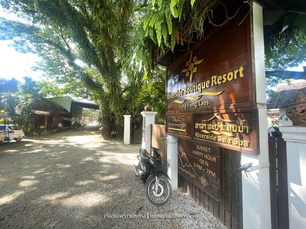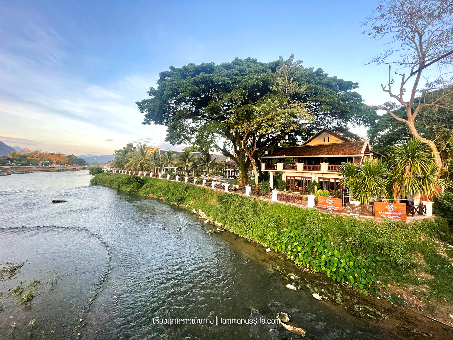 คราวนี้เลือกพักที่ Riverside Boutique Hotel ริมน้ำซอง โรงแรมสวย บรรยากาศดี เป็นอาคาร 3 ชั้นที่พอจะกลมกลืนกับแนวเขาฝั่งตรงข้ามได้ ห้องพักได้มาตรฐานสมราคา มุมมองสวย ร้านอาหารก็ดี พิกัดอยู่ติดสะพานแขวน