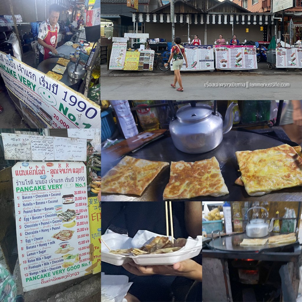 ของกินยอดนิยมตามที่ท่องเที่ยวยุคนี้ในหลายที่เที่ยวคือโรตี ที่วังเวียงก็เหมือนกัน มีร้านโรตีเรียงรายอยู่ตามถนนหน้าวัดกลางเป็นสิบร้าน มีร้านที่ว่ากันว่าเป็นโรตีเจ้าแรกของวังเวียง เป็นร้านลุงบุนยง ร้านแรกสุดซ้ายมือ มีป้ายภาษาไทยชัดเจน ร้านนี้ลุงใช้เตาถ่าน ต้องคอยคุมไฟให้เหมาะ เราลองร้านลุงแล้วก็ไปลองร้านอื่นด้วย มากัน 7 คน กินโรตีกันไปสิบกว่าแผ่น สรุปได้ว่าร้านลุงอร่อยอยู่ กรอบนอกนุ่มใน มีกลิ่นเตาถ่านด้วย แต่ร้านอื่นก็อร่อยดีเหมือนกัน