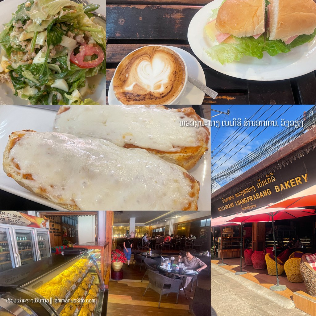 ร้านอาหาร ร้านกาแฟ เบเกอรี่ มีครบทุกอย่าง ร้านชื่อหลวงพระบาง เพราะร้านดั้งเดิมคือ หลวงพระบาง เบเกอรี่ แอนด์เกสต์เฮาส์ อยู่ที่หลวงพระบาง แต่มีสาขาอยู่ที่วังเวียงด้วย ร้านติดอันดับของนักท่องเที่ยว ไทย จีน ฝรั่ง นั่งกันเต็มร้าน พวกเรามากิน Brunch หลังจากลงรถไฟมาจากเวียงจันทน์ สั่ง Sandwich, Toast กับสลัดลาว มากินคู่กับกาแฟ และน้ำส้มคั้นแก้วยาว ก็อร่อยใช้ได้ ราคาสูงหน่อย