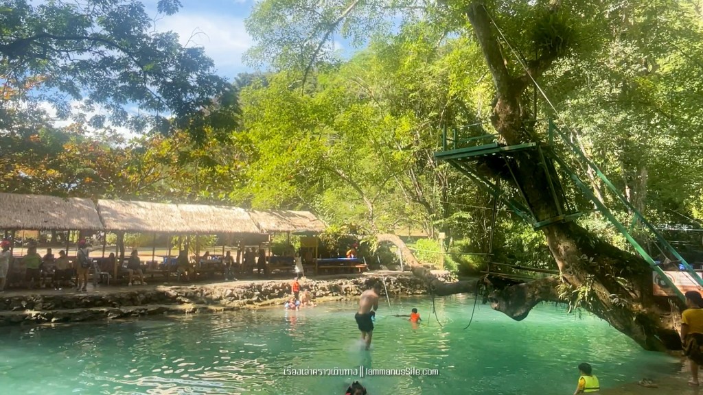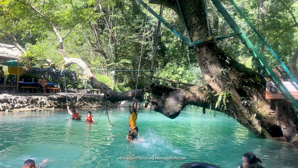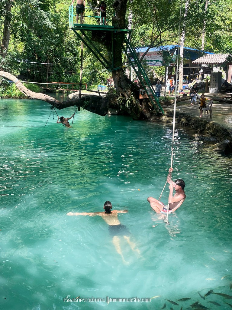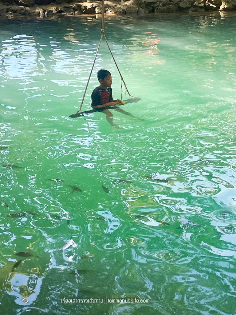 Blue Lagoon บ่อน้ำสีเขียวสวย ที่เคยมาแล้ว ยังไม่มีอะไรเปลี่ยนแปลง น้ำยังเขียวสวยเหมือนเดิม นักท่องเที่ยวอาจจะไม่มากเท่าตอนก่อนโควิดระบาด แต่ก็ไม่เงียบเหงา มีคนมาเล่นน้ำโดดน้ำกันพอสมควร คราวนี้ไม่ได้ปีนขึ้นถ้ำปูคำ ได้แต่นั่งเล่นริมน้ำกัน