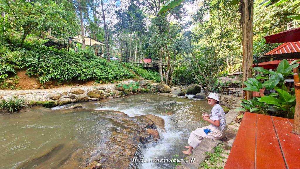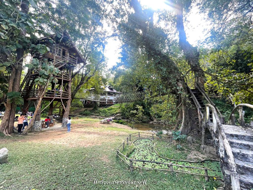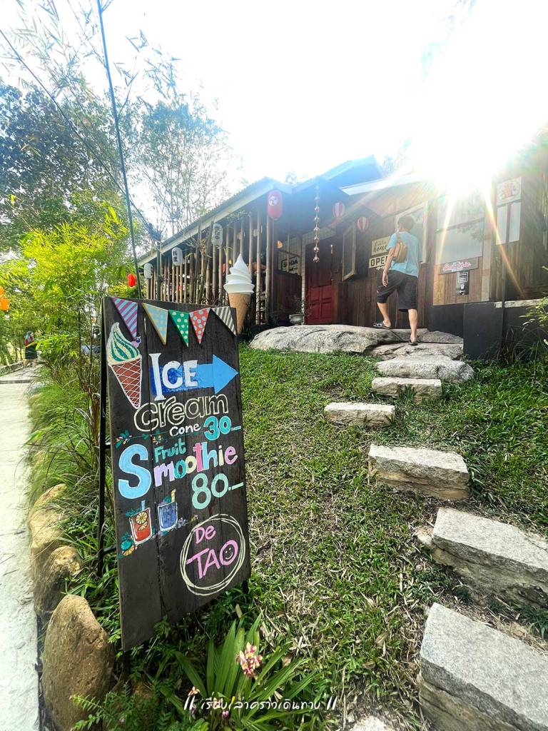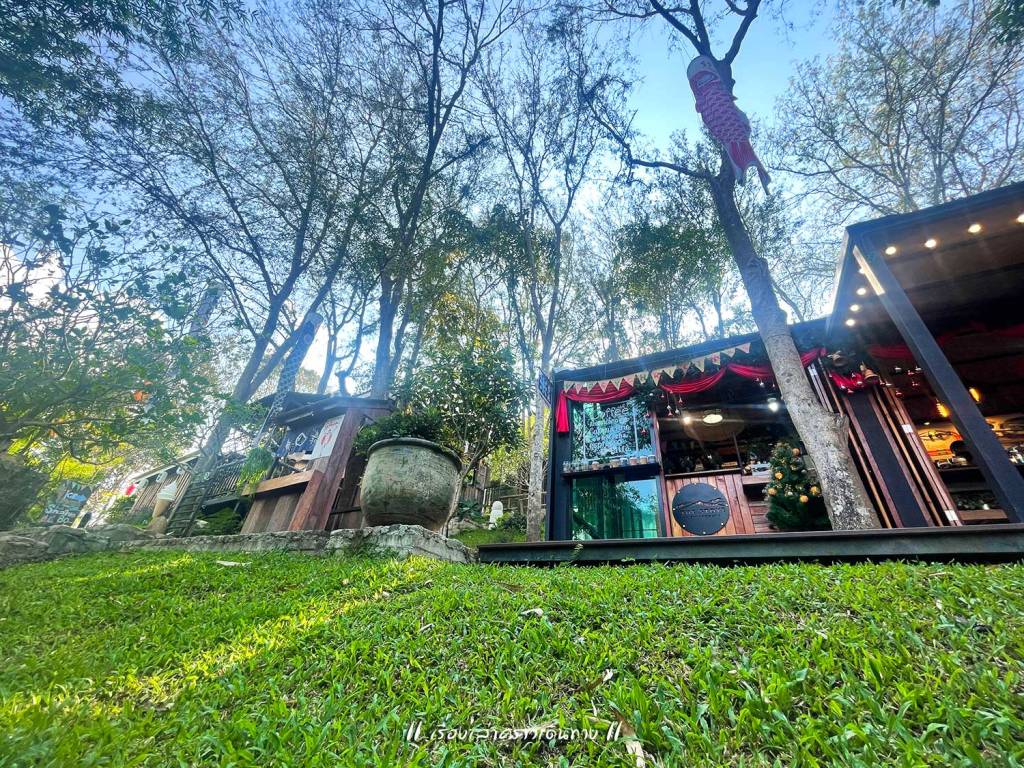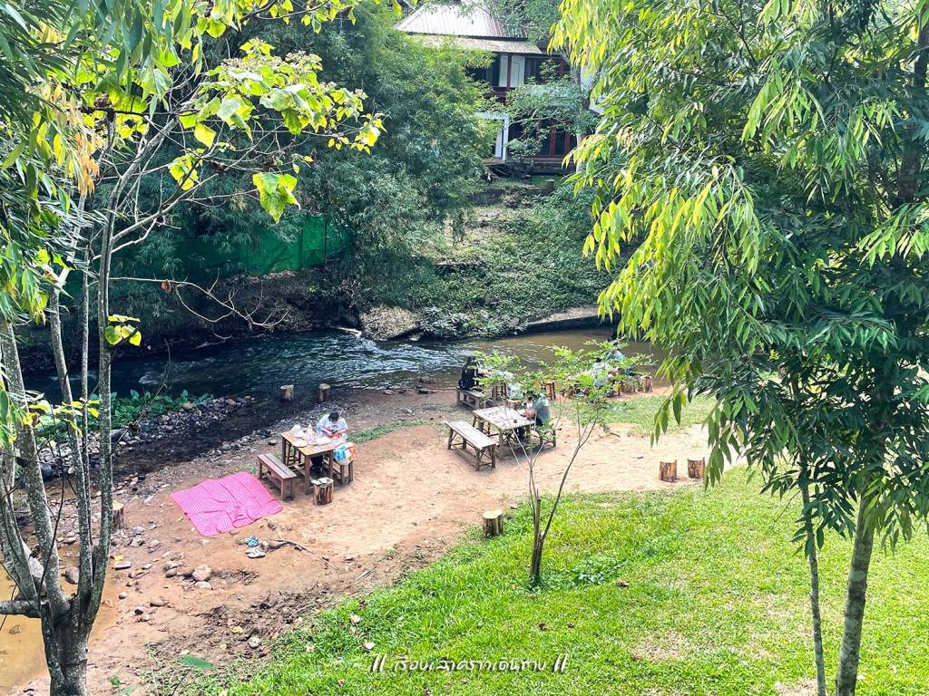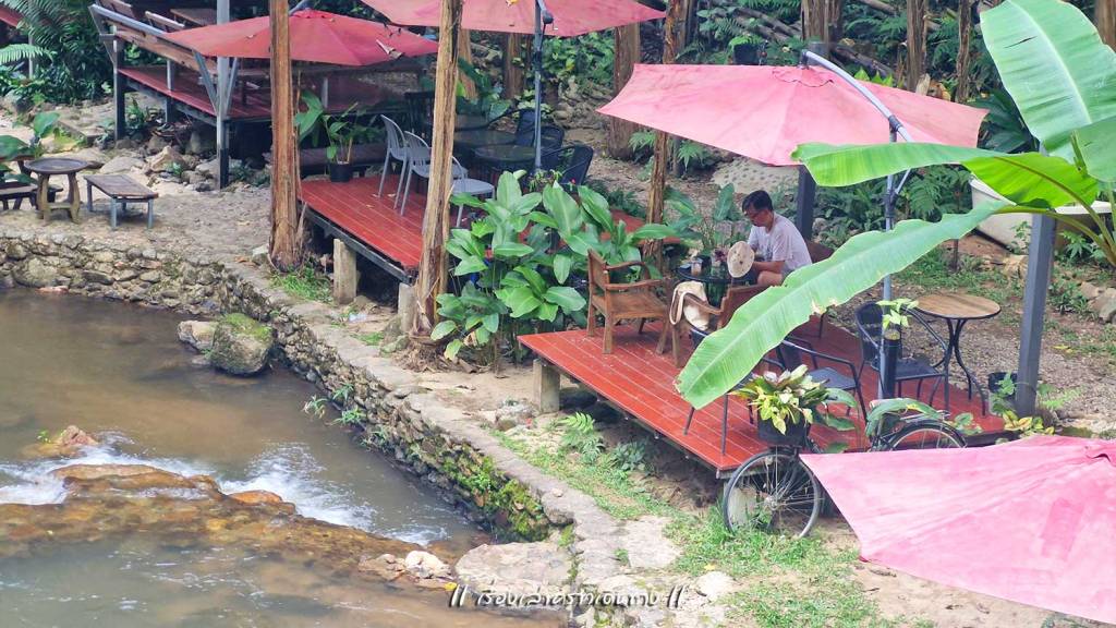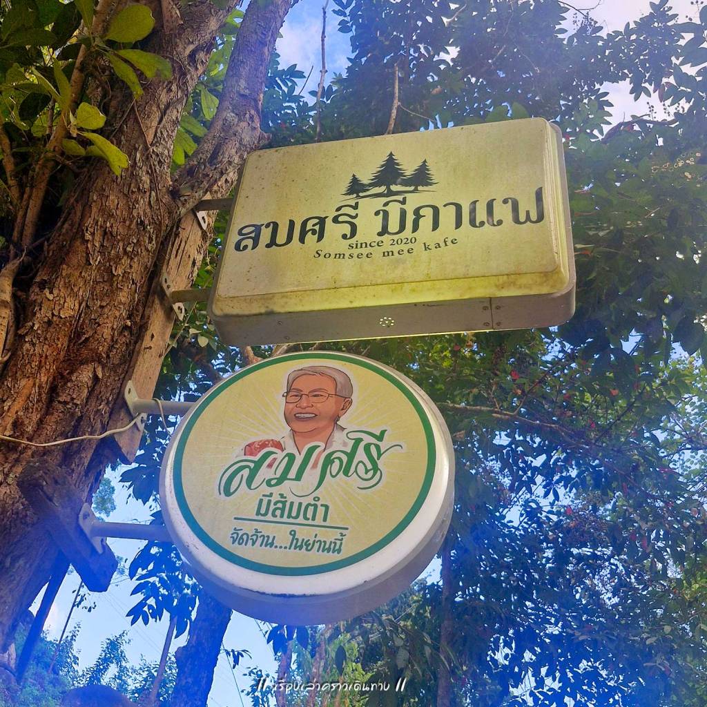 สุ่มเลือกร้านกาแฟไป 1 ร้าน บรรยากาศน่าประทับใจมาก ตัวบ้านไม้แทรกอยู่ในป่าครึ้มบนเนินสูง มีระเบียงให้นั่งชมวิวได้สบายๆ หรือจะไต่ลงไปที่ริมน้ำด้านล่างก็มีที่นั่งเล่นบรรยากาศดี กาแฟถือว่าใช้ได้ แต่ลืมถามว่าใช้เมล็ดของเทพเสด็จหรือเปล่านะ นอกจากกาแฟแล้ว ก็มีขายอาหารด้วย อย่างน้อยก็มีส้มตำ เพราะมีป้าย “สมศรีมีส้มตำ” อยู่ด้วย