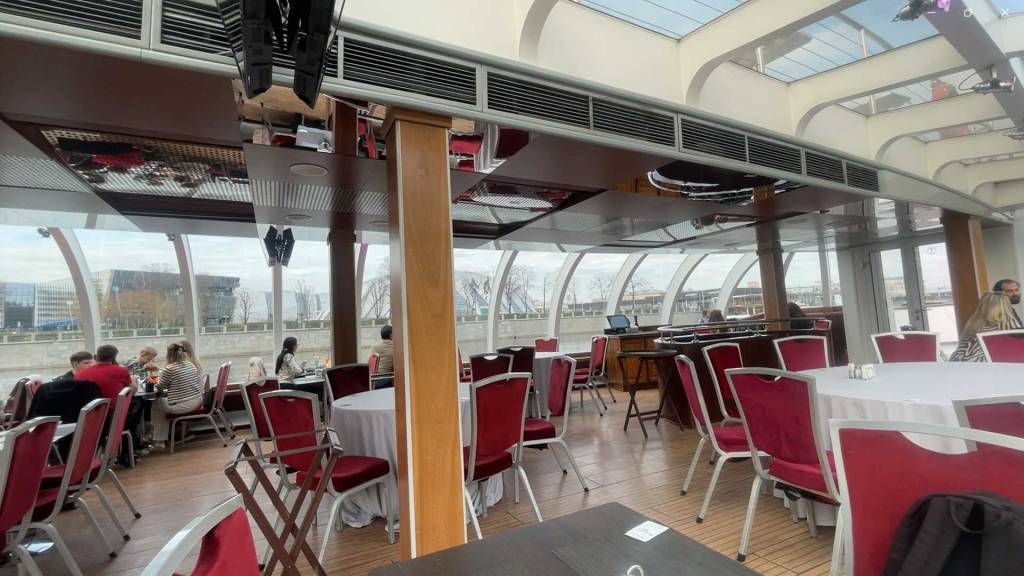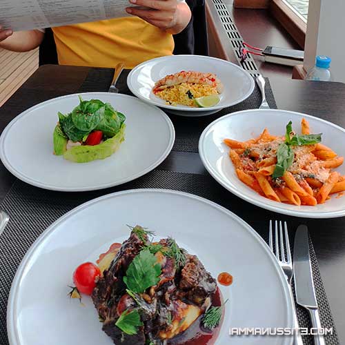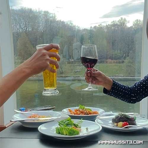 มอสโควตั้งอยู่ริมแม่น้ำมอสควา | Moskva River สถานที่สำคัญหลายๆที่ก็อยู่ริมแม่น้ำ ถ้ามีเวลา หรืออยากพักขาจากการเดินเที่ยวก็ลองมานั่งเรือชมทิวทัศน์เมืองมอสโควได้ “Flotilla Radisson Royal” เป็นลักษณะเรืออาหารแบบบ้านเรา ลงเรือไปก็ไปนั่งที่โต๊ะอาหาร แต่ชมวิวได้สะดวกเพราะเป็นกระจกทั้งด้านข้างและด้านบน มีชั้นดาดฟ้าด้านหลังไม่กว้างมาก น่าจะจัดเก้าอี้ให้นั่งได้ช่วงหน้าร้อน เรือแต่ละรอบใช้เวลาล่องประมาณ 2.5 ชม. มีรอบเรือ 3 รอบต่อวัน พวกเราเลือกรอบบ่าย 3 นั่งชมวิวไปด้วยทานอาหารกลางวัน+เย็นไปด้วยเลย ราคาล่องเรือ 1600 รูเบิลต่อคน ไม่รวมอาหาร จะสั่งแต่เครื่องดื่มมานั่งจิบไปชมวิวไปเขาก็ไม่ว่า (รายการอาหารและราคามีในเวปไซต์ เข้าไปดูก่อนได้) มื้อนี้เราสั่งอาหาร พร้อมเบียร์และไวน์ รวมราคาแล้ว 6000 รูเบิล (ประมาณ 3000 บาท) เป็นมื้อสั่งลามอสโคว และลารัสเซีย ล่องเรือเสร็จก็เรียกแท้กซี่ไปสนามบินเลย
