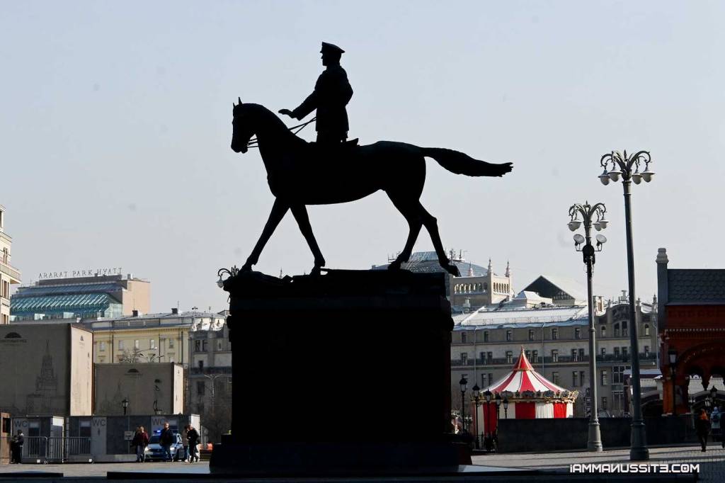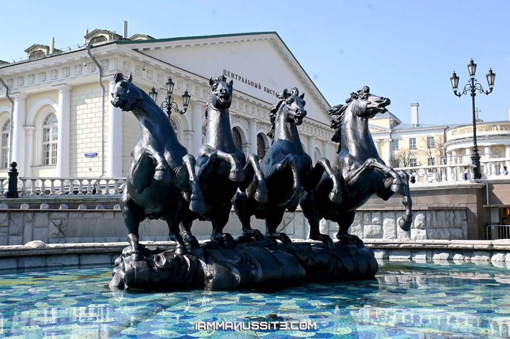 Fontaine des Quatre Saisons, รูปปั้นม้าในบ่อน้ำพุกับ Moscow Manege (Exhibition & Trade Center) ด้านหลัง