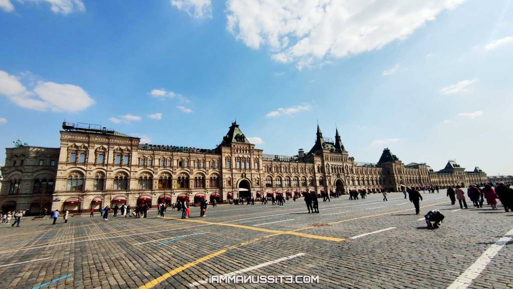 เข้ามาในลานกว้างมองตรงไปจะเจอกับหมุดหมายสำคัญที่เป็นภาพจำของนักท่องเที่ยวเวลามามอสโควกับโบสถ์หัวหอมสีสันสดใส นั่นคือ St. Basil Cathedral ด้านซ้ายเป็นอาคารสวยงามยาวตลอดแนวคือห้างสรรพสินค้าหรูหรานามว่า Gum ฝั่งขวาจะมองเห็นแนวกำแพงยาวด้วยอิฐแดงกับยอดหอคอยเป็นระยะๆ นั่นคือแนวรั้วของ Kremlin Palace และด้านหลังก็จะเป็น State Historical Museum