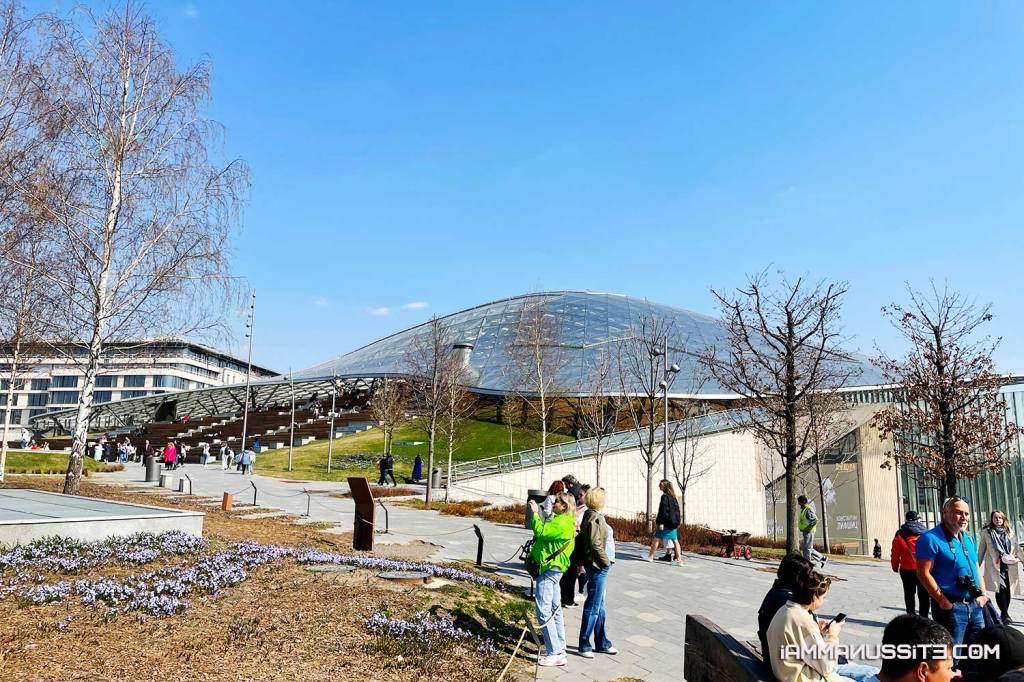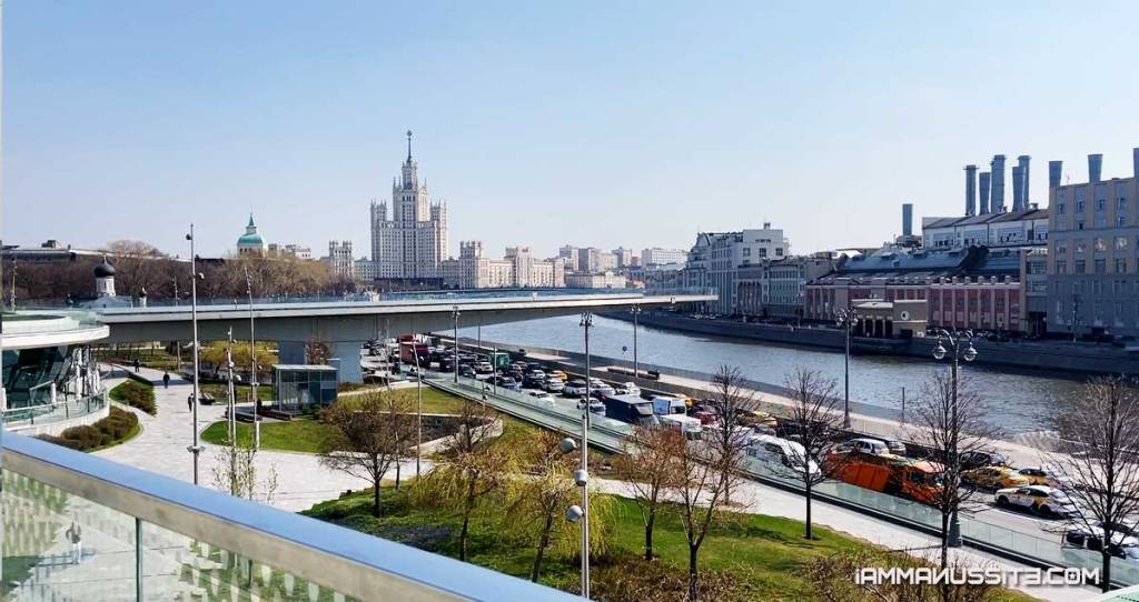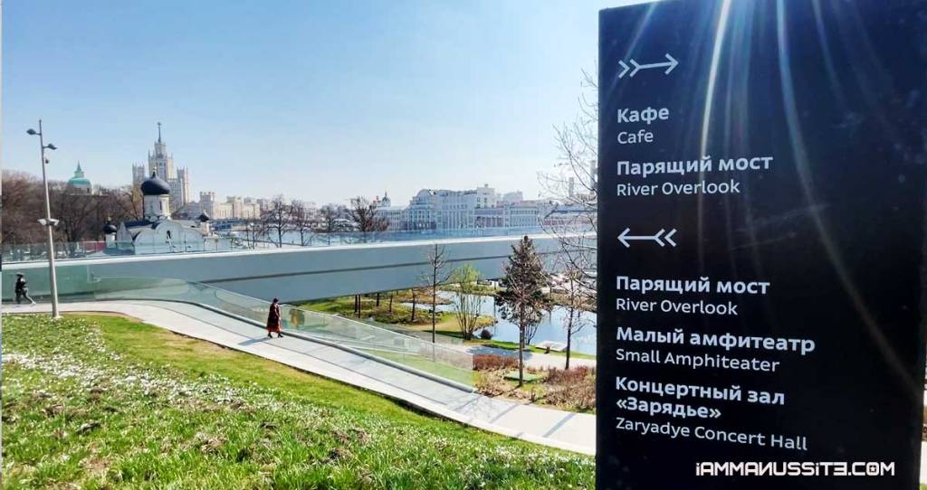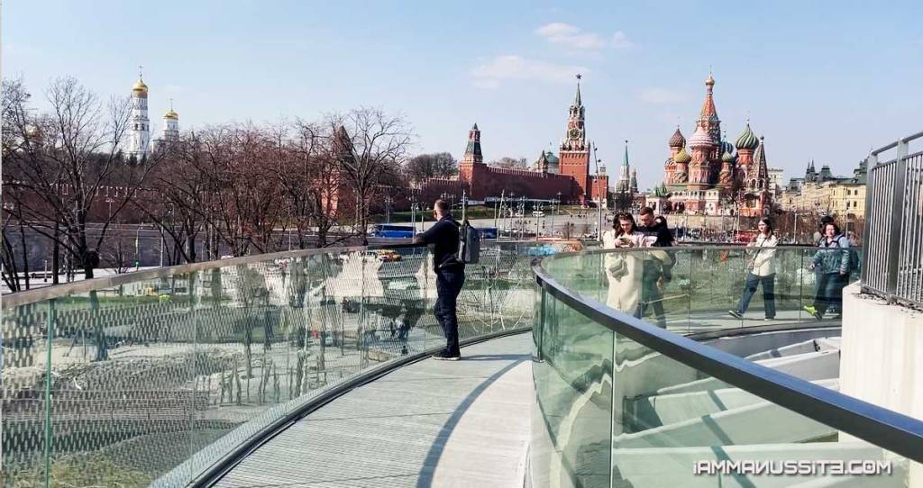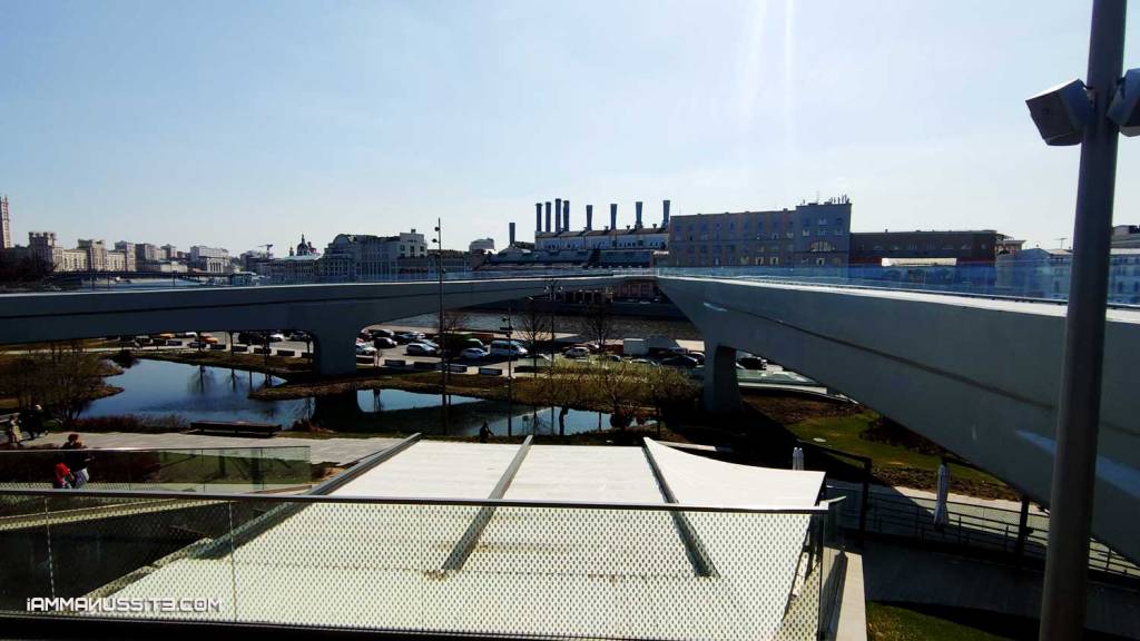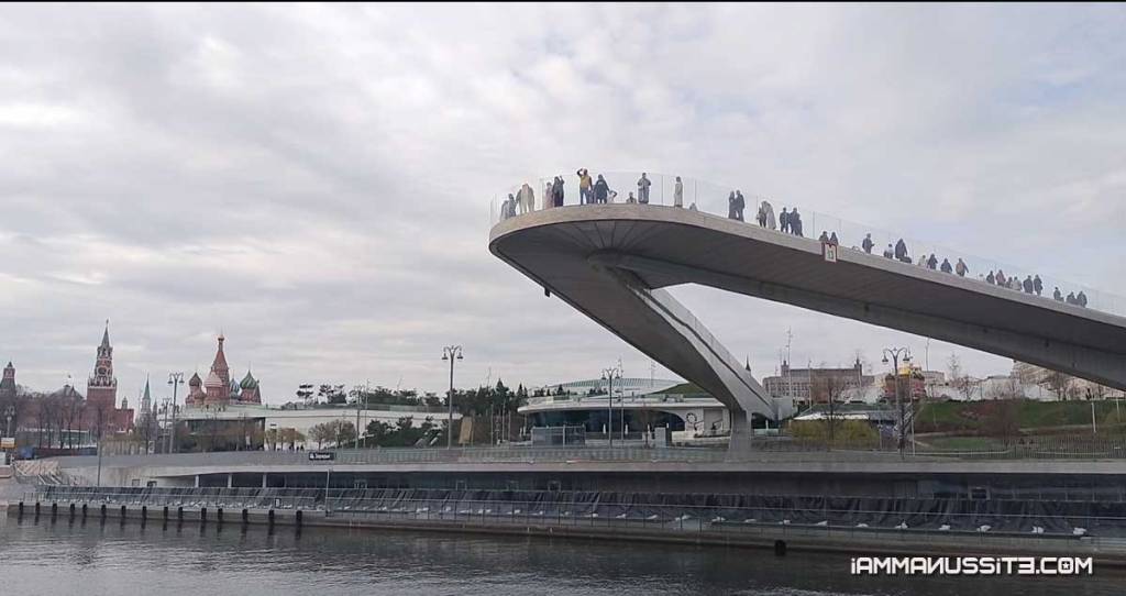เดินจาก St. Basil Cathedral ไปทางสะพาน Bolshoy Moskvoretsky จะเจอ Zaryadye Park เป็นลานกิจกรรม มีสวนดอกไม้ มีร้านอาหาร มีสะพานชมวิว และเลยไปอีกไม่ไกลจะเป็นสะพานชมวิวสร้างใหม่ Floating Bridge ที่โค้งเป็นเกือกม้ายื่นไปในแม่น้ำ วันที่เราไปเขากั้นปิด บอกว่าปรับปรุงทาสี เลยไม่ได้เข้าไปเดินด้านใน แต่วันที่มาล่องเรือ เห็นว่าสะพานเปิดแล้ว น่าเสียดาย