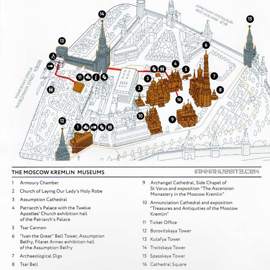 ในพระราชวังเครมลิน เปิดให้เข้าไปเที่ยวได้โดยแบ่งเป็น 2 ส่วนคือ Armory Chamber กับ Architectural Complex of Cathedral Square ทางเข้าทั้ง 2 ส่วนไม่ได้อยู่ด้านจัตุรัสแดง แต่ต้องเดินเข้าถนนด้านข้าง Historical Museum เลาะรั้วเครมลินไปด้านหลัง เดินผ่าน Alexander Garden ไปก็จะเจอที่ขายบัตร