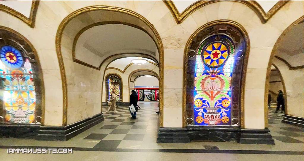 ออกแบบโดยสถาปนิกชื่อดังในยุคสตาลิน ให้ตรงกลางของแต่ละเสา จะมีกระจกสีโค้งส่องสว่างจากภายใน