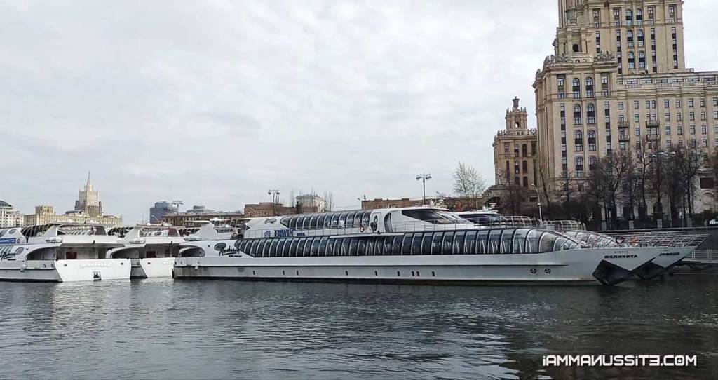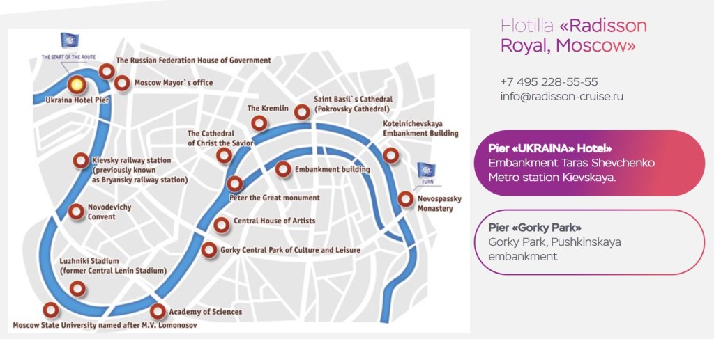 เรือจะออกจาก Pier Hotel UKRAINA ล่องไปตามแม่ Moskva ผ่านจุดเด่นของมอสโตวหลายจุดตามแผนที่ไปจนถึงแถว Red Square แล้ววนกลับ