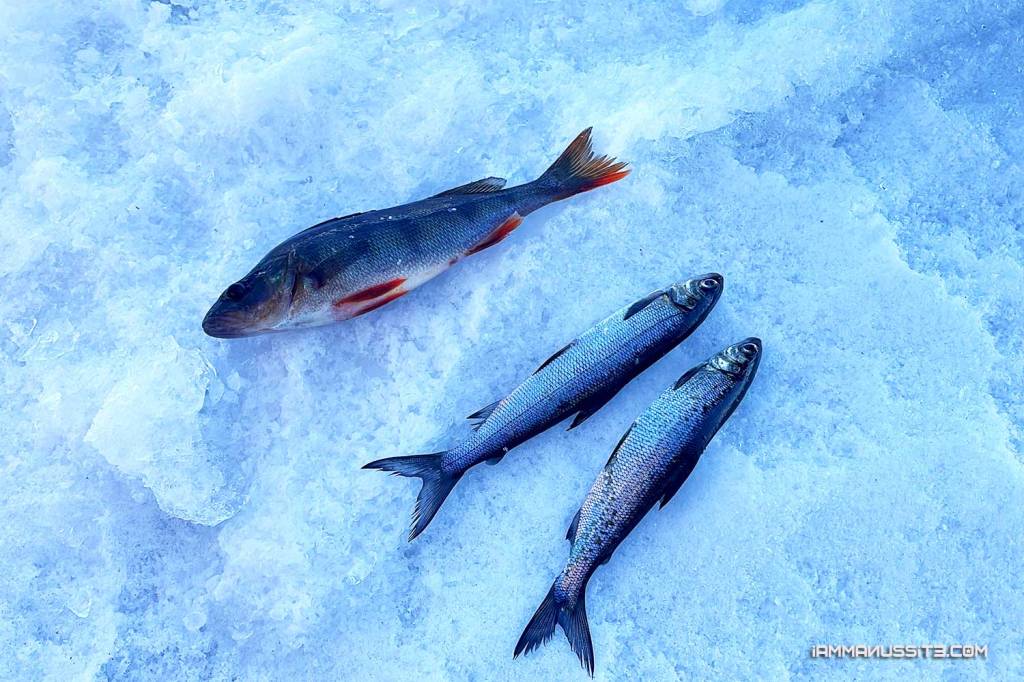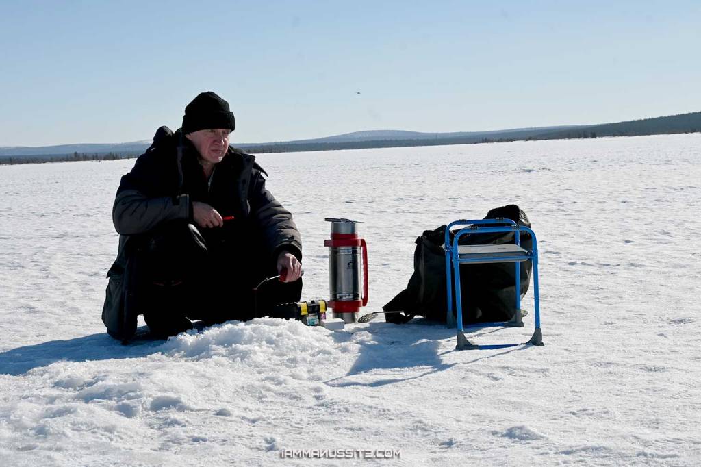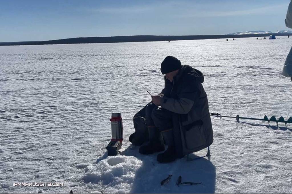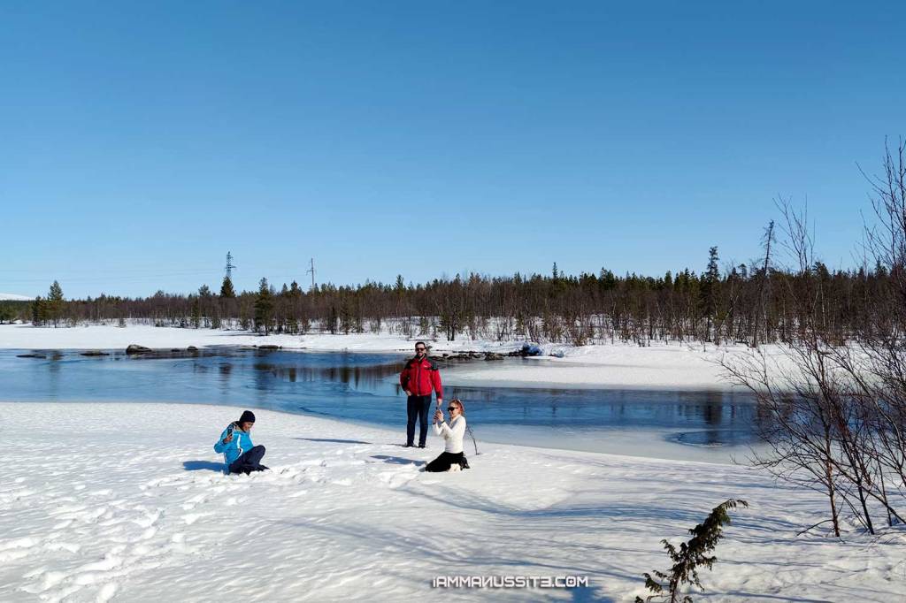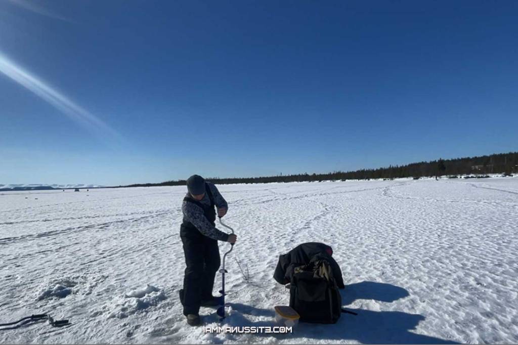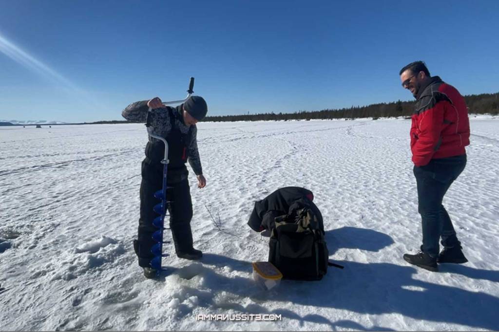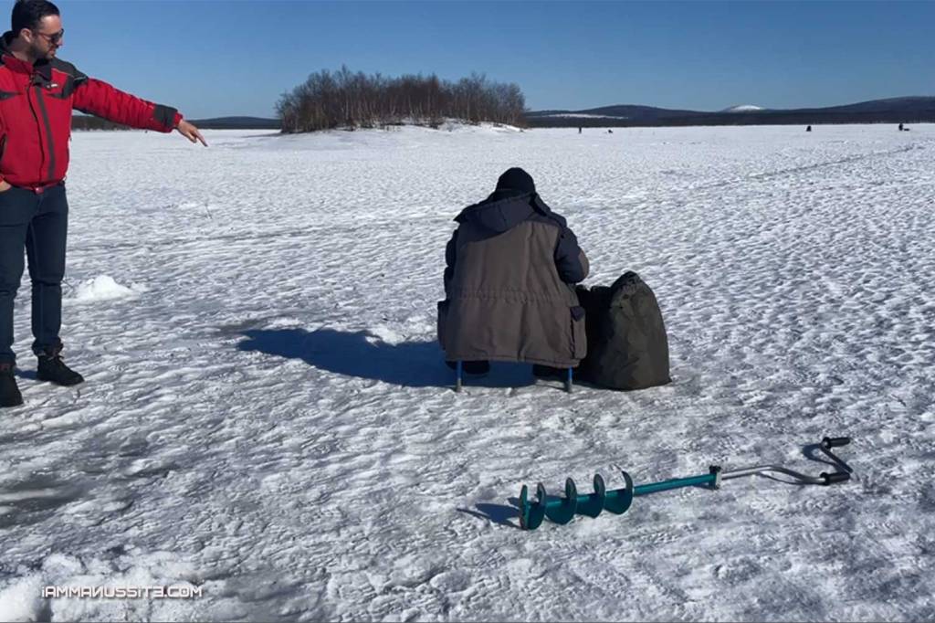 ระหว่างทางไป คุยกับไกด์อดัมว่าพวกเราอยากเห็นคนตกปลาในน้ำแข็ง ถ้าเจอให้แวะพาดูหน่อย อดัมก็พาแวะทะเลสาบข้างทาง มีคนมาเจาะรูแล้วตกปลากันเยอะเลย