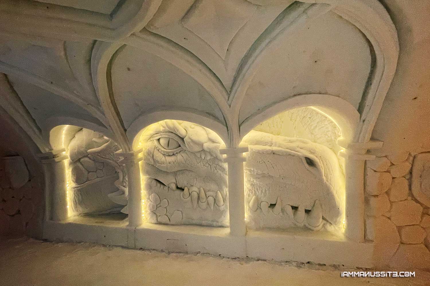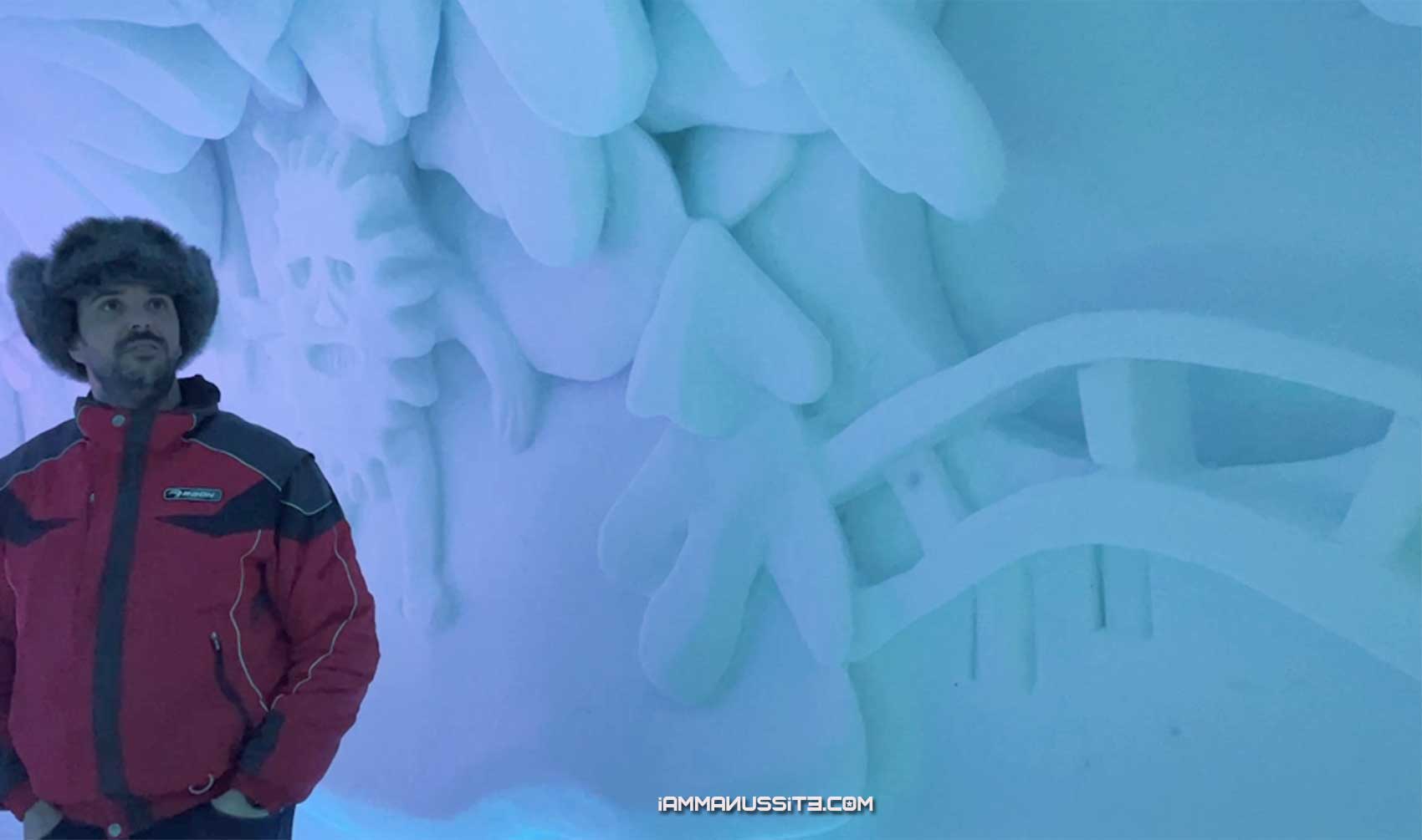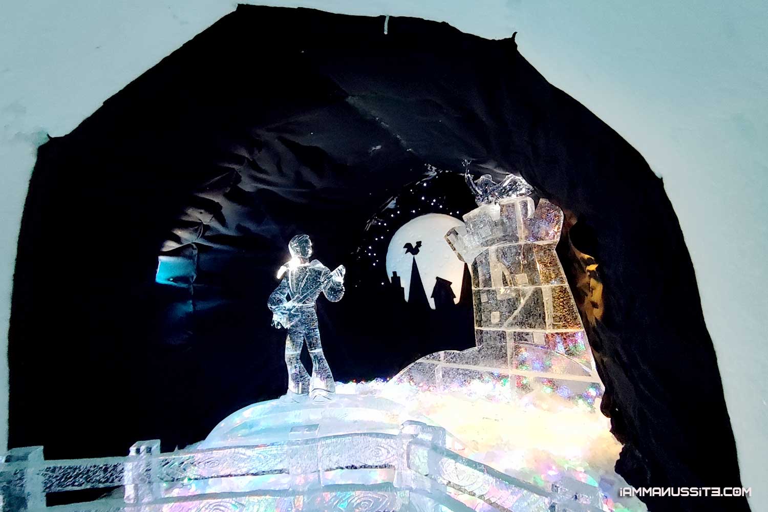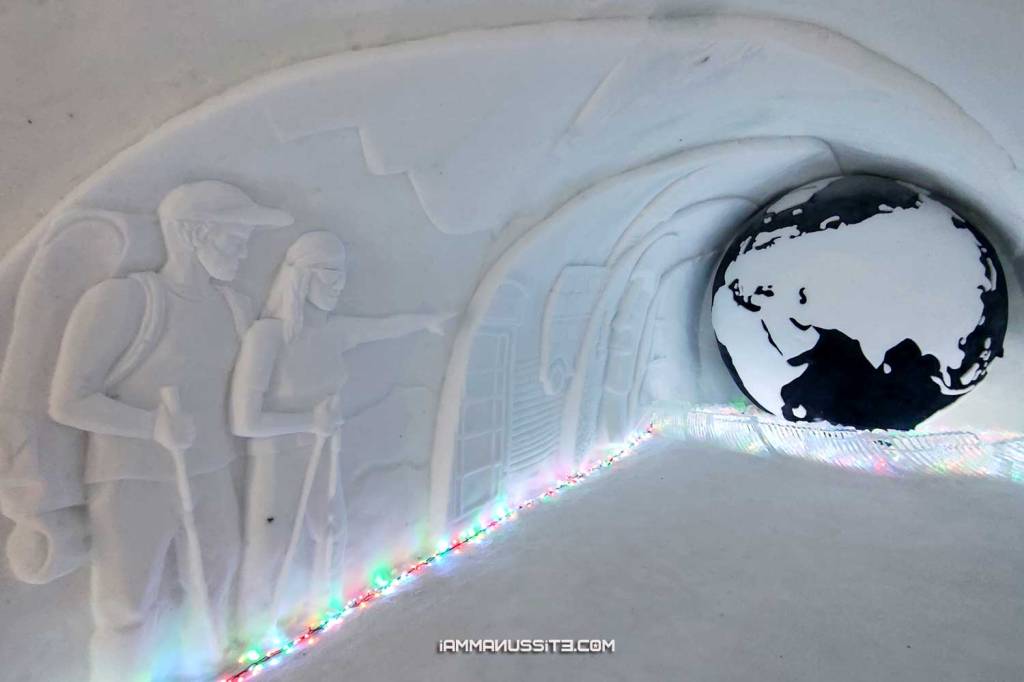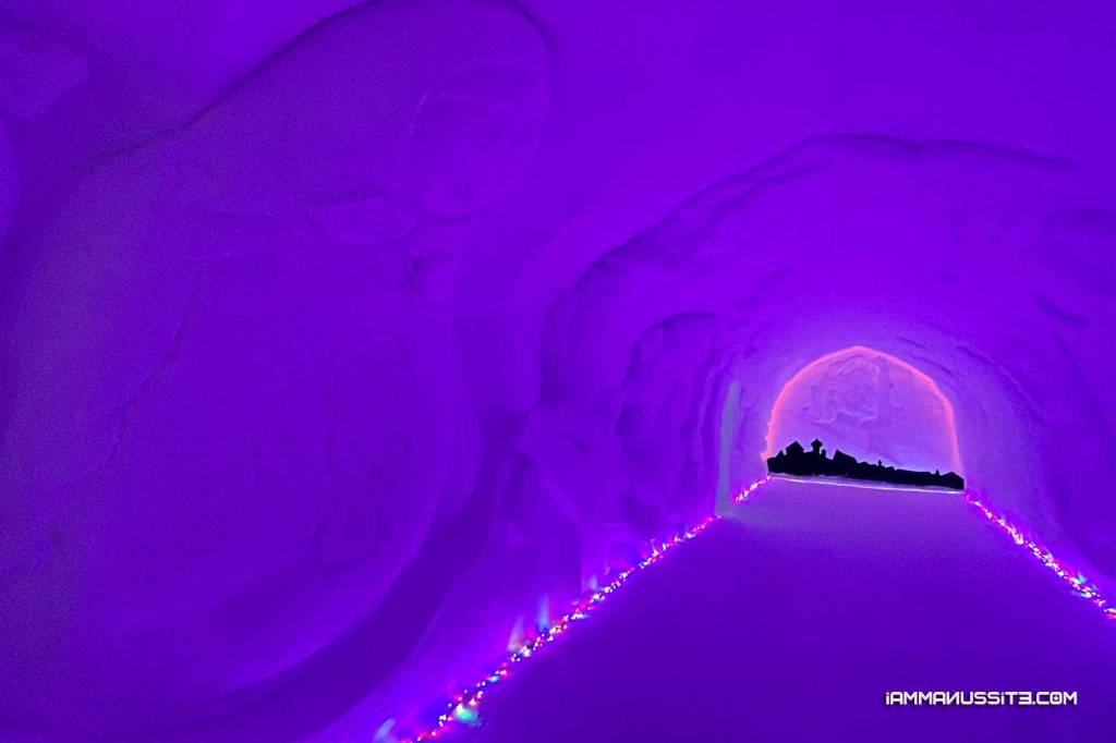จุดท่องเที่ยวที่นักท่องเที่ยวนิยมไปอีกจุดคือ หมู่บ้านหิมะ ที่สร้างจากหิมะและน้ำแข็ง ชื่อหมู่บ้านแต่ความจริงเป็นเหมือนอุโมง ที่สร้างเป็นห้องต่างๆ ตกแต่งด้วยหิมะกับน้ำแข็งสลัก อารมณ์เหมือนน้ำแข็งสลักงานแต่งงานแต่เยอะและสวยกว่า มีส่วนที่เป็นห้องโถงมีบาร์เครื่องดื่มยาวๆ ที่สามารถมาเช่าจัดเลี้ยงได้ด้วย