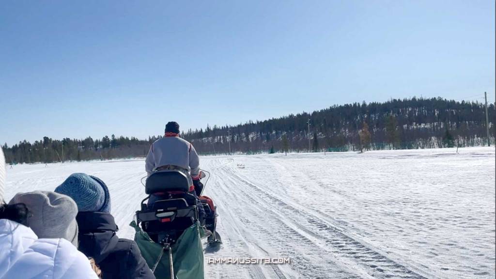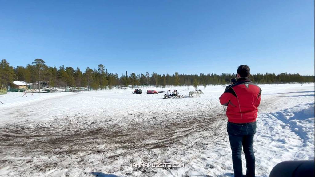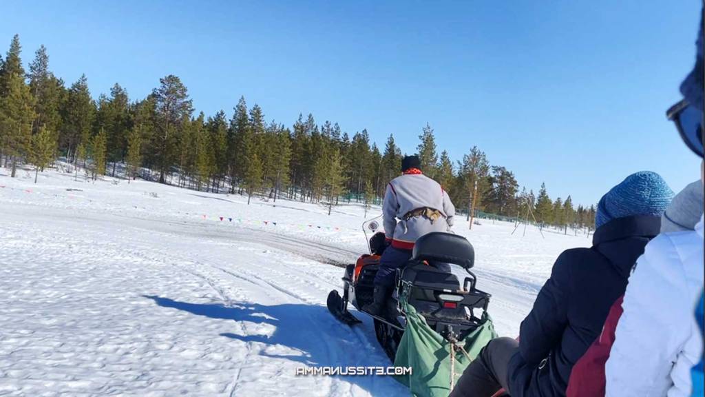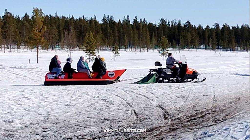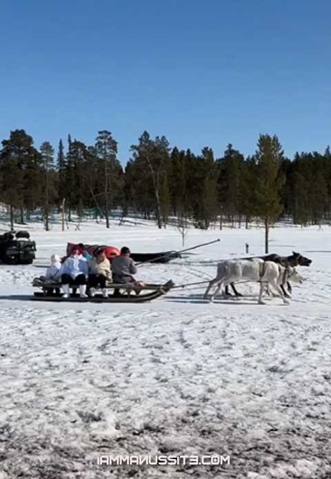 กิจกรรมสุดท้ายน่าจะสนุกสุด คือการนั่งลากเลื่อนโดยเรนเดียร์ ตอนแรกที่รู้ว่าจะได้นั่งลากเลื่อนนึกว่าจะลากเข้าไปในป่า แต่ความจริงแล้วเป็นสนามพาวิ่งวนเป็นรอบๆ อารมณ์เหมือนนั่งรถแข่งในสนามพัทยาเซอร์กิต ลุงเป็นคนบังคับเรนเดียร์เอง ยิ่งพวกเรากรี๊ด ลุงยิ่งเร่งให้เรนเดียร์วิ่งเร็วเพิ่มไปอีก เข้าโค้งทีตัวแทบหลุดออกจากลากเลื่อน กวางเรนเดียร์นี่วิ่งเร็วกว่าที่คิดจริงๆ ลุงน่าจะชอบพวกเรา ปกติวิ่งกันคนละ 3 รอบ ลุงแถมให้พวกเราเป็น 4 รอบ ยังไม่หมดแค่นี้ มีนั่งเรือกล้วยยอดนิยมอีกคนละ 3 รอบ ลุงขับ Snow mobile ให้อีกเช่นเคย ซิ่งสุดๆเช่นเคยด้วย