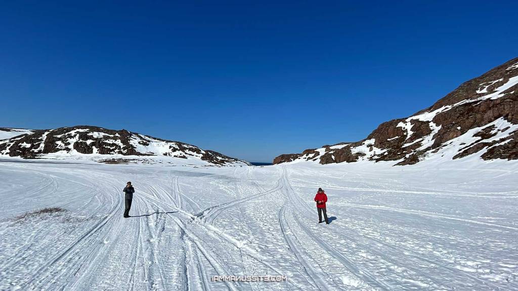 กิจกรรมที่คนมาถึง Teriberka ควรต้องทำคือการไปเที่ยว Teriberka Nature Park ต้องนั่งรถออกจากหมู่บ้านไปอีกหน่อย แล้วไปนั่งรถลาก ที่มี Snow Mobile ลากผ่านทุ่งกว้างที่หิมะขาวโพลนกับทะเลสาบที่ยังเป็นน้ำแข็งอยู่ หนาวจนแก้มตึงแต่ประทับใจมาก นั่งไปสักพักจอดแล้วลงเดินอีกไม่ไกลเพื่อไปตรงหน้าผาที่เดนิสชี้ให้ดูว่ามีน้ำตกชื่อ Battery fall อยู่ตรงนี้ เป็นน้ำจากทะเลสาบ Battery Lake ไหลมาลง Barents Sea แล้วไหลไปลงมหาสมุทรอาร์คติคอีกที แต่ตอนนี้เห็นเป็นน้ำแข็งและทะเลสาบนั้นคือพื้นที่พวกเราเดินกันมานั่นแหละ ถามว่าปลอดภัยที่จะเดินมั๊ย คือระบบเขาค่อนข้างดี มีเจ้าหน้าที่คอยสกีเพื่อตรวจสอบความแข็งของผืนน้ำแข็งตลอดเวลา