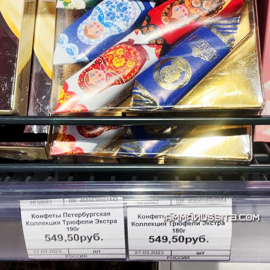 ของฝากที่เห็นคนชอบซื้อกันอีกอย่างคือขนม พวกลูกอมหรือชอคโกแลต ก็ไม่รู้ทำไม แต่เราก็ซื้อมานะ อันที่เห็นคนชอบรีวิวคือยี่ห้อเด็กน้อย บางคนเรียกชอคโคแลตเด็กหน้าโง่ เราว่าหน้าตาน่ารักดีออก ราคาก็พอประมาณ ถ้าซื้อเป็นของฝากแล้วเลือกเอาแบบมีรูปมีสัญญลักษณ์รัสเซียมันก็จะแพงแบบไร้เหตุผล ก็เลยไม่ได้ซื้อ ชอคโกแลตหน้าปูตินก็แพง อันที่พยายามหาซื้อแต่หาไม่เจอคือ ลูกอมวอดก้า