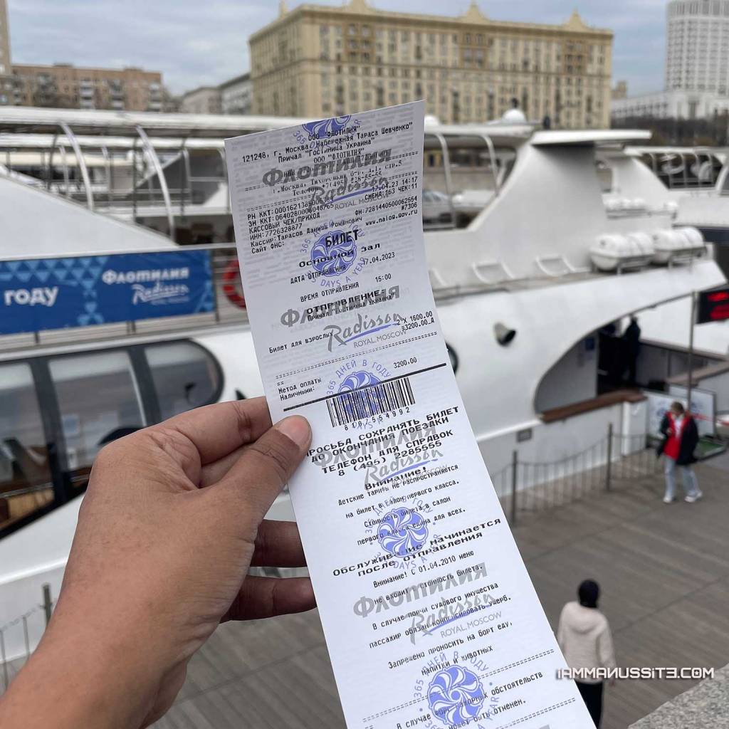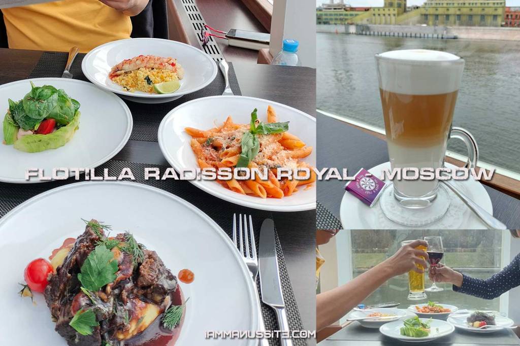 ล่องเรือแม่น้ำ Moskva พร้อมทานอาหาร หรือจิบเครื่องดื่ม มี 3 รอบต่อวัน (หน้าร้อนมี 5-6 รอบต่อวัน) พวกเราเลือกรอบบ่าย 3 นั่งชมวิวไปด้วยทานอาหารกลางวัน+เย็นไปด้วยเลย ราคาล่องเรือ 1600 รูเบิลต่อคน ไม่รวมอาหาร จะสั่งแต่เครื่องดื่มมานั่งจิบไปชมวิวไปเขาก็ไม่ว่า (รายการอาหารและราคามีใน เวปไซต์ เข้าไปดูก่อนได้) มื้อนี้เราสั่งอาหาร พร้อมเบียร์และไวน์ รวมราคาแล้ว 6000 รูเบิล (ประมาณ 3000 บาท)