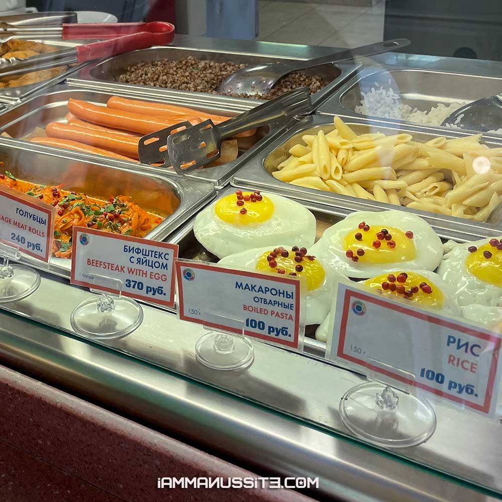 บางวันเหนื่อยมาก ขี้เกียจออกไปกินข้าวนอกที่พัก ก็เลยเข้าซุปเปอร์ซื้อของไปกิน ซึ่งอาหารเป็นอาหารสำเร็จพร้อมตัก ราคาตามน้ำหนักเหมือนซุปเปอร์บ้านเรานั่นแหละ คิดเงินออกมาแล้วมันแพงนะ ไม่ได้ถูกเลย อาหารแค่ 2 จานนั้นกับน้ำ 2-3 ขวด 1000 รูเบิล ตก 500 บาท ไปกินตามร้านก็ราคาประมาณนี้แต่อาหารดีกว่าอีก ใครบอกอาหารรัสเซียถูก เถียงเลยนะ