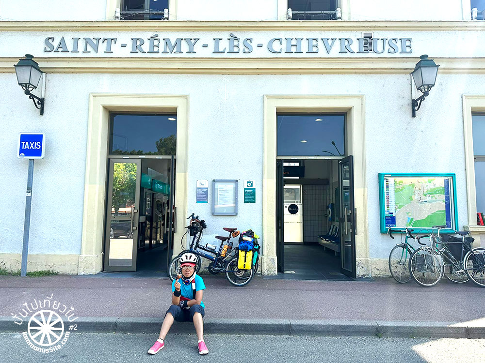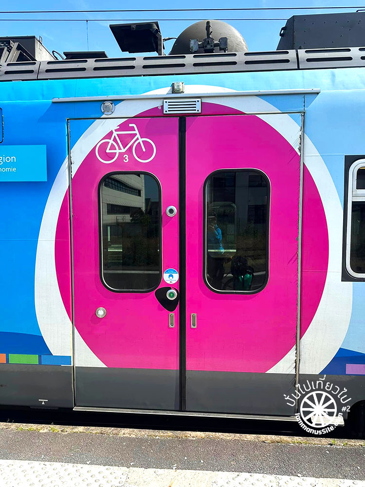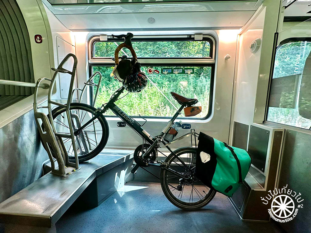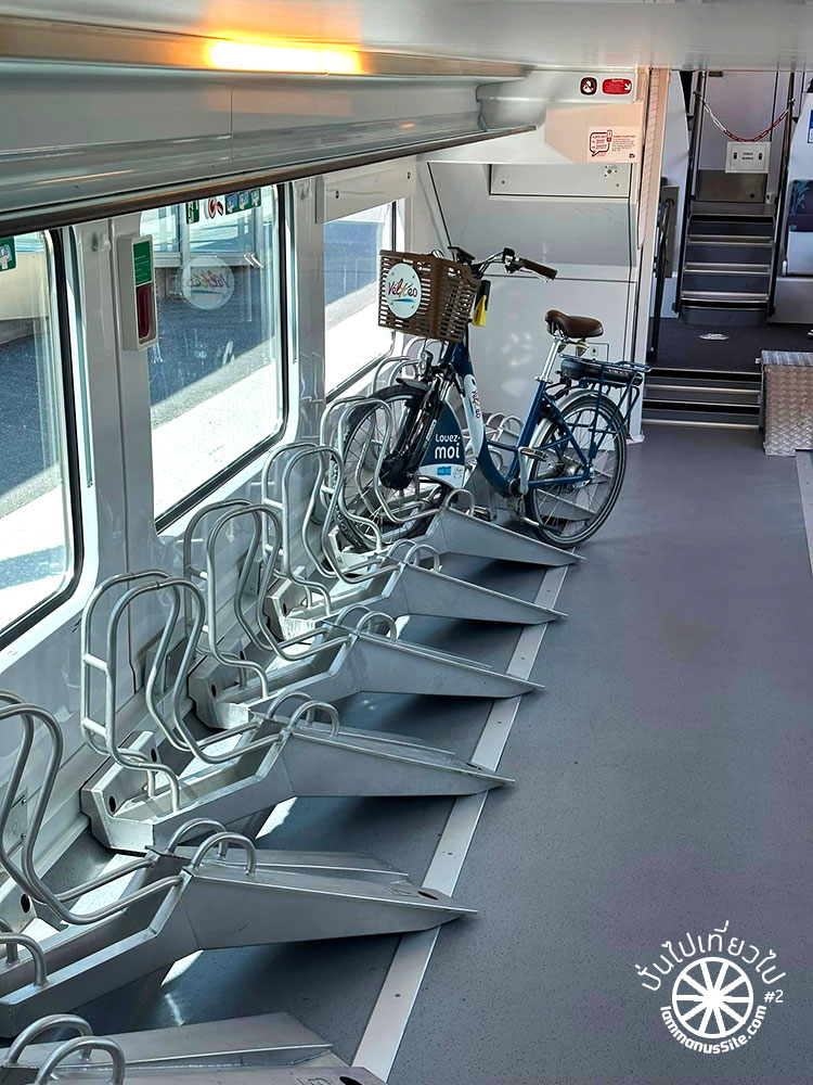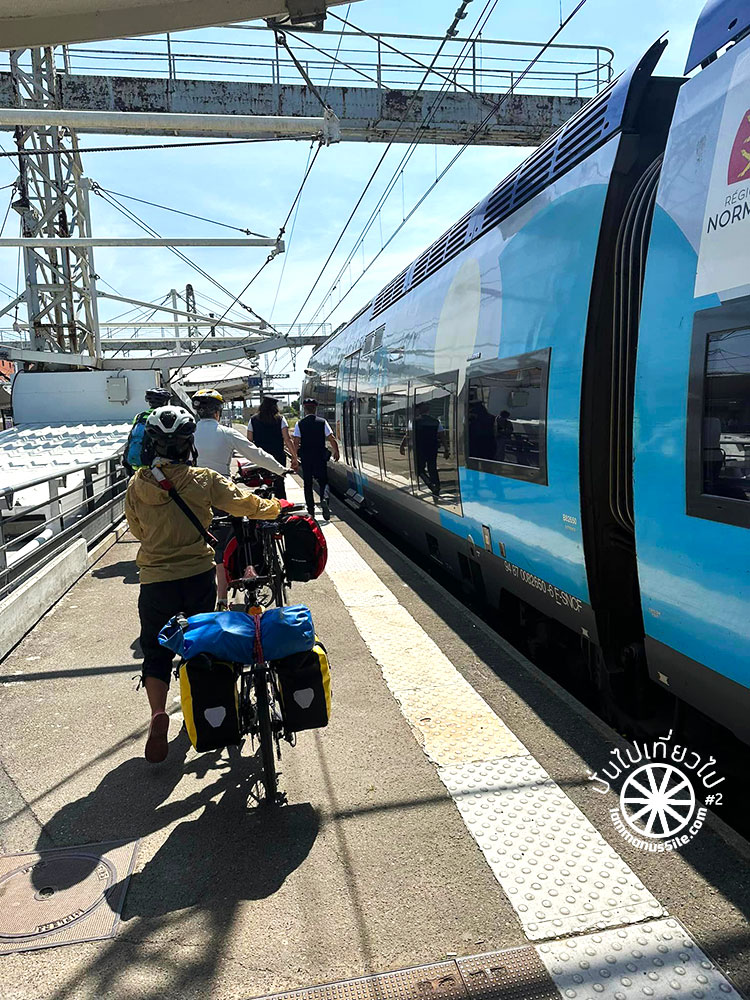 ขึ้นรถไฟฝรั่งเศสสะดวกมาก เป็นรถไฟท้องถิ่นของ Normandy ที่สำคัญคือไม่ต้องยกจักรยานขึ้นรถไฟเลย จอดเทียบในระดับเดียวกับชานชลา และพนักงานใจดีมาก ตู้จักรยานเต็ม ก็เดินหาตู้อื่นให้ เพื่อให้มีพื้นที่จอดจักรยานให้พอ จักรยานไม่มีค่าใช้จ่ายเพิ่ม เป็นการส่งเสริมการท่องเที่ยวด้วยจักรยานที่ดีมาก