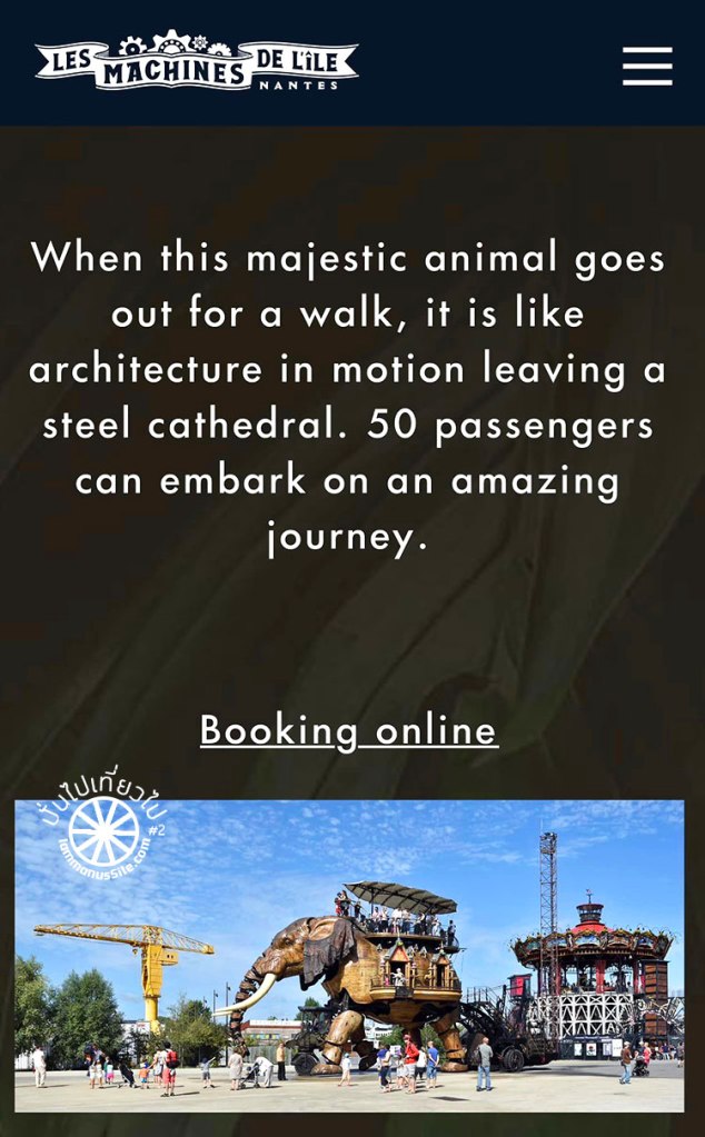 งานแสดงตอนนี้คือ “The Grand Eléphant หรือ “หุ่นช้างยักษ์” สูง 12 เมตร สร้างจากเศษเหล็กของเรือเก่าและไม้ หนัก 48 ตัน เมื่อเสร็จเรียบร้อย เจ้าช้างยักษ์จะเดินได้ ด้านบนรับนักท่องเที่ยวได้ 50 คน เวลาช้างเดินคงจะน่าตื่นเต้นดีไม่น้อย