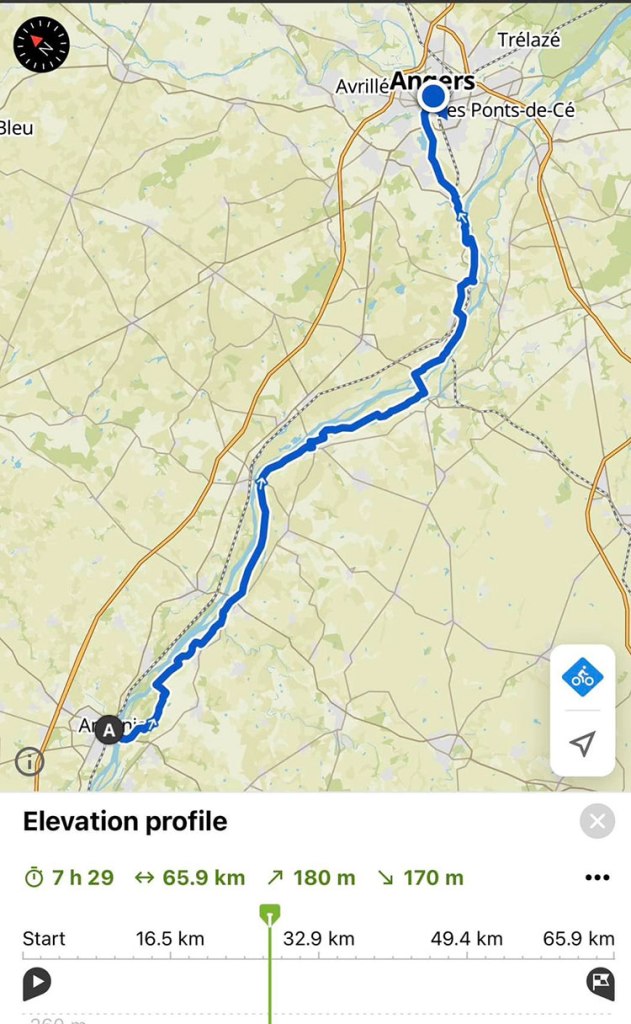 วันนี้เริ่มปั่นจากเมือง Angers ไปเมือง Saumur ตามเส้นทาง La Loire Velo ปรากฎว่าเส้นทางที่ Komoot ตั้งให้ไปอีกเส้นทางหนึ่ง เพื่อเลี่ยงการข้ามแม่น้ำ ลองขยายแผนที่เข้าไปดูก็เป็นทางจักรยานที่ต้องข้ามแม่น้ำ และไม่มีรูปสะพาน ชัดเจนว่า Komoot เตือนแล้วว่าต้องเปลี่ยนเส้นทาง แต่ลองไปอ่านป้ายข้อมูลใน trail จักรยาน มีรายละเอียดว่าจะมีเรือข้ามให้ ก็เลยตัดสินใจไปตามทางเส้นทาง La Loire Velo