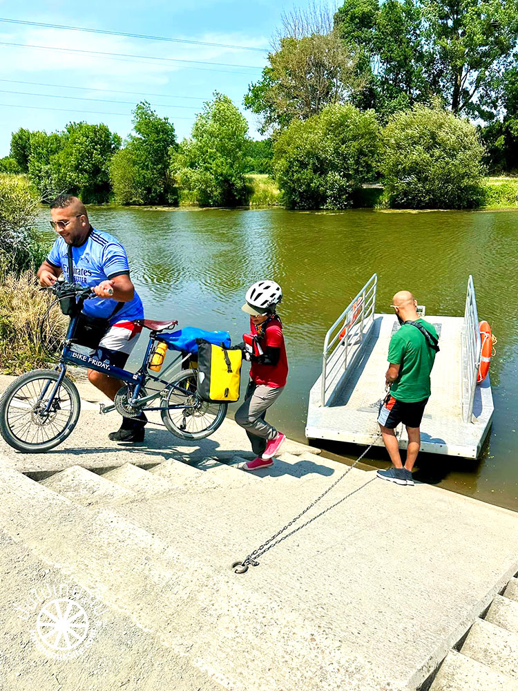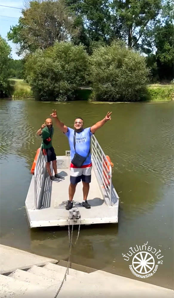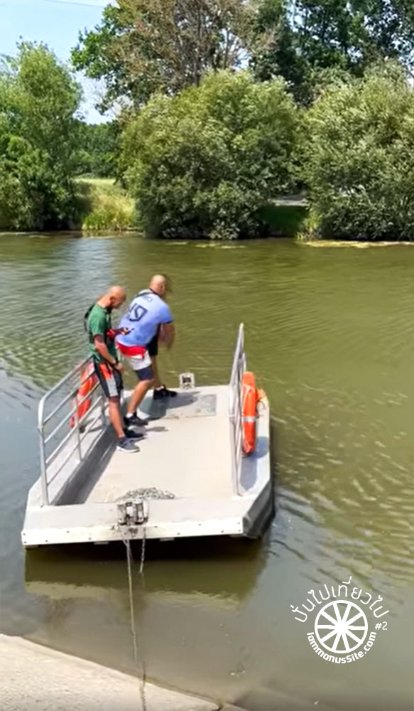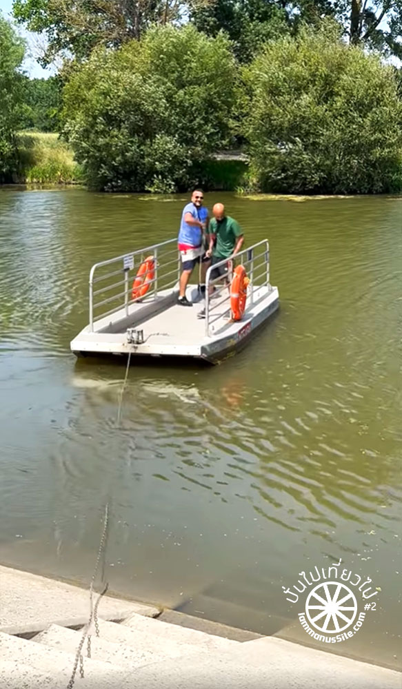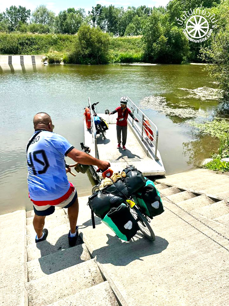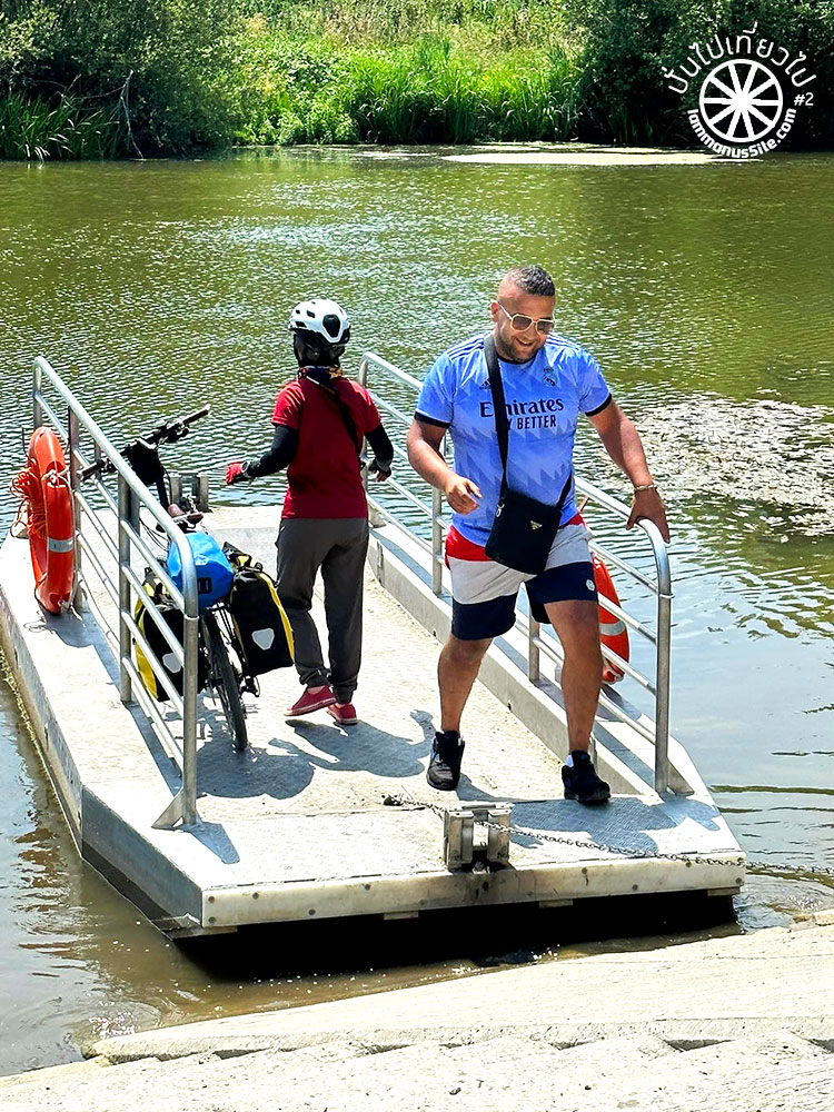 พอไปถึงแม่น้ำ ก็เห็นแพเหล็กอยู่อีกฝั่งของแม่น้ำ หันไปมองหน้ากัน แล้วก็บอกว่า “สงสัยต้องย้อนกลับไปทางเดิม” แต่คุณพี่สายตาไวมาก เห็นหนุ่มสองคนนั่งอยู่ จึงเข้าไปทักทาย “Excuse me” แล้วก็อธิบายว่าเราอยากจะข้ามแม่น้ำ ยังอธิบายไม่เสร็จ ทั้งสองหนุ่มลุกขึ้นไปลากโซ่เพื่อดึงเรือจากอีกฝั่งมา หลังจากนั้นก็จัดการยกจักรยานพร้อมสัมภาระรวมแล้วน่าจะเกือบ 25 กิโลเมตร ลงไปบนเรือเหล็กอย่างรวดเร็ว เรายังยืนงงกันอยู่เลย