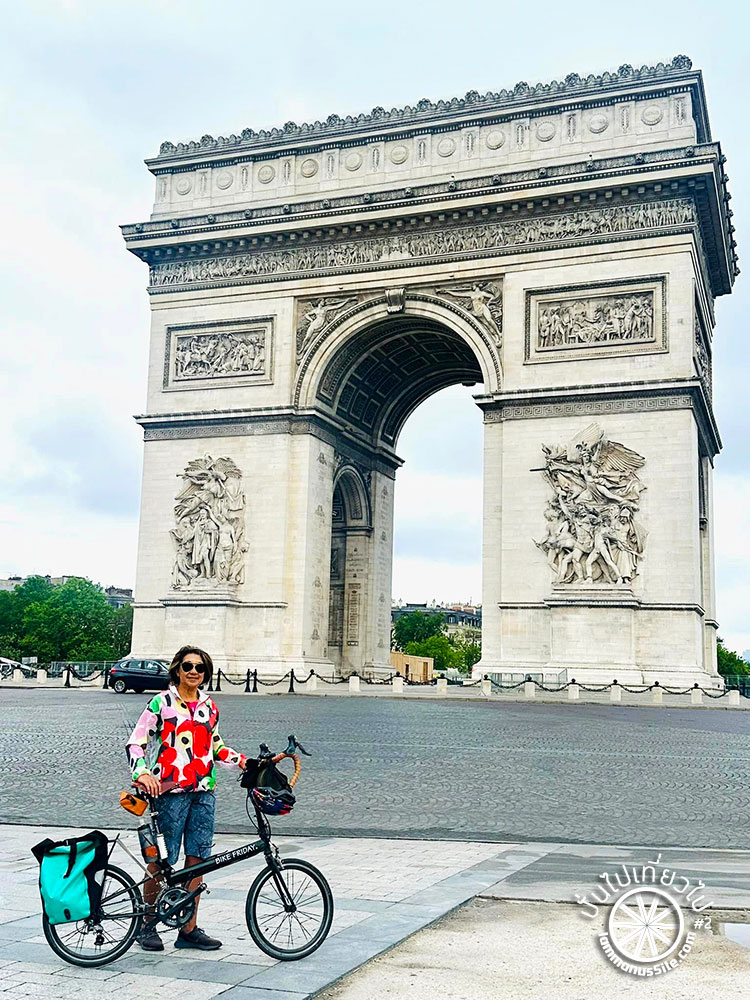 ป้าสองคนมึนมากเจอวงเวียนตรง Arc de Triomphe (ประตูชัย) ไปไม่เป็นเลย ไม่รู้จะวนยังไงดี สุดท้ายจูงจักรยานเดินดีกว่า