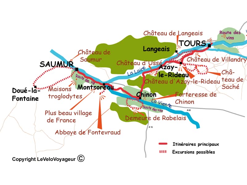 ทัวร์จักรยานส่วนใหญ่จะเริ่มที่ Tours แล้วปั่นล่องริมแม่น้ำลงไปผ่านเมือง Chinon แล้วพัก 1 คืน แล้วค่อยต่อไป Saumur เป็น wine tasting trip ใช้เวลาประมาณ 3-4 วัน ถ้ายาวขึ้นก็จะปั่นต่อไปถึงเมือง Angers สำหรับเส้นทางดูปราสาท (Castle tour)