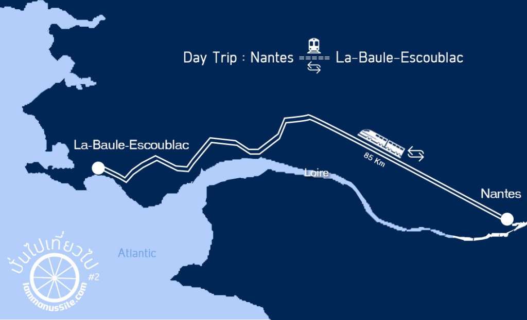 จาก Nantes นั่งรถไฟไปประมาณ 1 ชั่วโมง ตั้งแต่วันที่ 1 มิถุนายน จะเป็นการเริ่มฤดูกาลท่องเที่ยว สามารถนำจักรยานขึ้นรถไฟโดยไม่ต้องเสียค่าใช้จ่าย (แต่ต้องเช็คตารางรถไฟก่อนเดินทาง บางเวลาก็ยังต้องจ่ายค่าตั๋วจักรยาน 1 ยูโร)