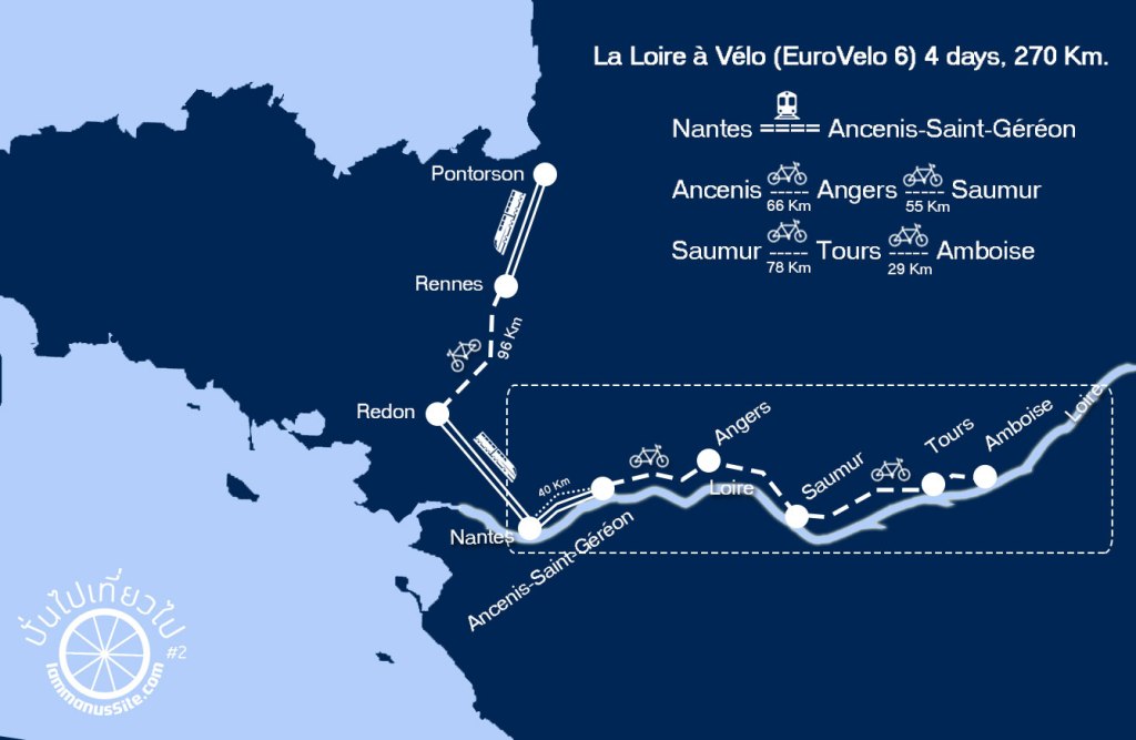 เริ่มทริปเส้นทาง La Loire a Velo (Eurovelo 6) เริ่มจาก Nantes ถึง Tours ระยะทางทั้งหมดประมาณ 220 กิโลเมตร วางทริปไว้ 4 วัน (Nantes-Angers-Saumur-Tours)