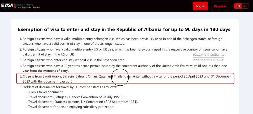 - อัลเบเนียเป็นประเทศในยุโรปที่ต้องมีวีซ่าในการเดินทางเข้าประเทศ แต่มีการยกเว้นวีซ่าให้คนถือพาสปอร์ตไทยเข้าประเทศได้ถึงสิ้นปี คศ. 2023 (ตรวจสอบรายละเอียดที่ e-visa.al)