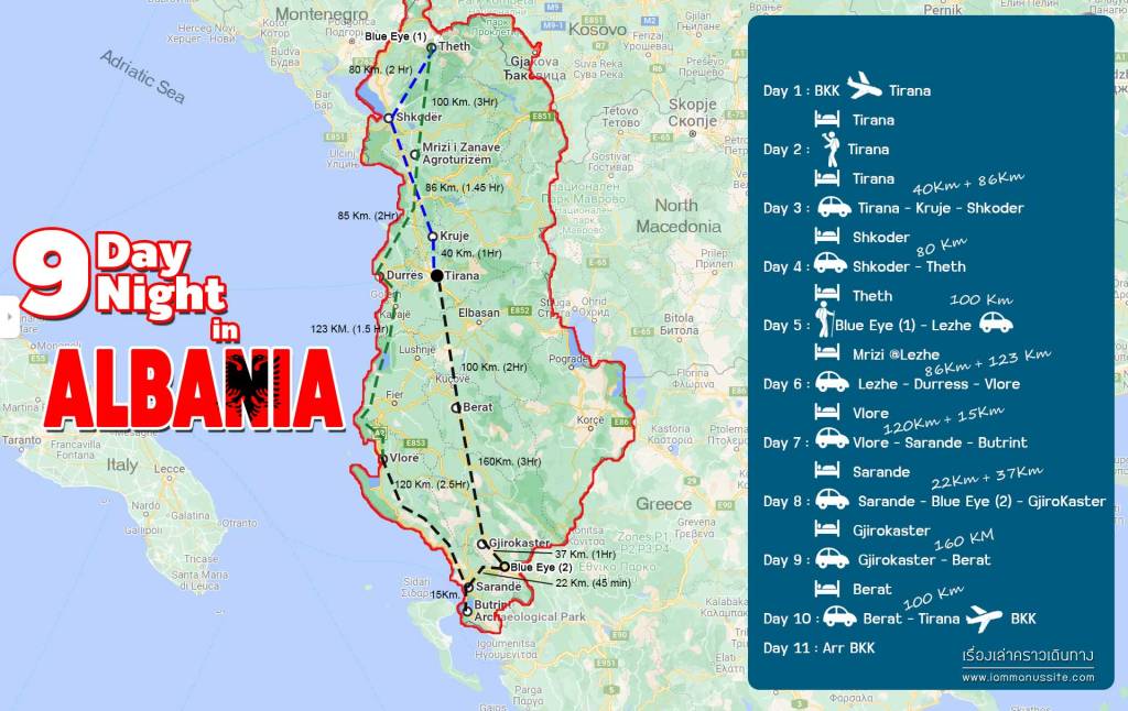 ขนาดพื้นที่ประเทศแอลเบเนียมีแค่ 28,748 ตร.กม. เล็กกว่าภาคตะวันออกของไทยเสียอีก จากเหนือสุดมาใต้สุดแค่ 500 กม. ขับรถ 1 วันเต็มๆก็ถึงแล้ว แต่เราวางแผนเที่ยวไว้ 9 วัน ตั้งต้นที่เมืองหลวง ติรานา (Tirana) แล้วเช่ารถขับไปเที่ยวเมืองครูจา (Kruja) ขึ้นเหนือต่อไป ชโกด้า (Shkoder), เธท (Theth) แล้ววนกลับลงมาขับรถเลียบทะเลตามเส้นทาง Albania Riviera จาก ดูเรส (Durres), วโลรา (Vlore), ซารานด้า (Sarande) แล้วขับต่อไปทางทิศตะวันออกที่เมืองน่ารัก จิโรคาสเตอร์ (Gjirokaster) กับ เบรัต (Berat) แล้ววนกลับขึ้นไปติรานานั่งเครื่องกลับบ้าน เที่ยวเป็นวงรอบแบบนี้ในเวลา 9 วัน 9 คืน ย้ายที่นอนไปเรื่อยๆ ไปแบบไม่รีบร้อน มีเวลาเที่ยวชมเมือง ชมปราสาท ป้อมปราการ เดินเล่น นั่งเล่น และจิบกาแฟ จิบเบียร์ จิบไวน์
