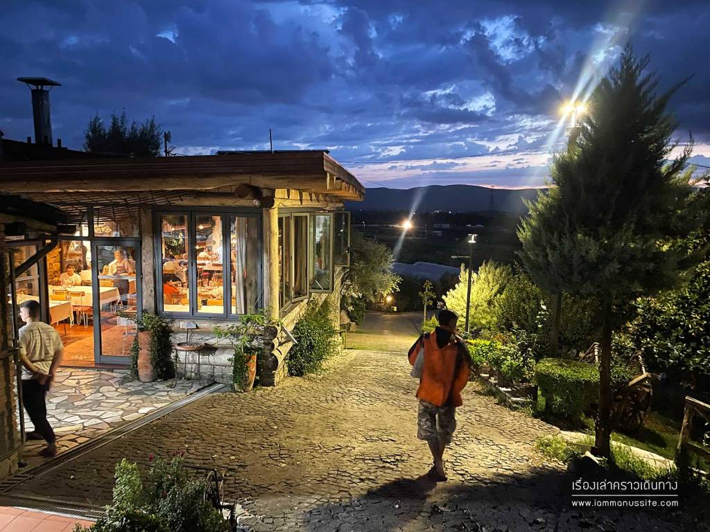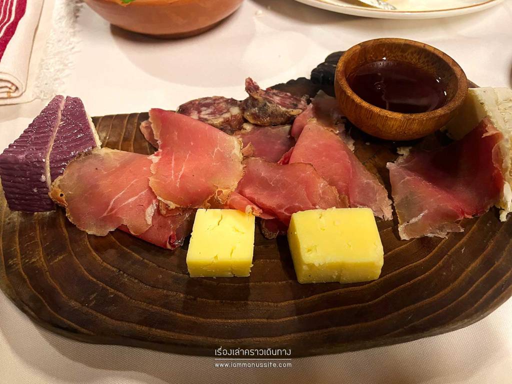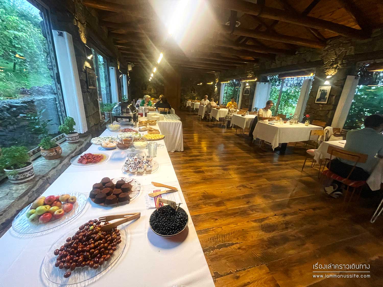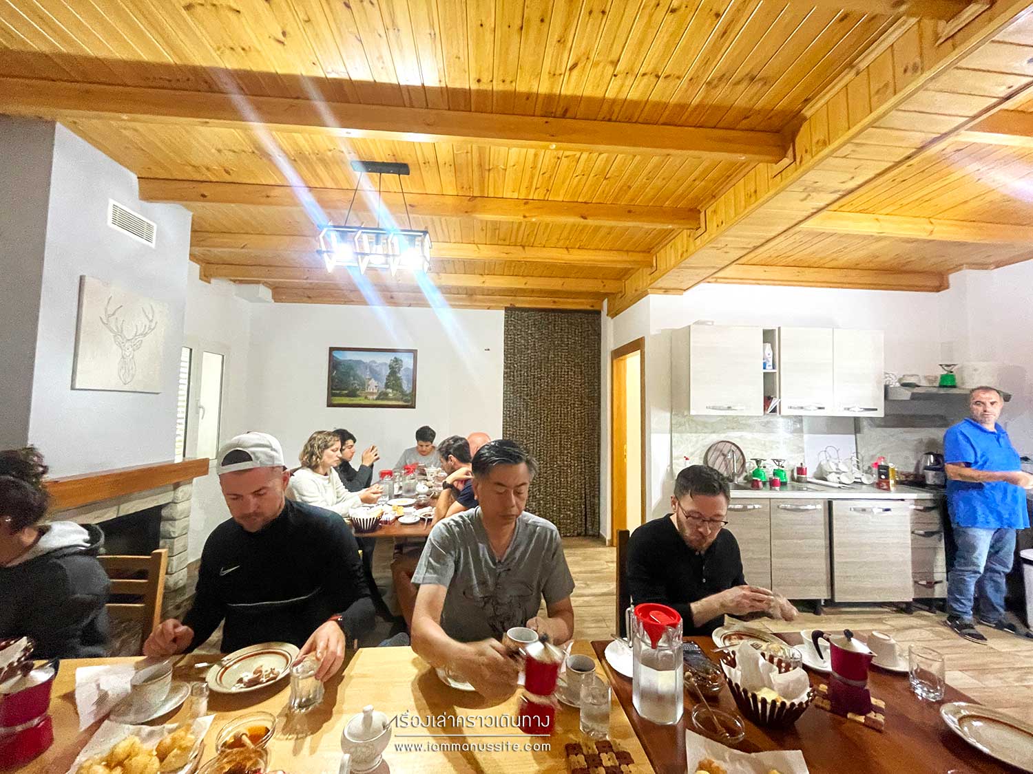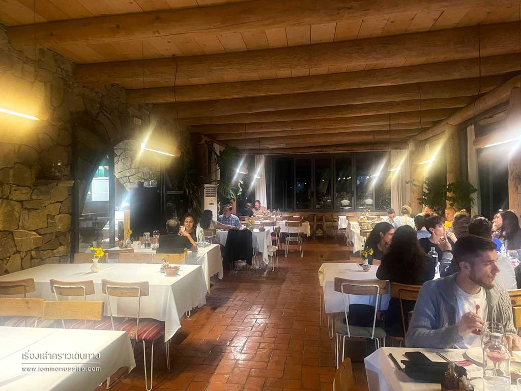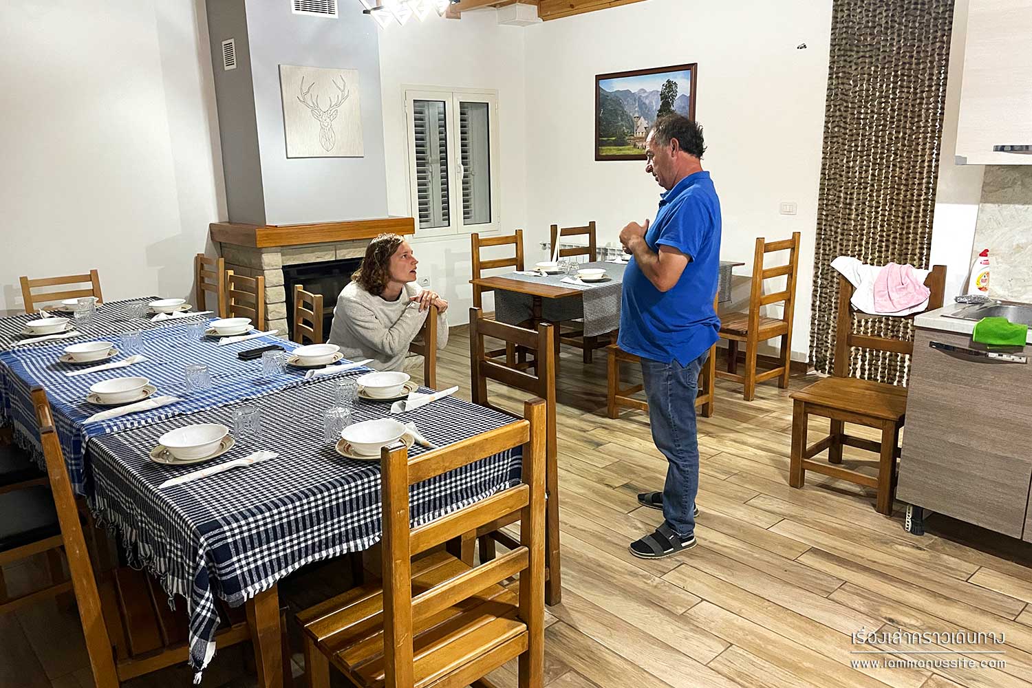 ห้องอาหารเดินลงเนินจากอาคารที่พักมานิดเดียว ต้องจองโต๊ะล่วงหน้า เพราะคนนอกเข้ามาทานกันเยอะ มักจะเต็ม อาหารมีแบบ Full course แต่เราเลือกได้ว่าจะเอาอะไรบ้าง พนักงานจะเดินมาอธิบายยาวเหยียด ว่าวันนี้มีอะไรบ้าง พนักงานดีมากบอกเราว่าให้เอาแค่ Appetizers กับ Starter ก่อน ถ้าไม่อิ่มค่อยเพิ่ม Main course ซึ่งก็จริง อิ่มมาก มื้อนี้แพงที่สุดในทริปเช่นกัน (ประมาณ 4000 Lek)